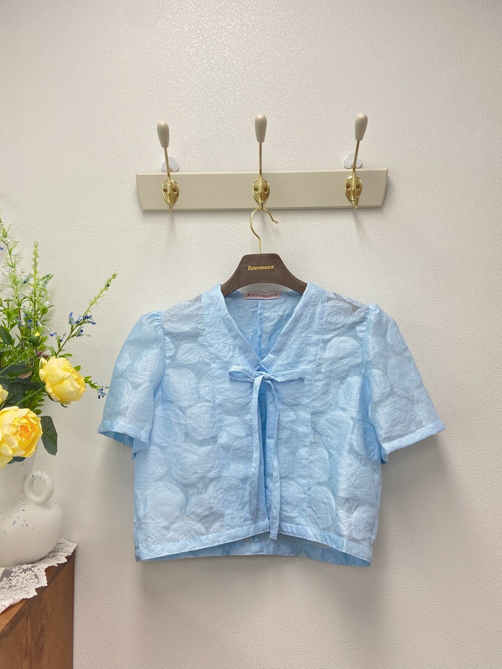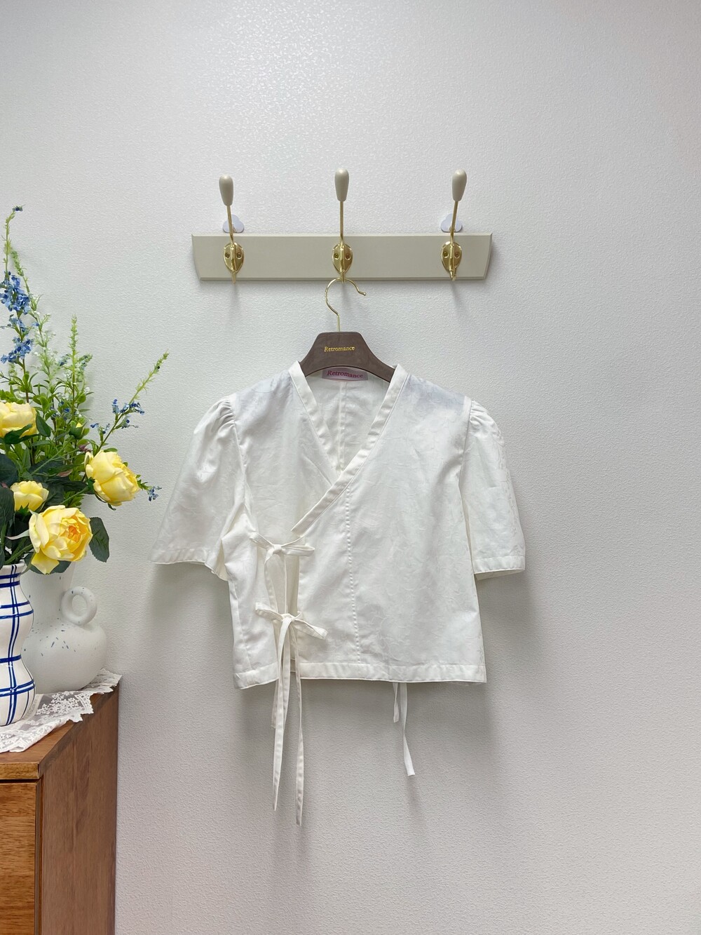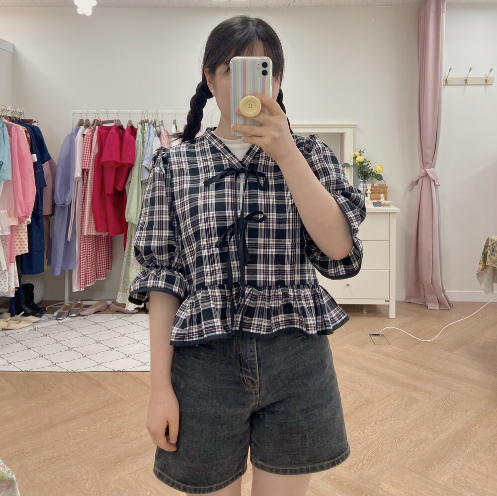 상의에 섬세한 프릴디테일과 벨벳 리본으로 포인트를 주었으며