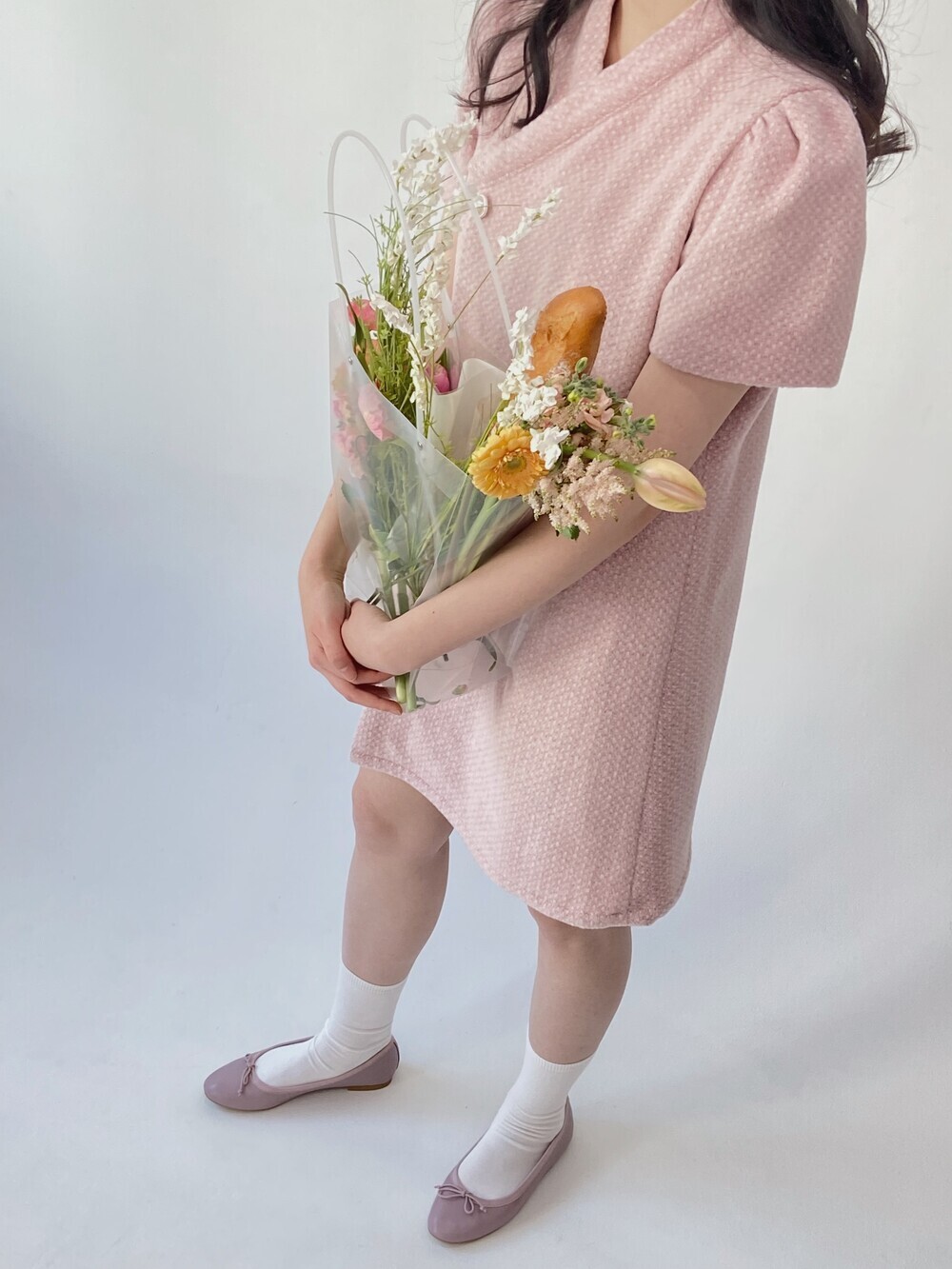 울 원단으로 제작 된 연한 핑크빛의 미니 원피스입니다.