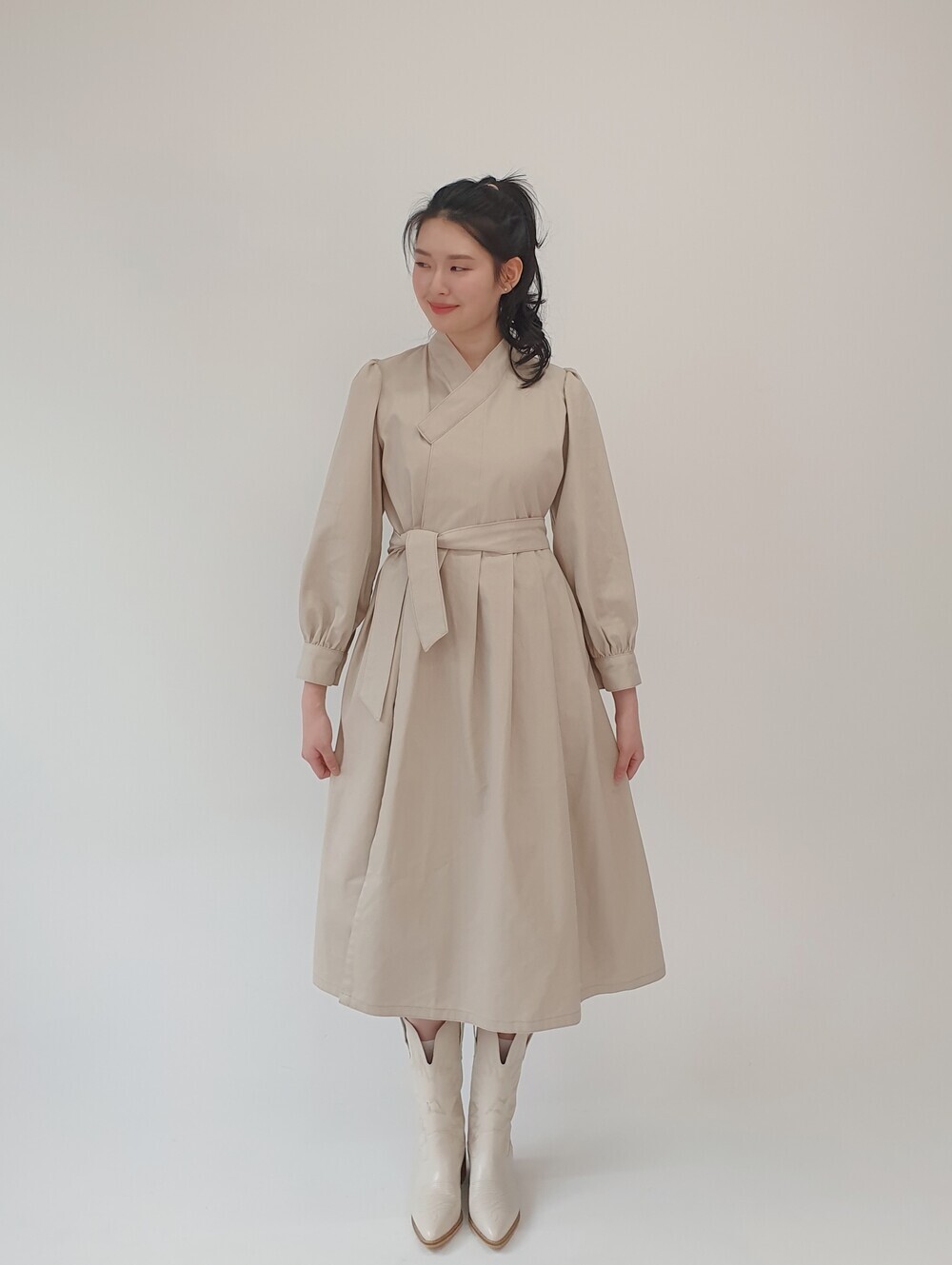 트렌치 코트 무드의 철릭원피스입니다. 스냅단추와 허리끈으로 여미는 방식이며,
