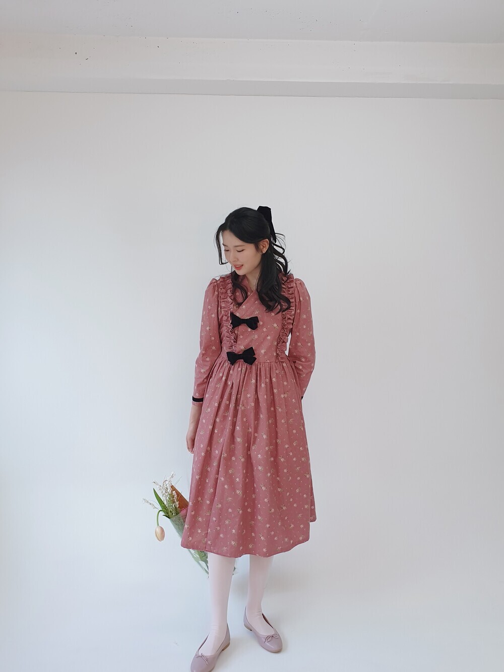 빈티지한 색감과 패턴의 원단으로 제작 된 벨벳 리본 원피스입니다.