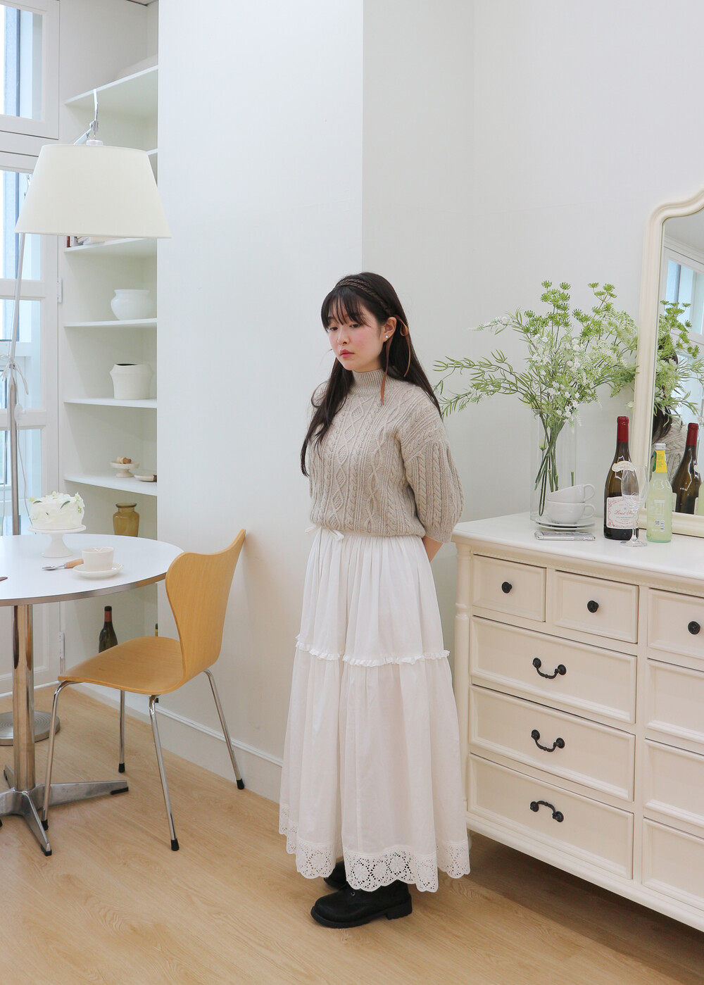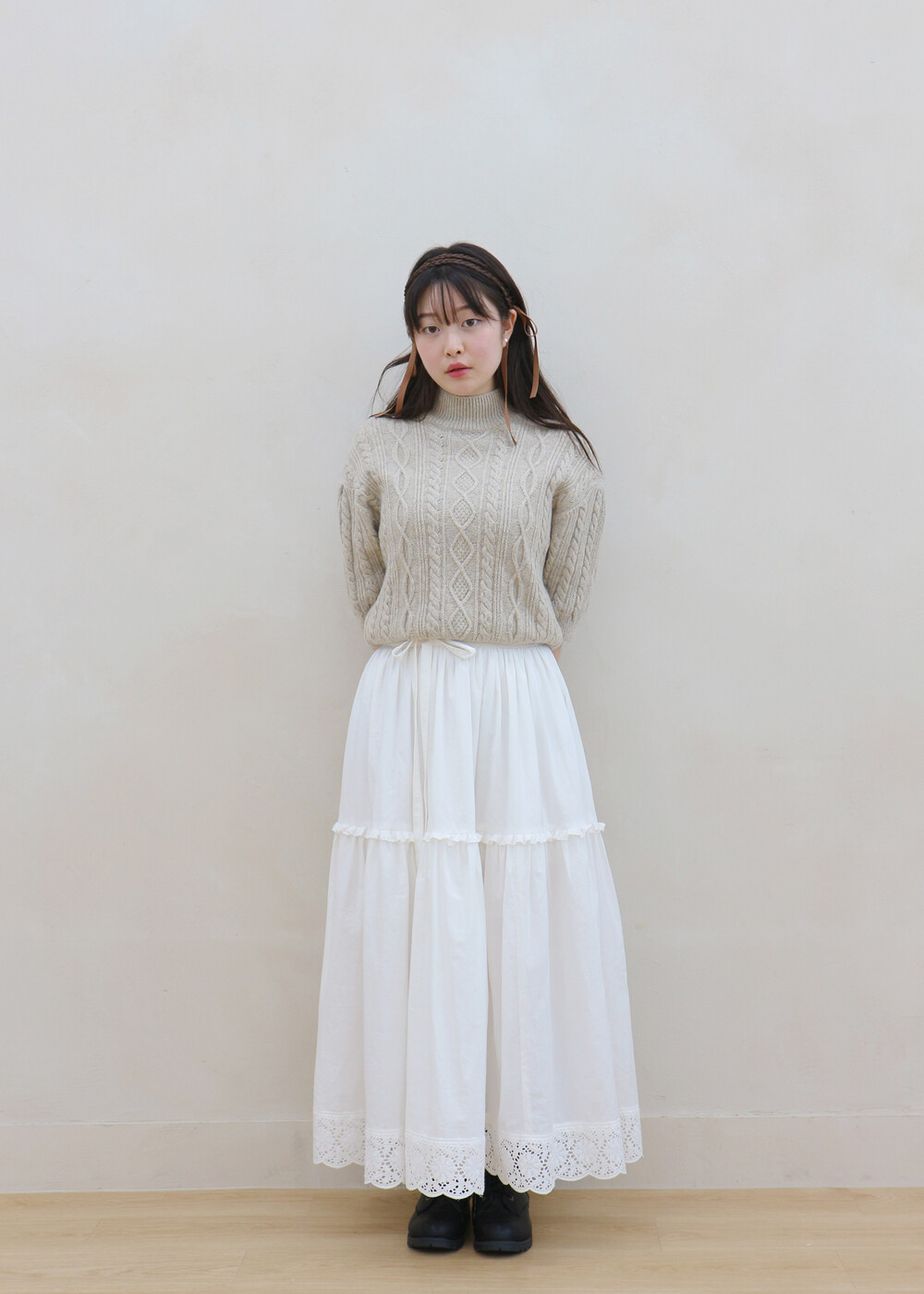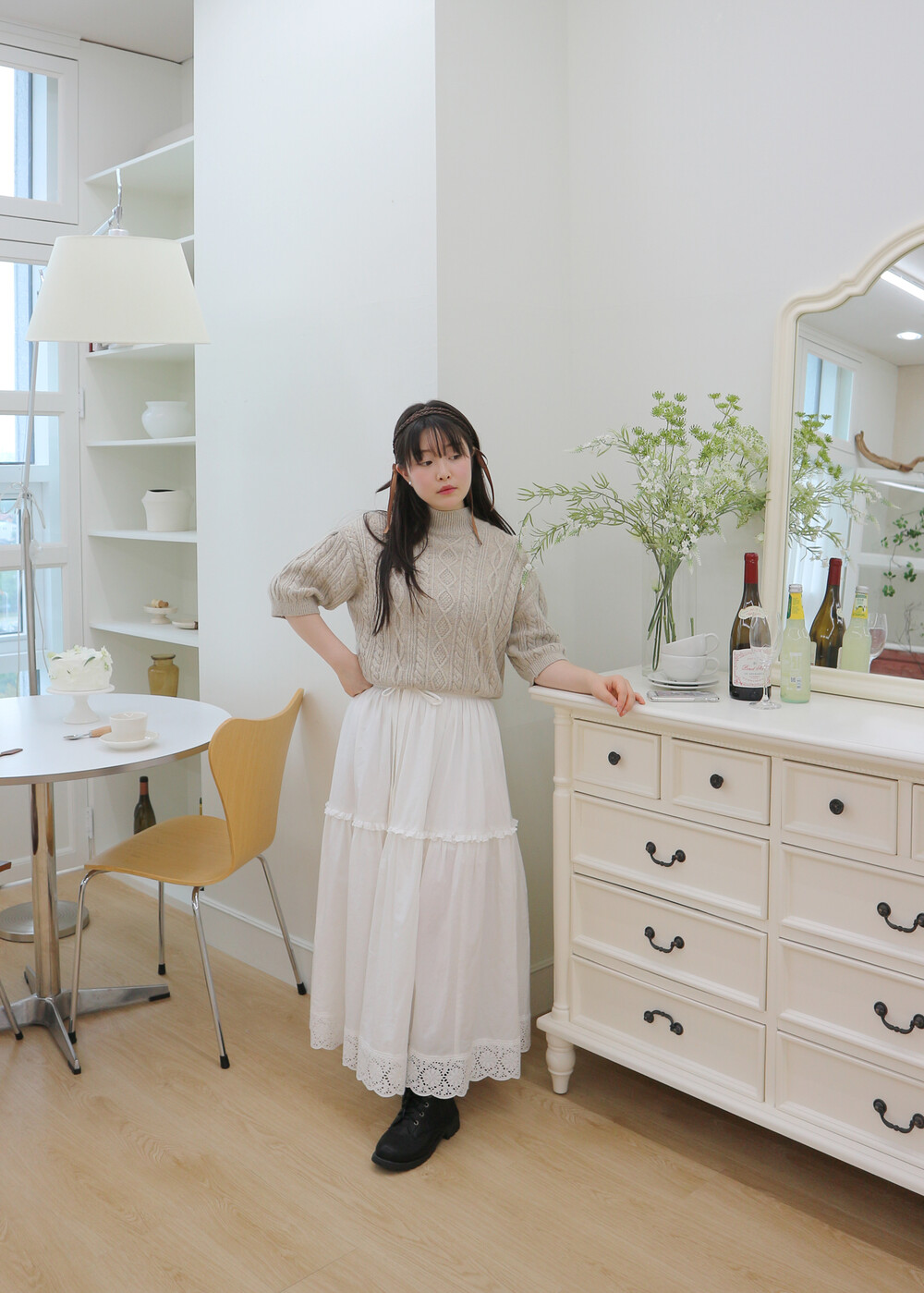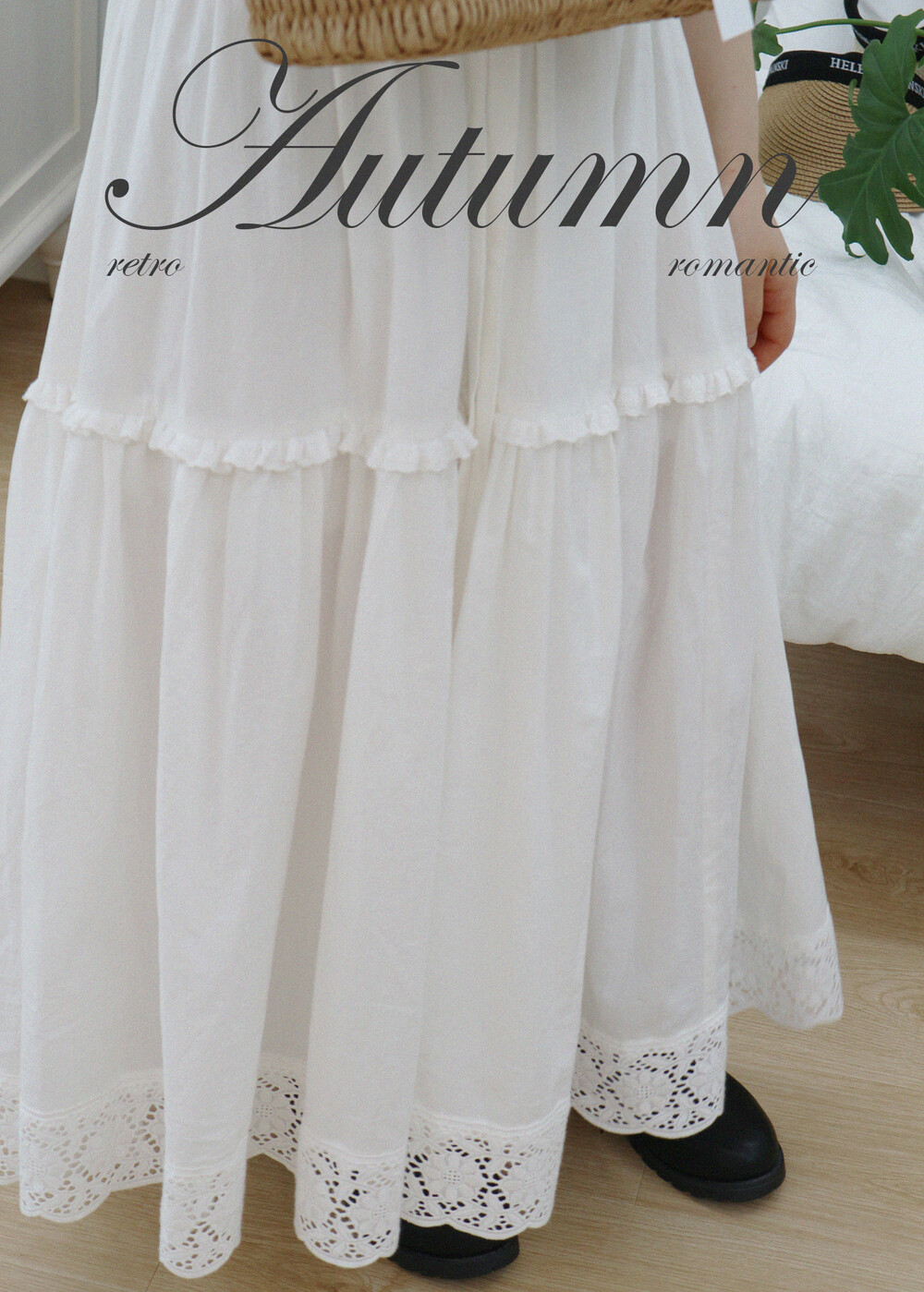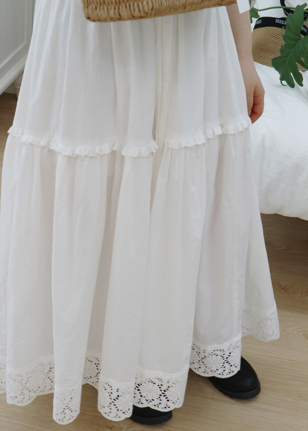 프릴레이스를 중간에 달아주어 포인트를 주었습니다. 치마는