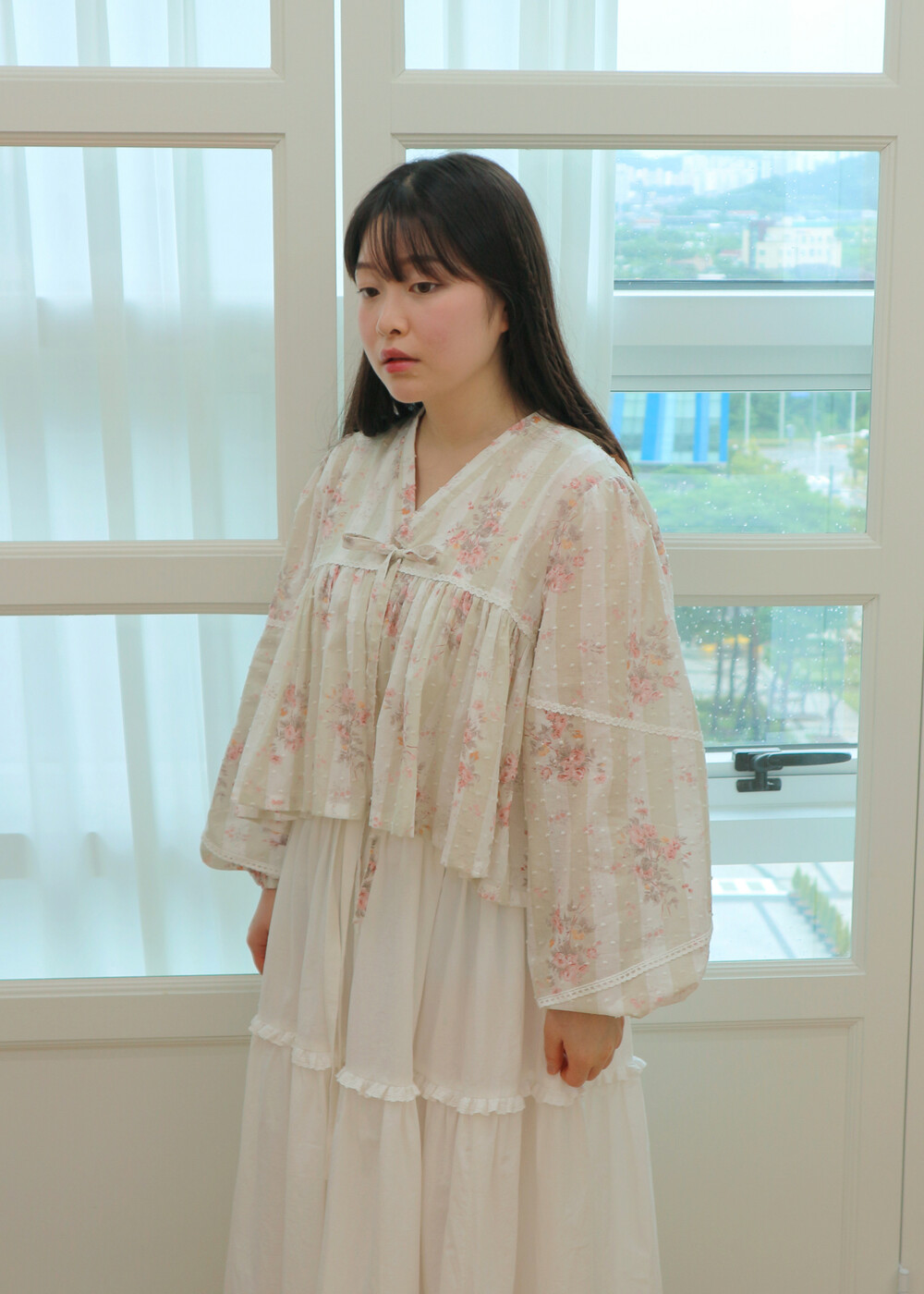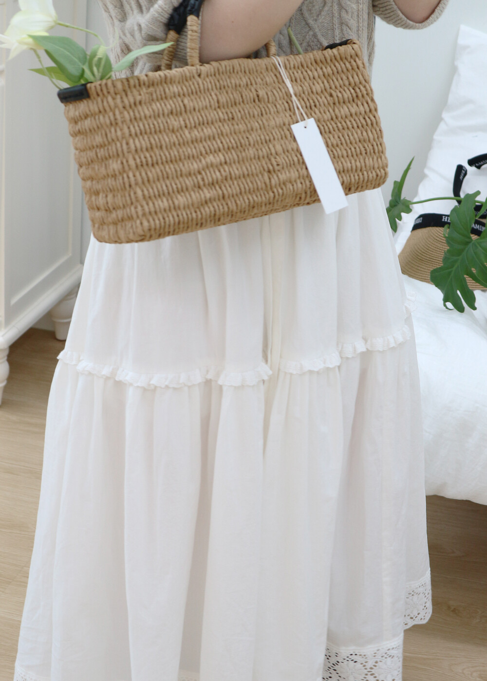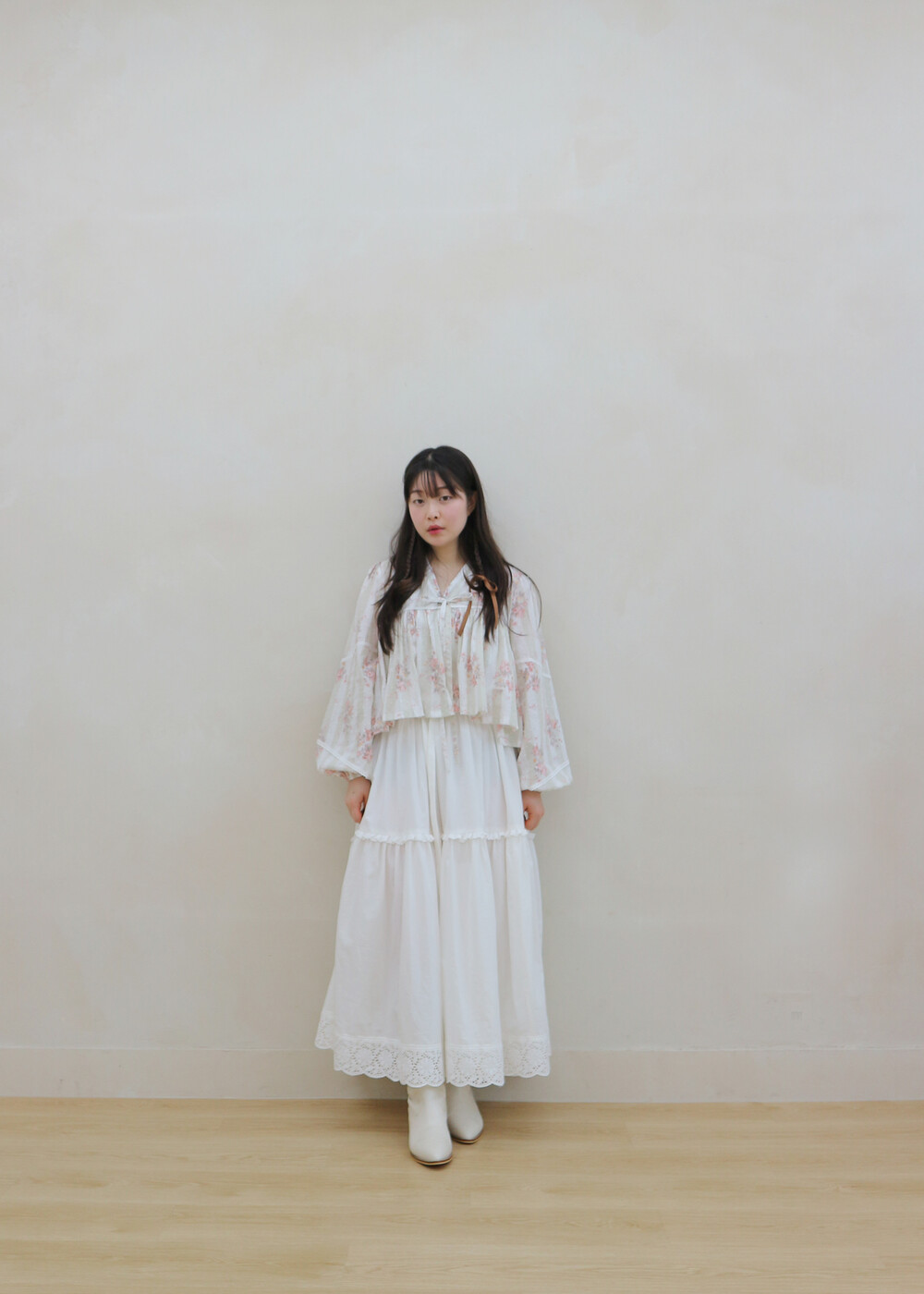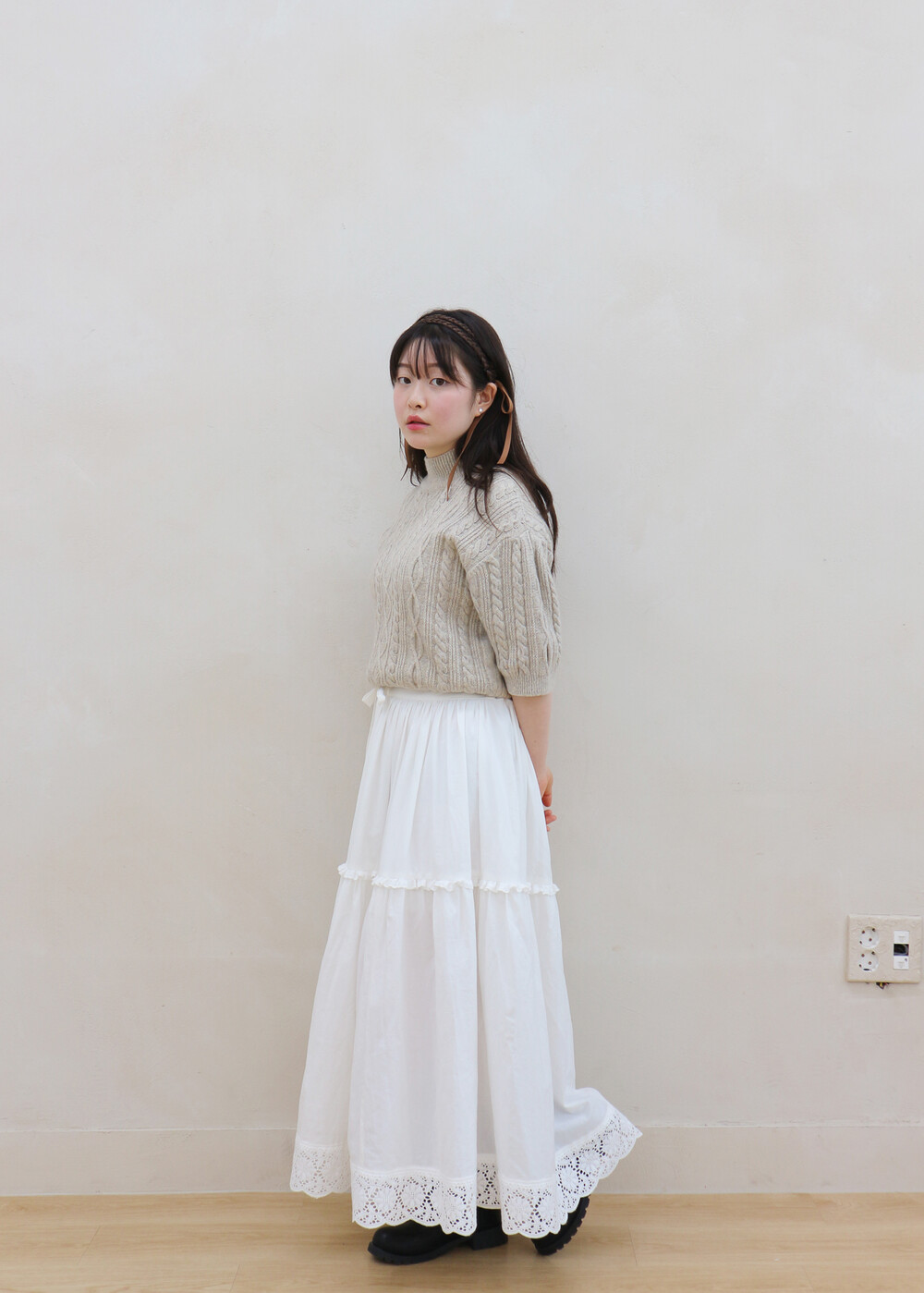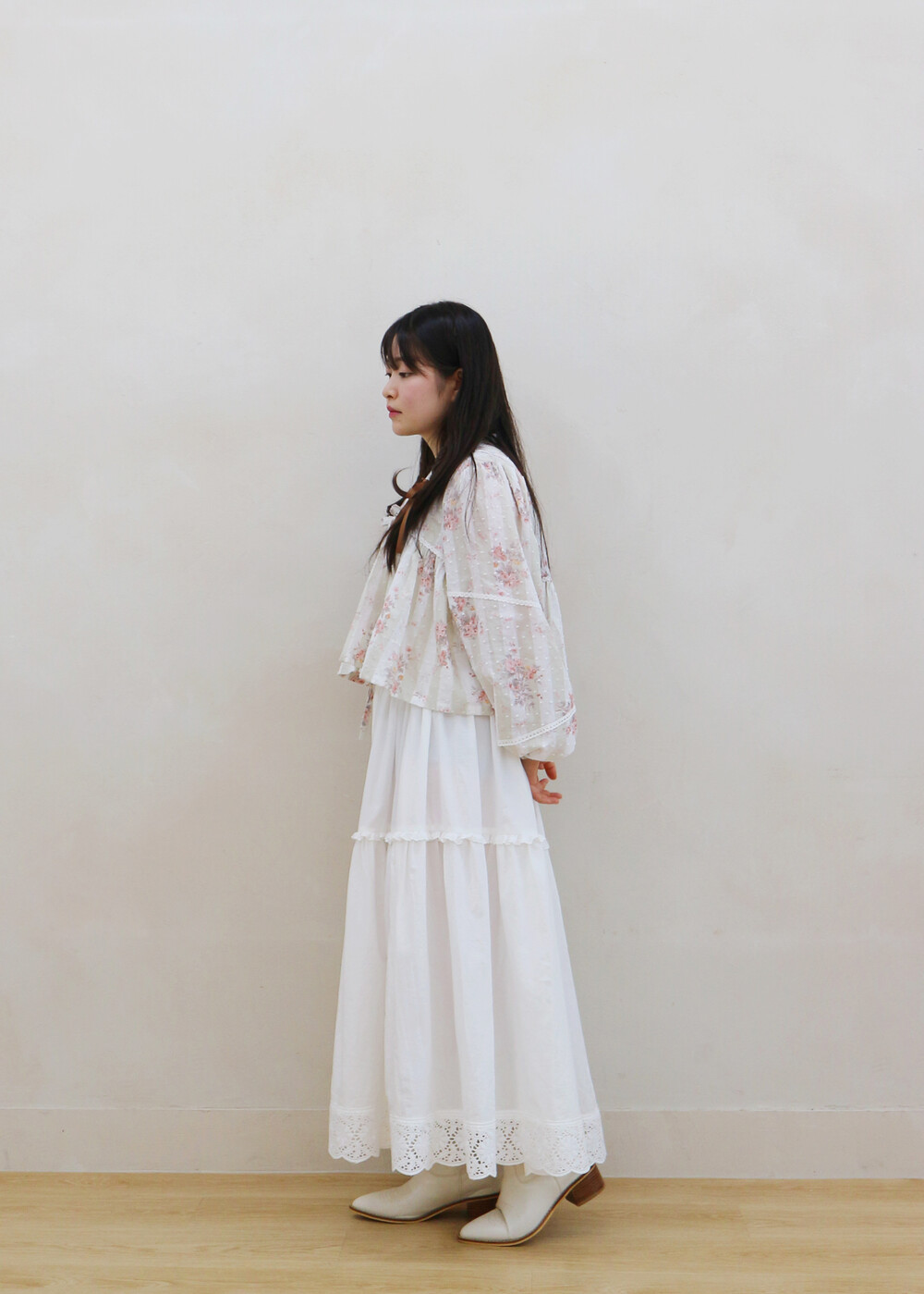프릴레이스를 중간에 달아주어 포인트를 주었습니다. 치마는