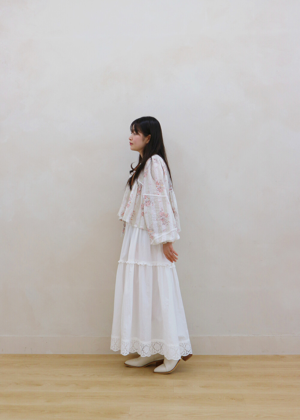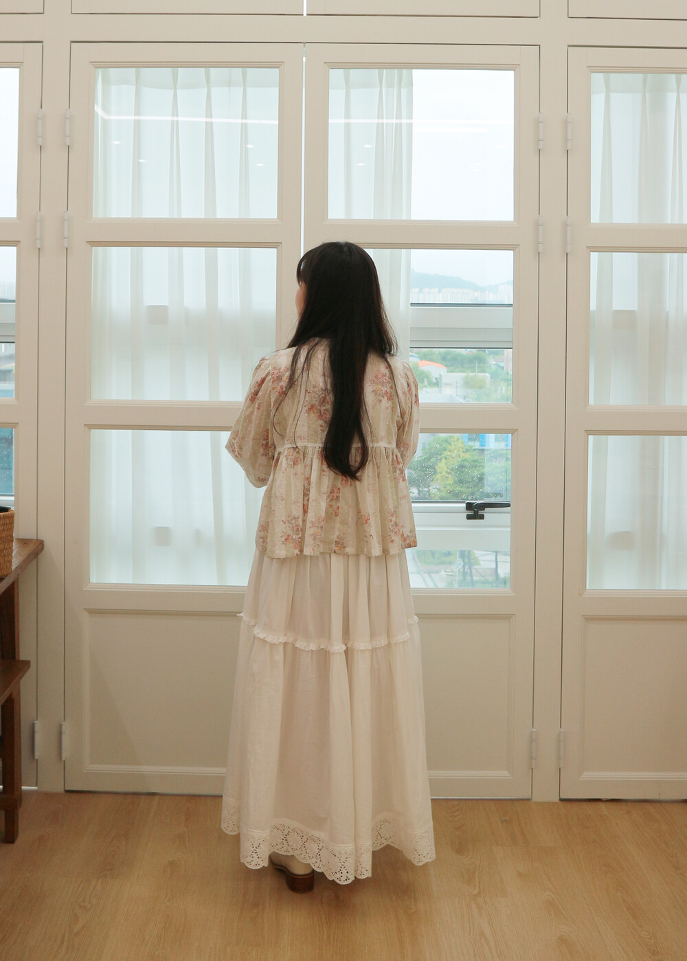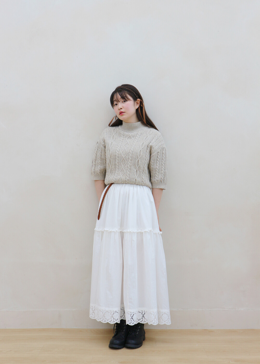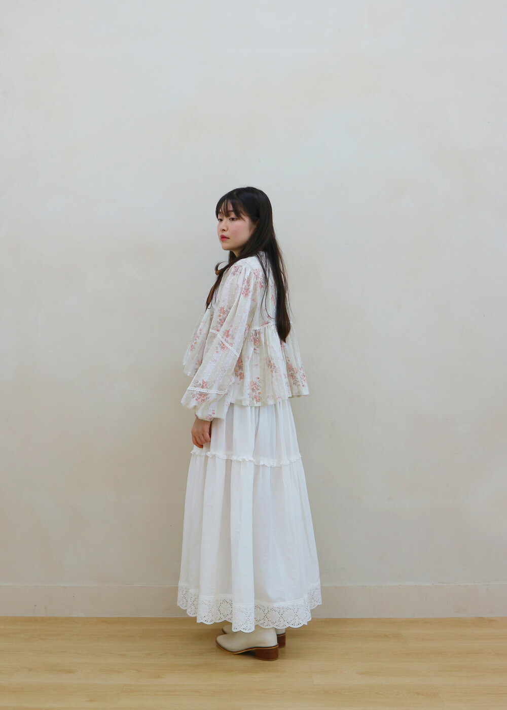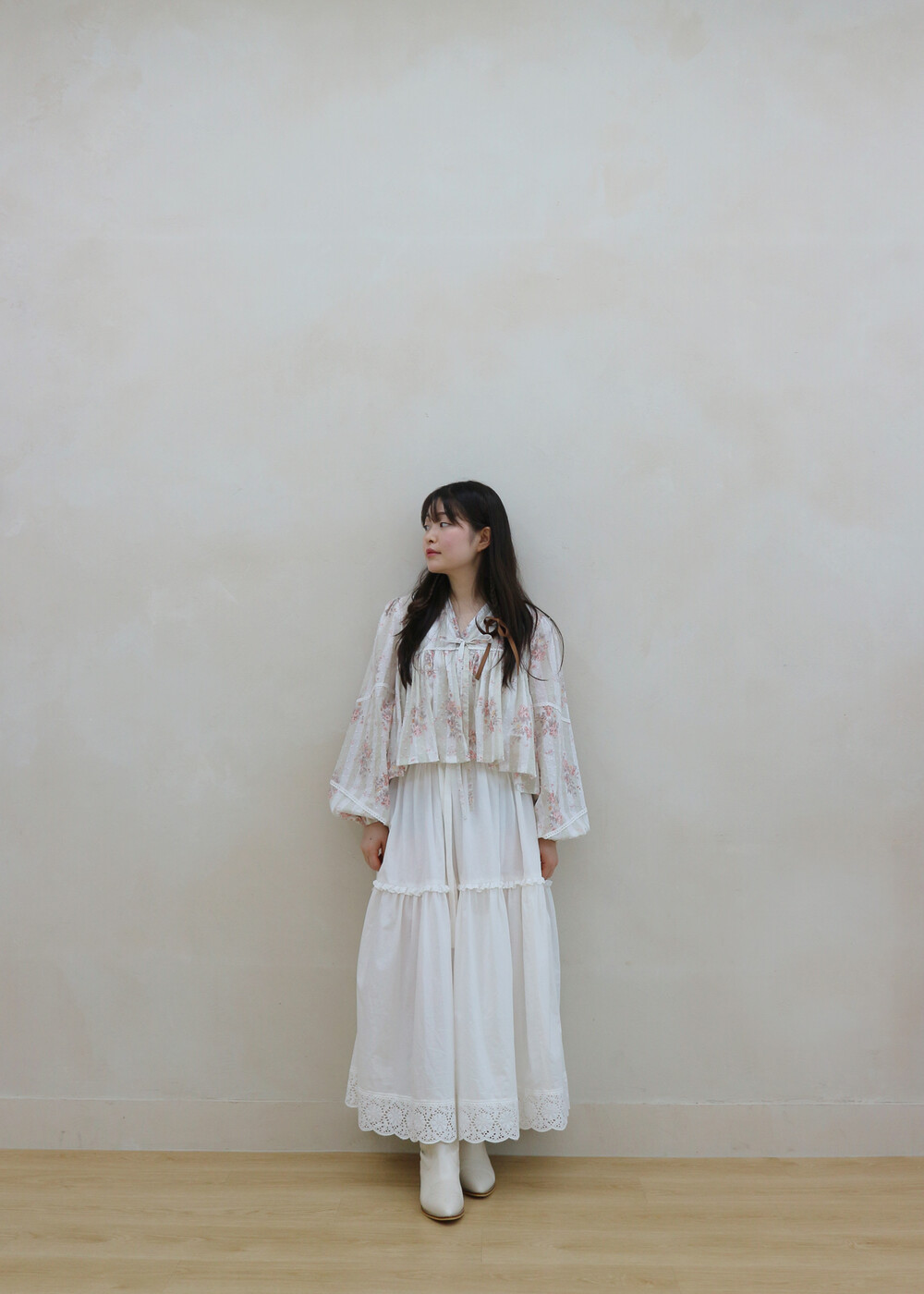 프릴레이스를 중간에 달아주어 포인트를 주었습니다. 치마는