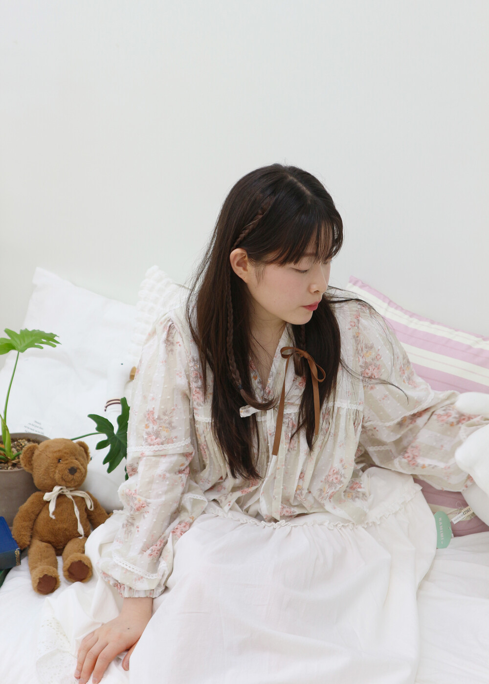 리본을 묶어 연출이 가능합니다. 꽃모양의 자수로 된 레이스와