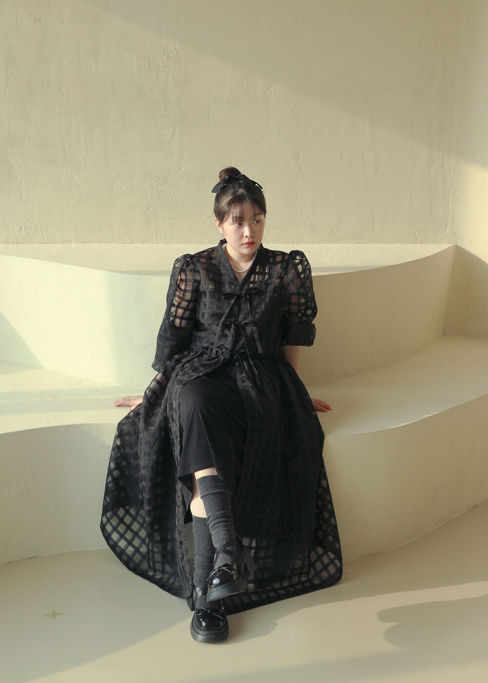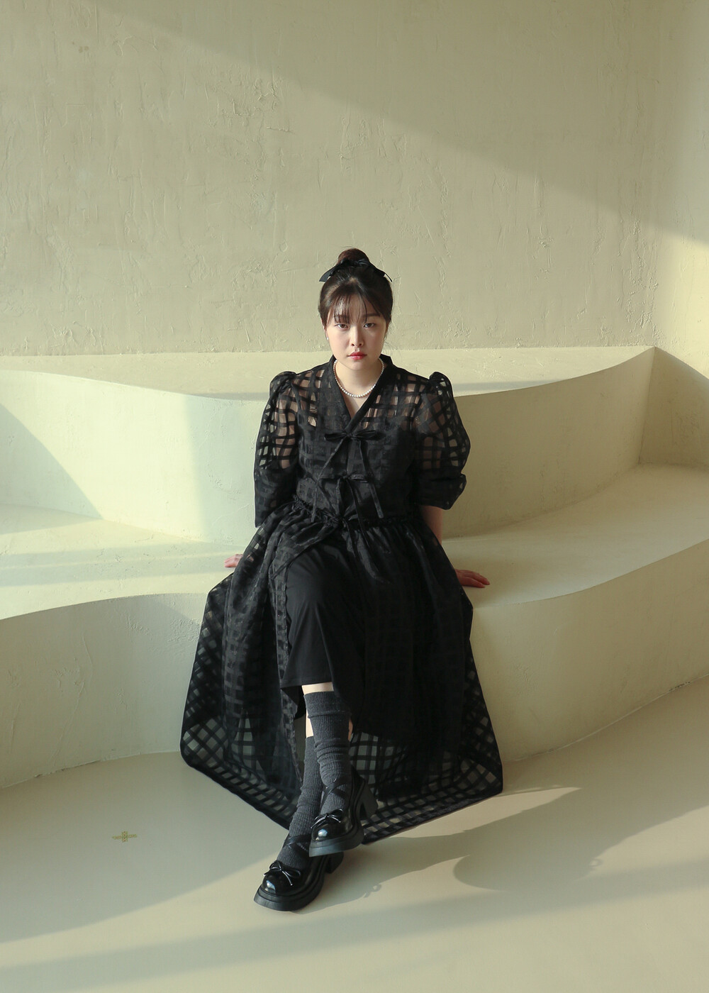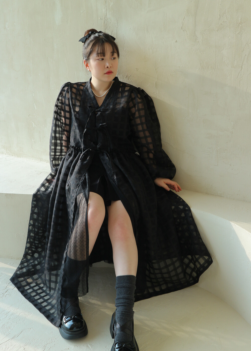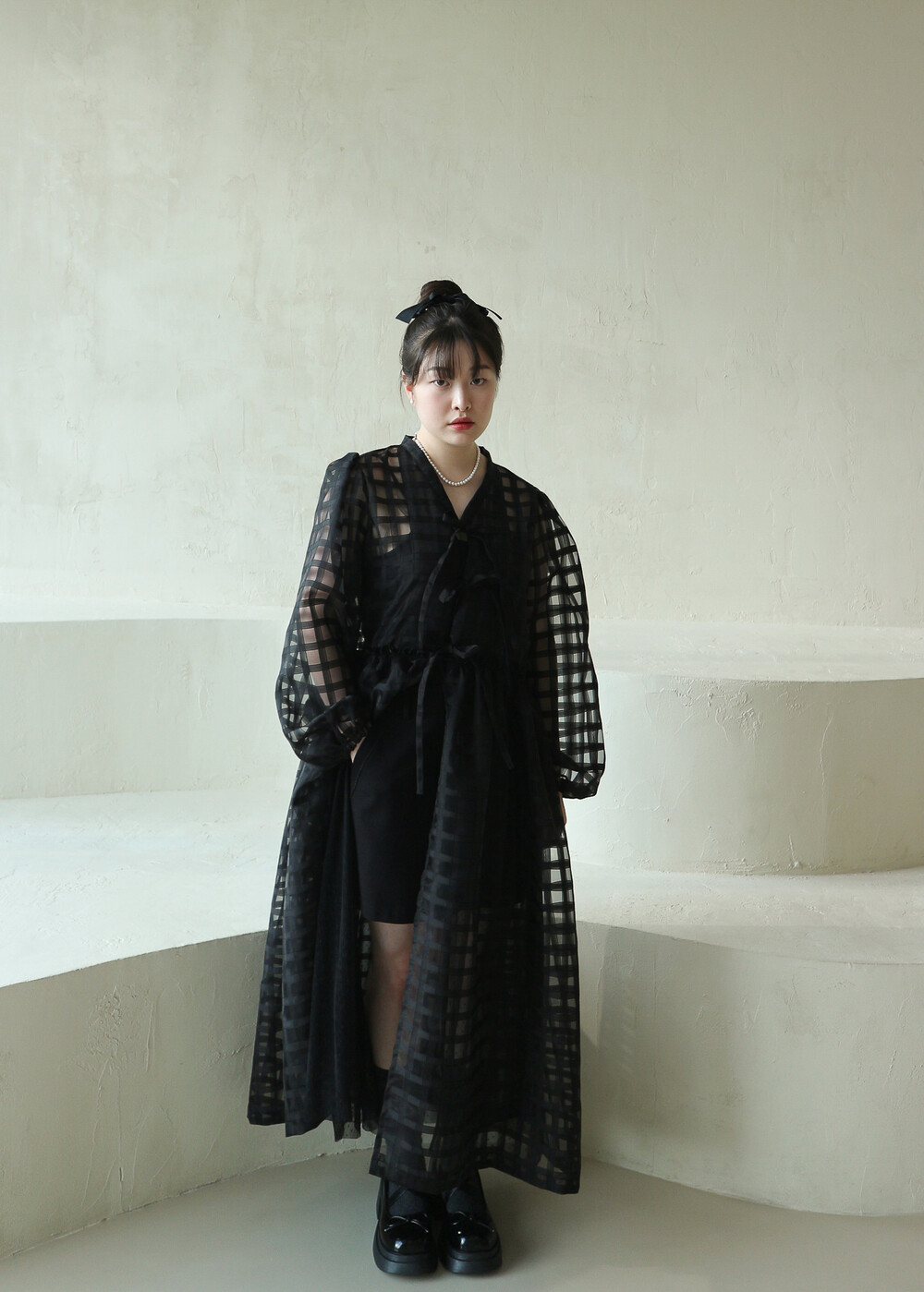 고급스러운 체크 패턴의 시스루 원단으로 제작되었으며,