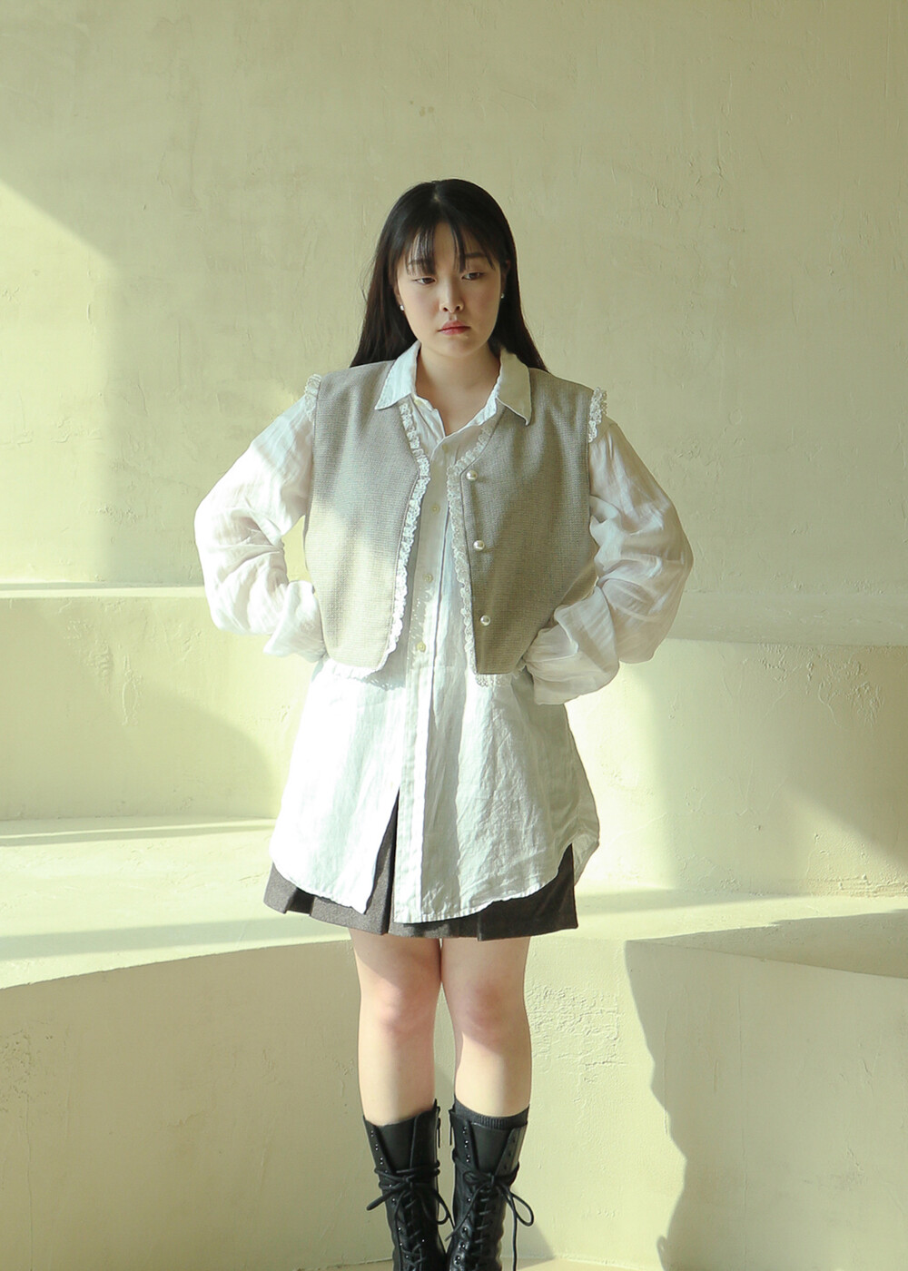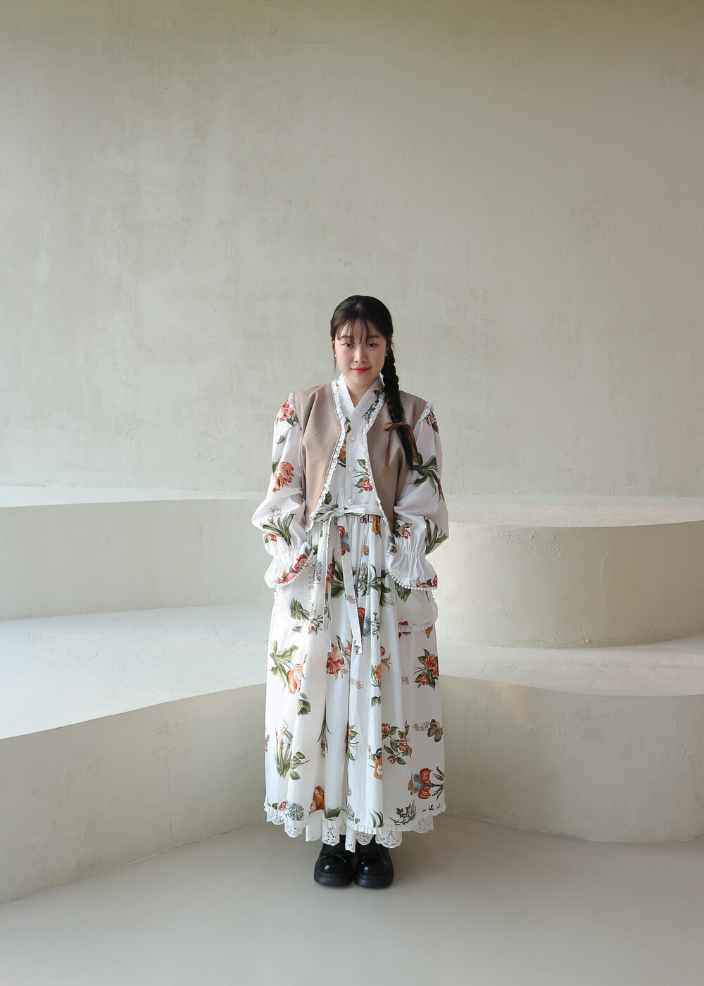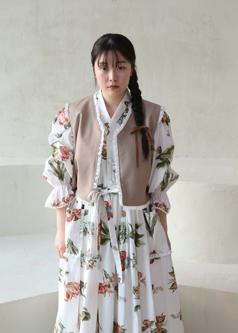 매니시한 느낌의 배자에 사랑스러운 포인트를 주었습니다.
