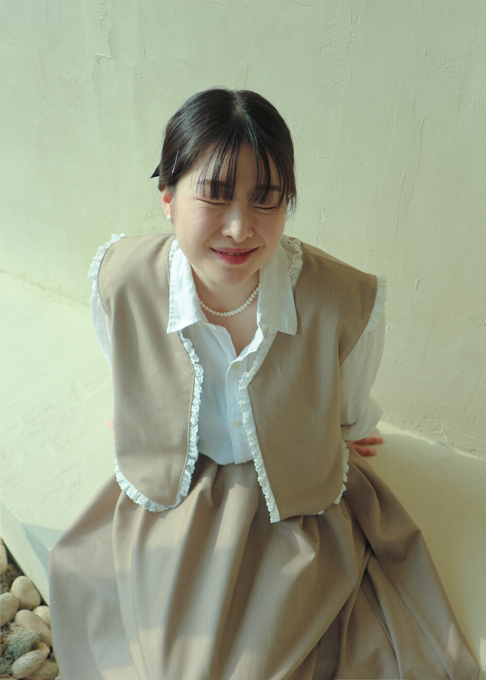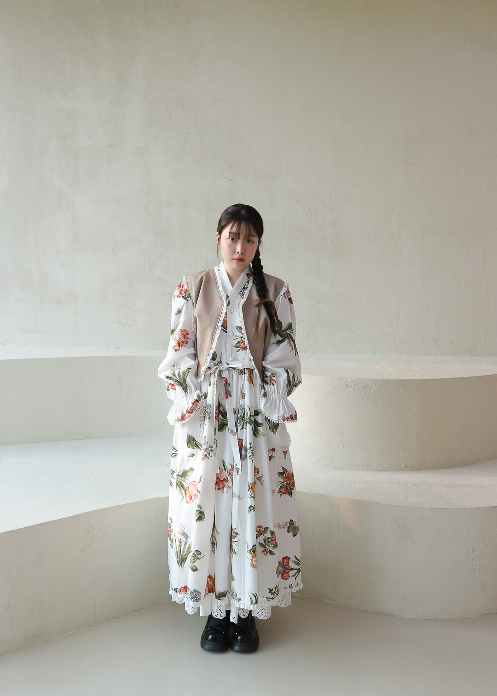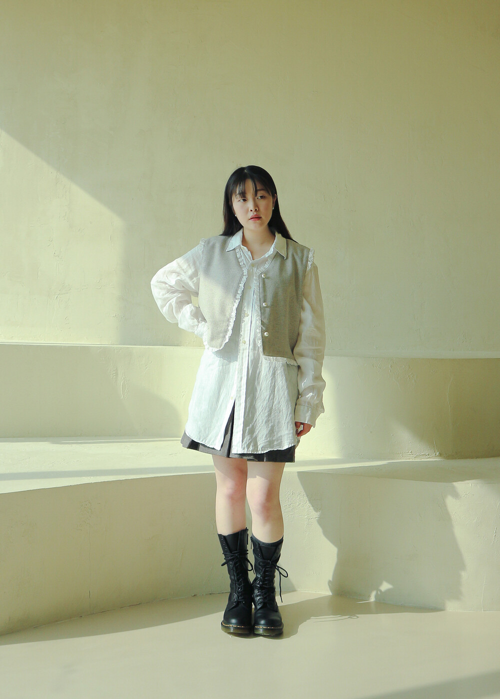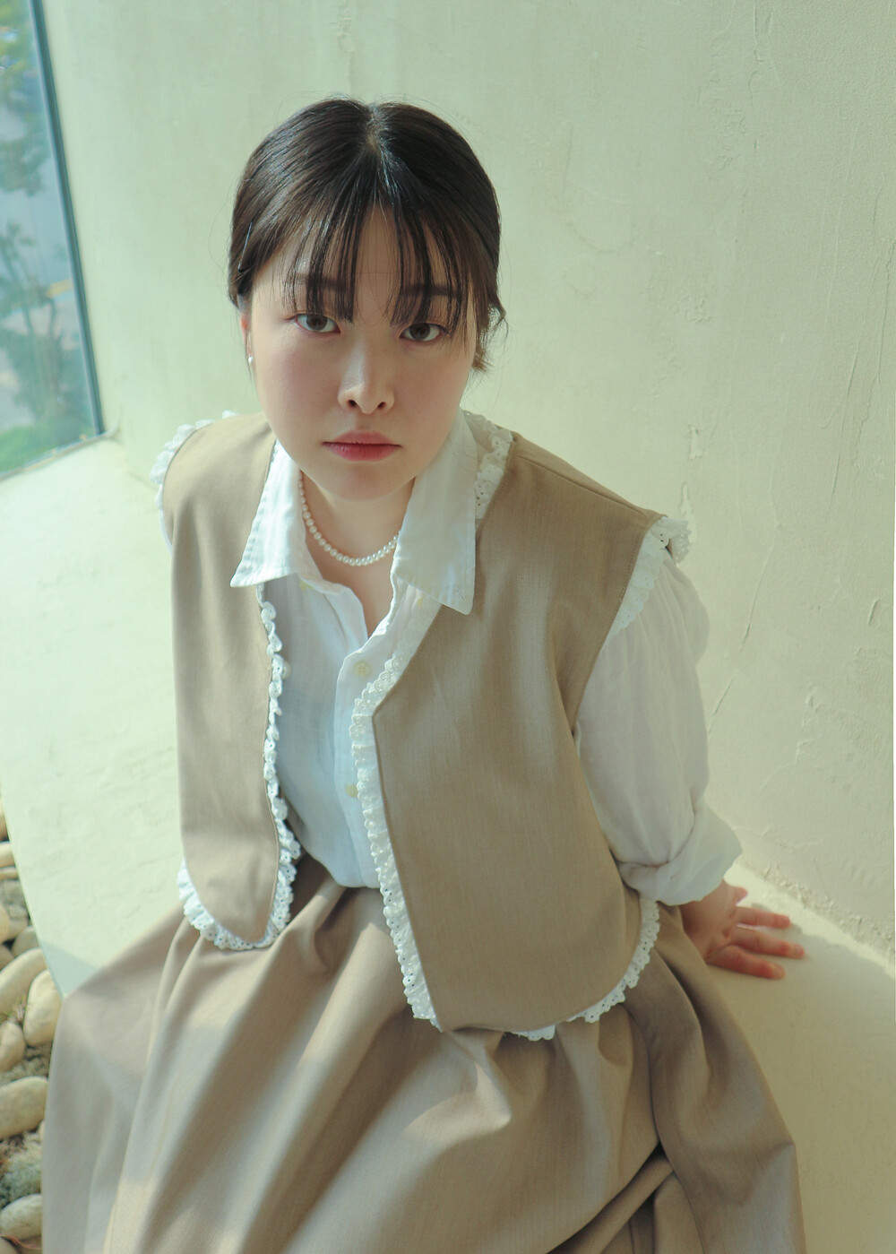 매니시한 느낌의 배자에 사랑스러운 포인트를 주었습니다.