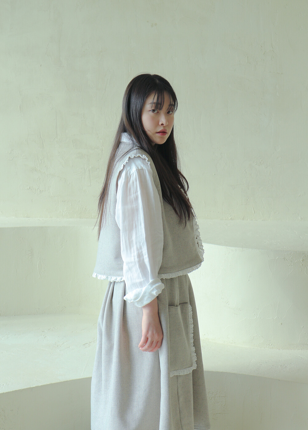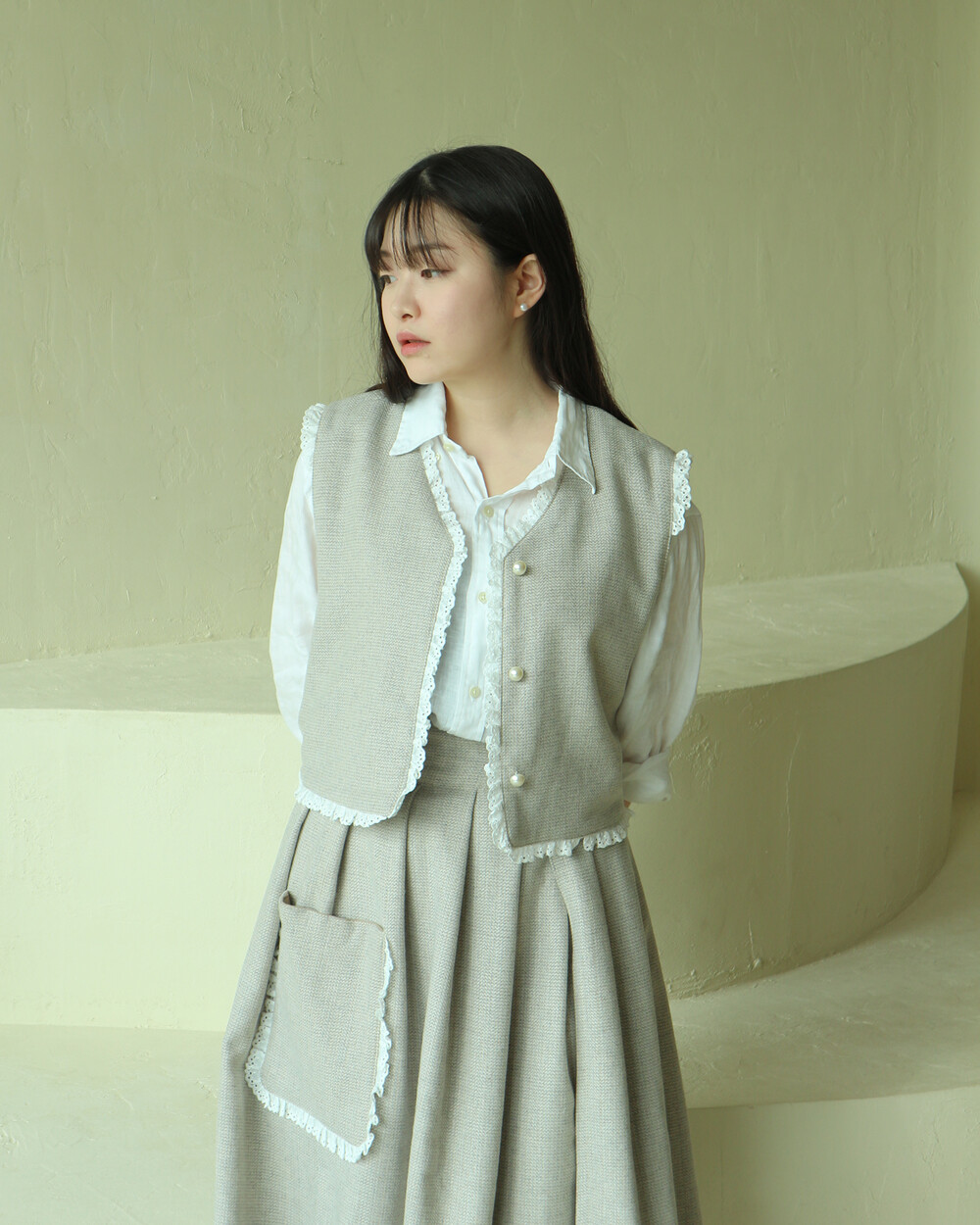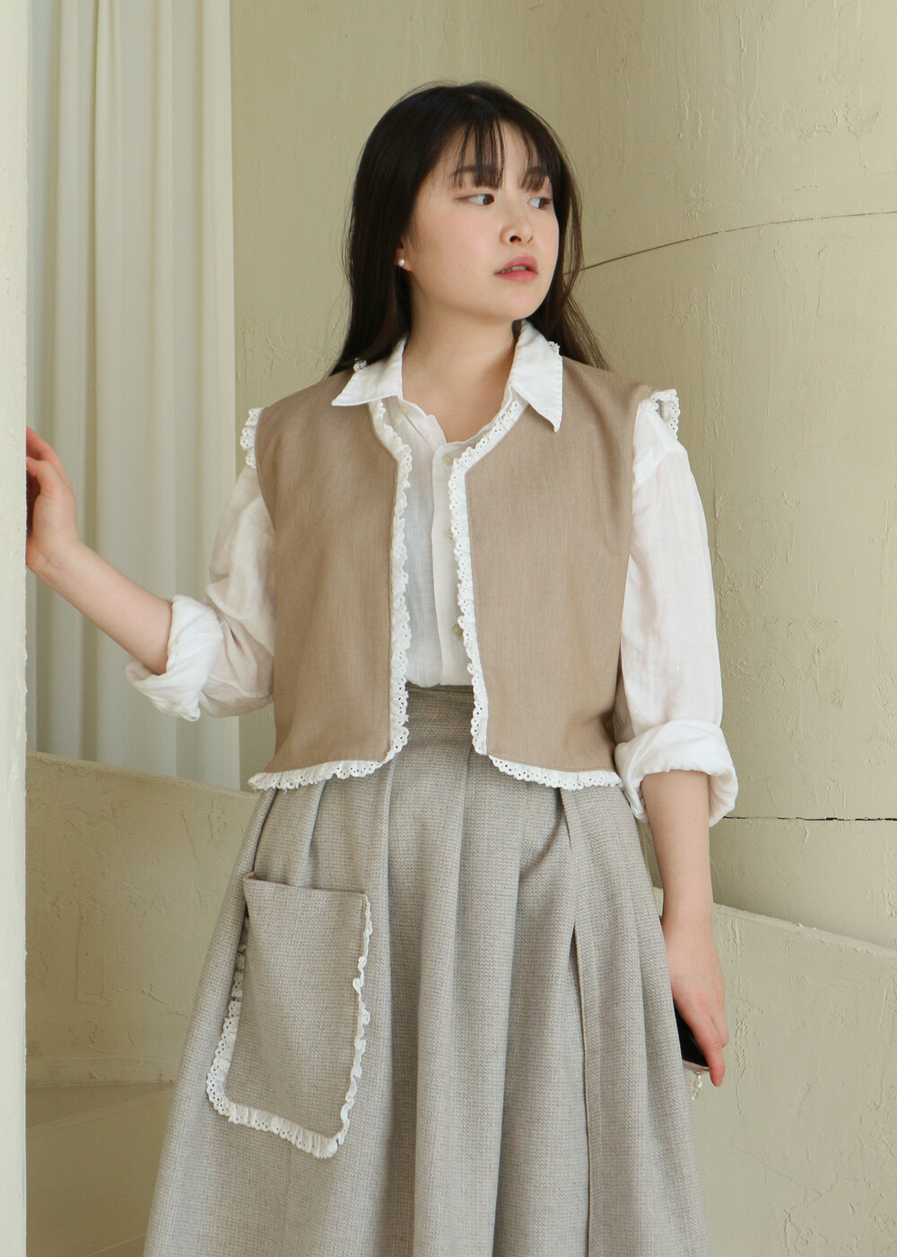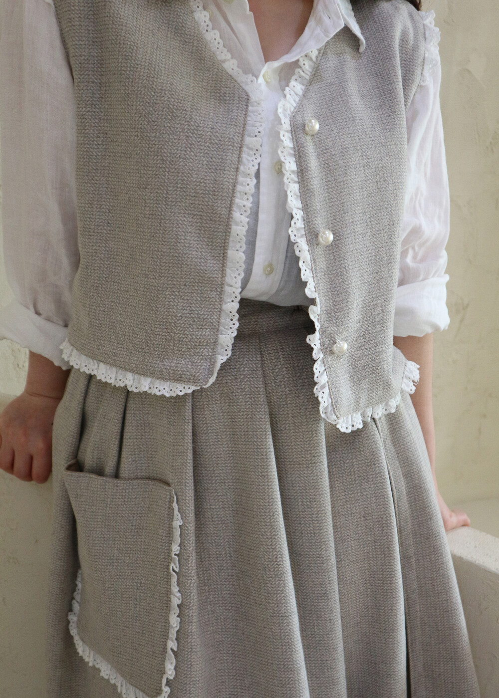 레이스로 테두리를 장식한 넓은 주머니가 달려있습니다.