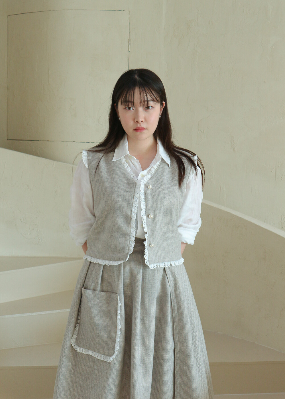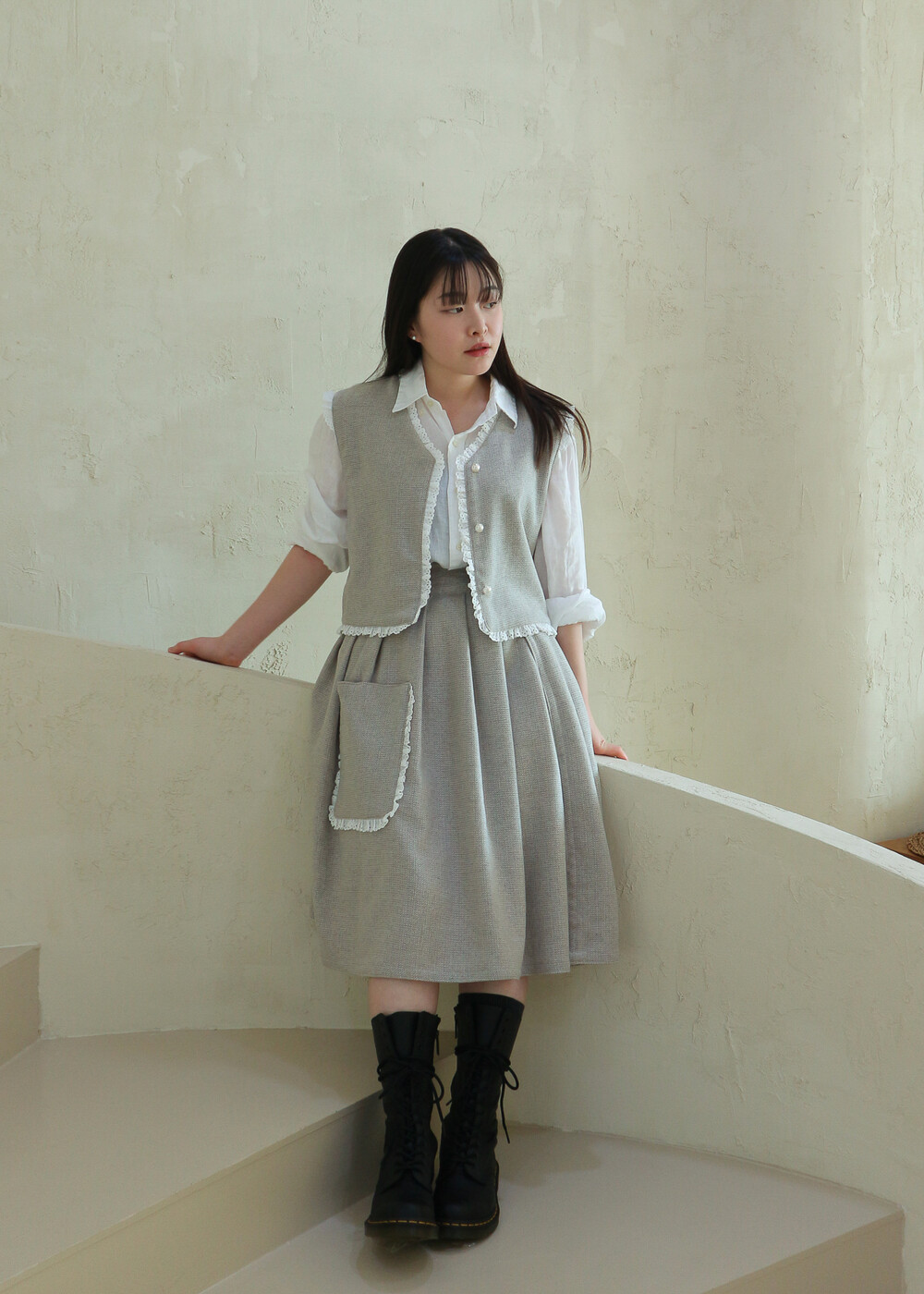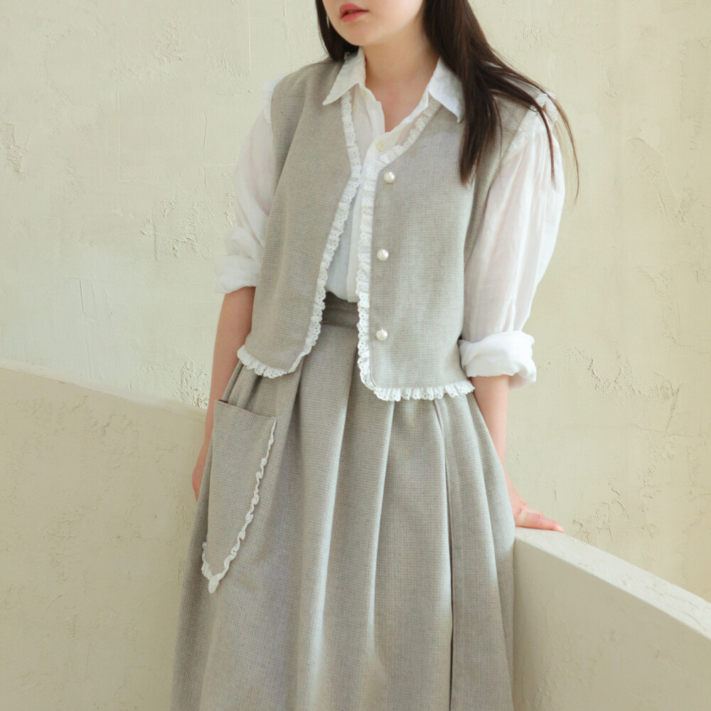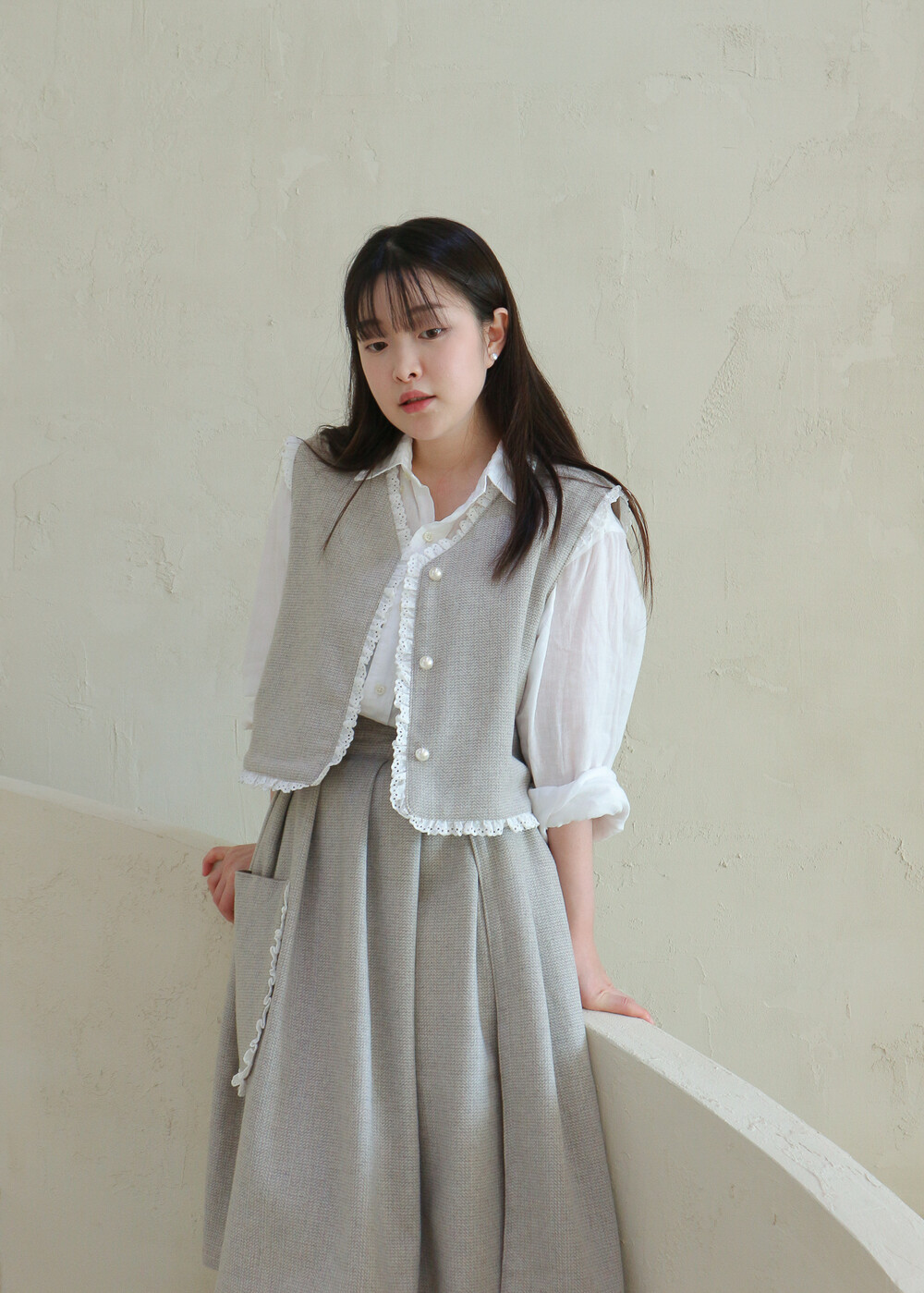 레이스로 테두리를 장식한 넓은 주머니가 달려있습니다.