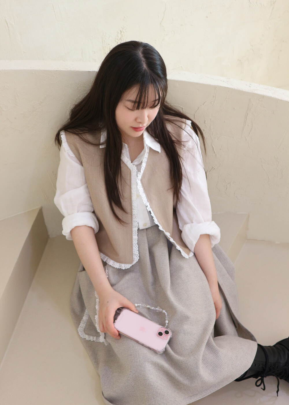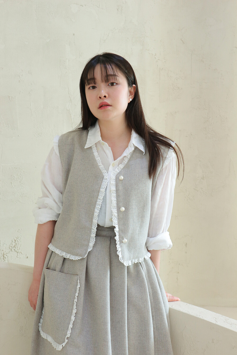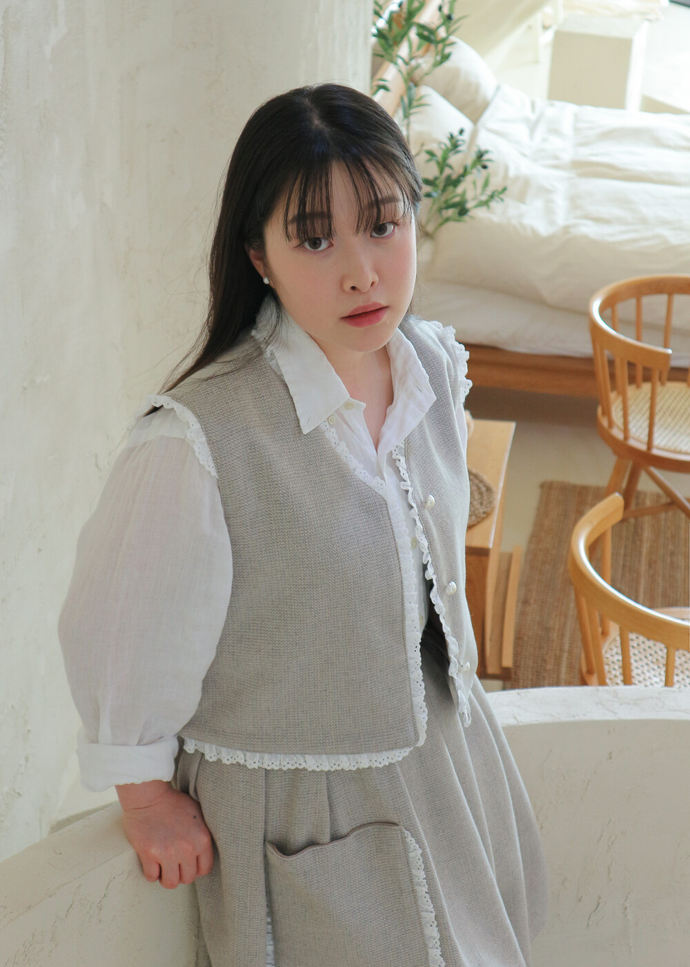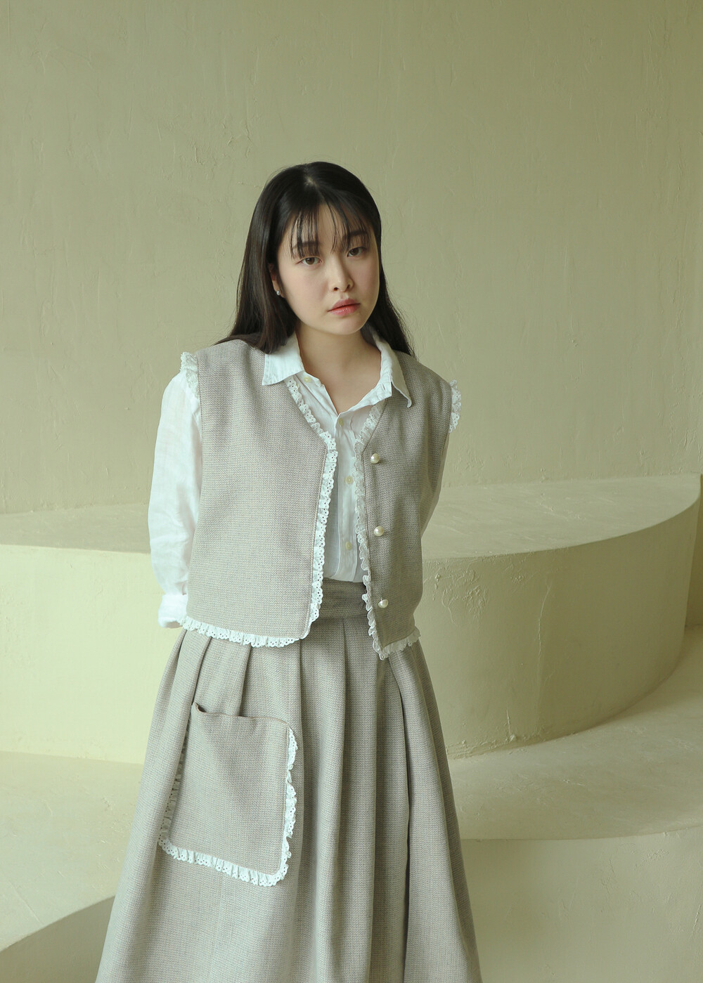 레이스로 테두리를 장식한 넓은 주머니가 달려있습니다.