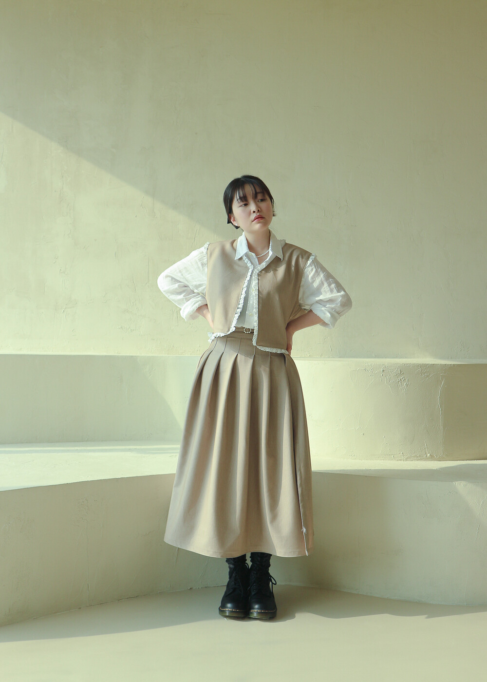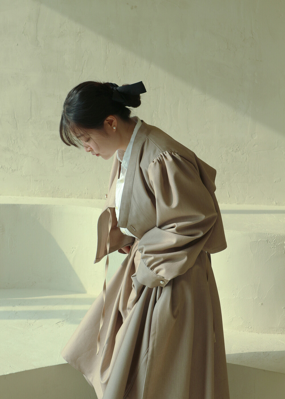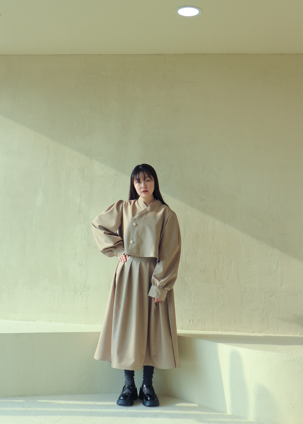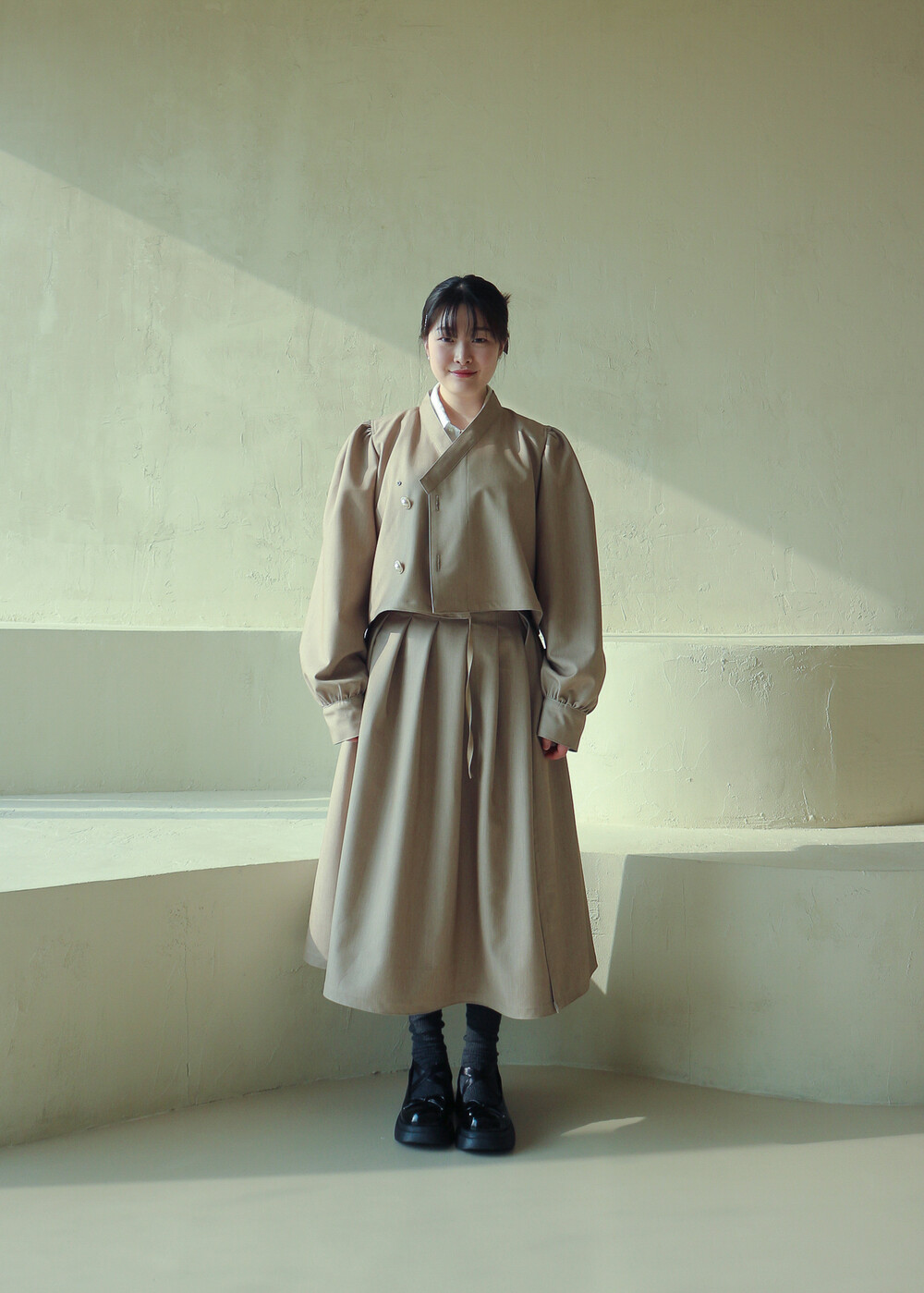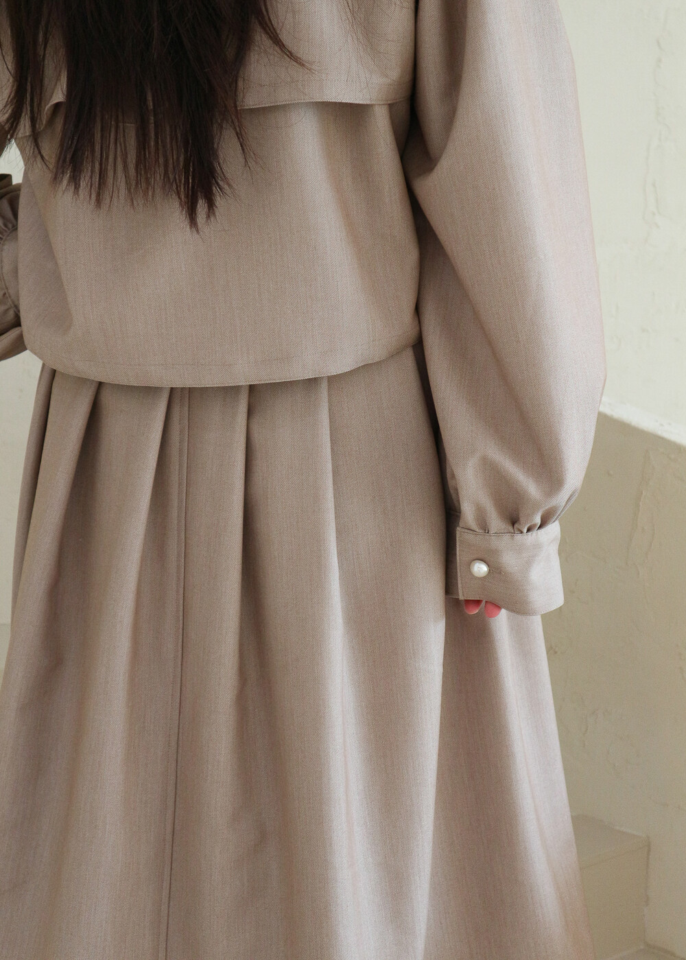 고급스러운 베이지 색감의 트렌치 핀턱 허리치마 입니다. 밀도가 있고