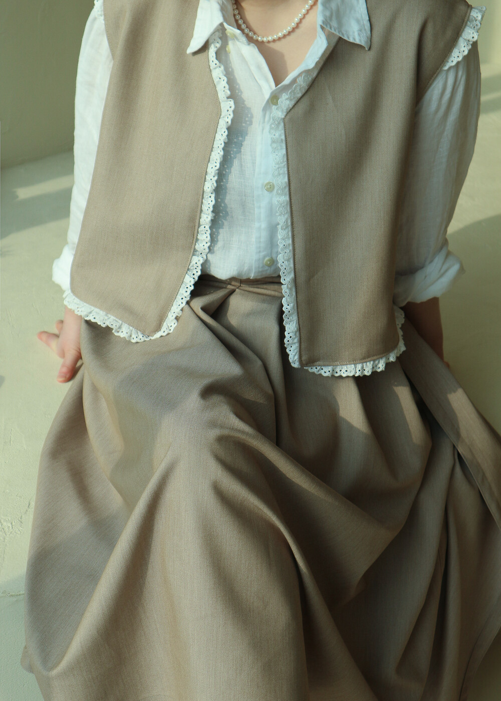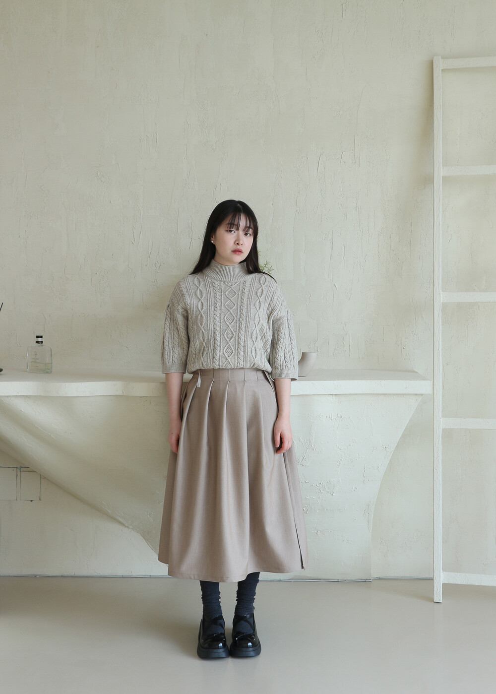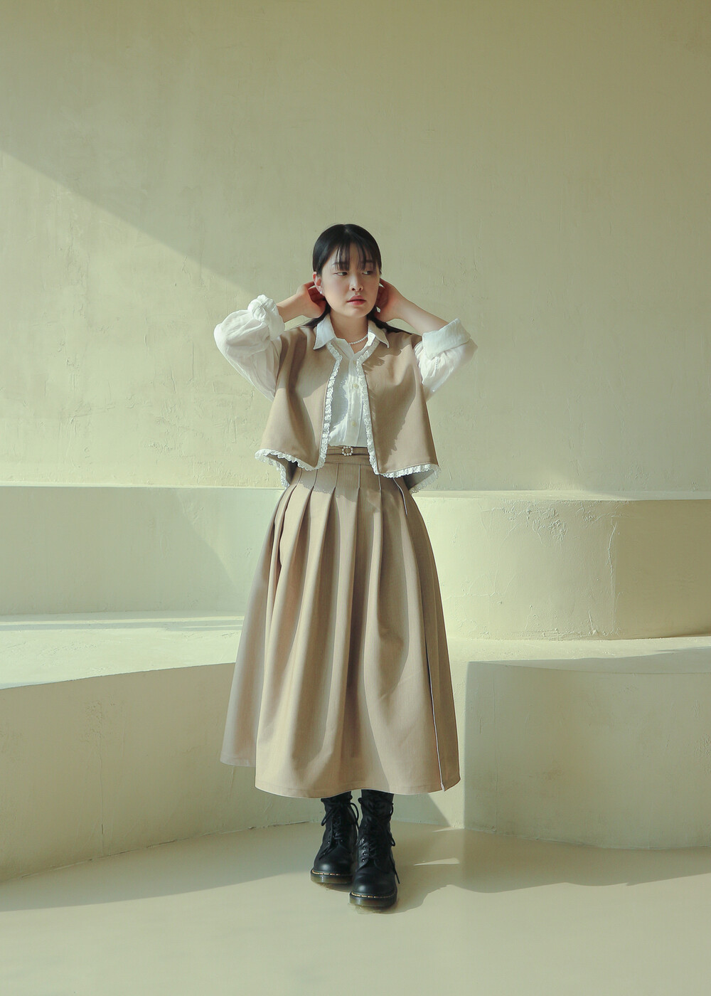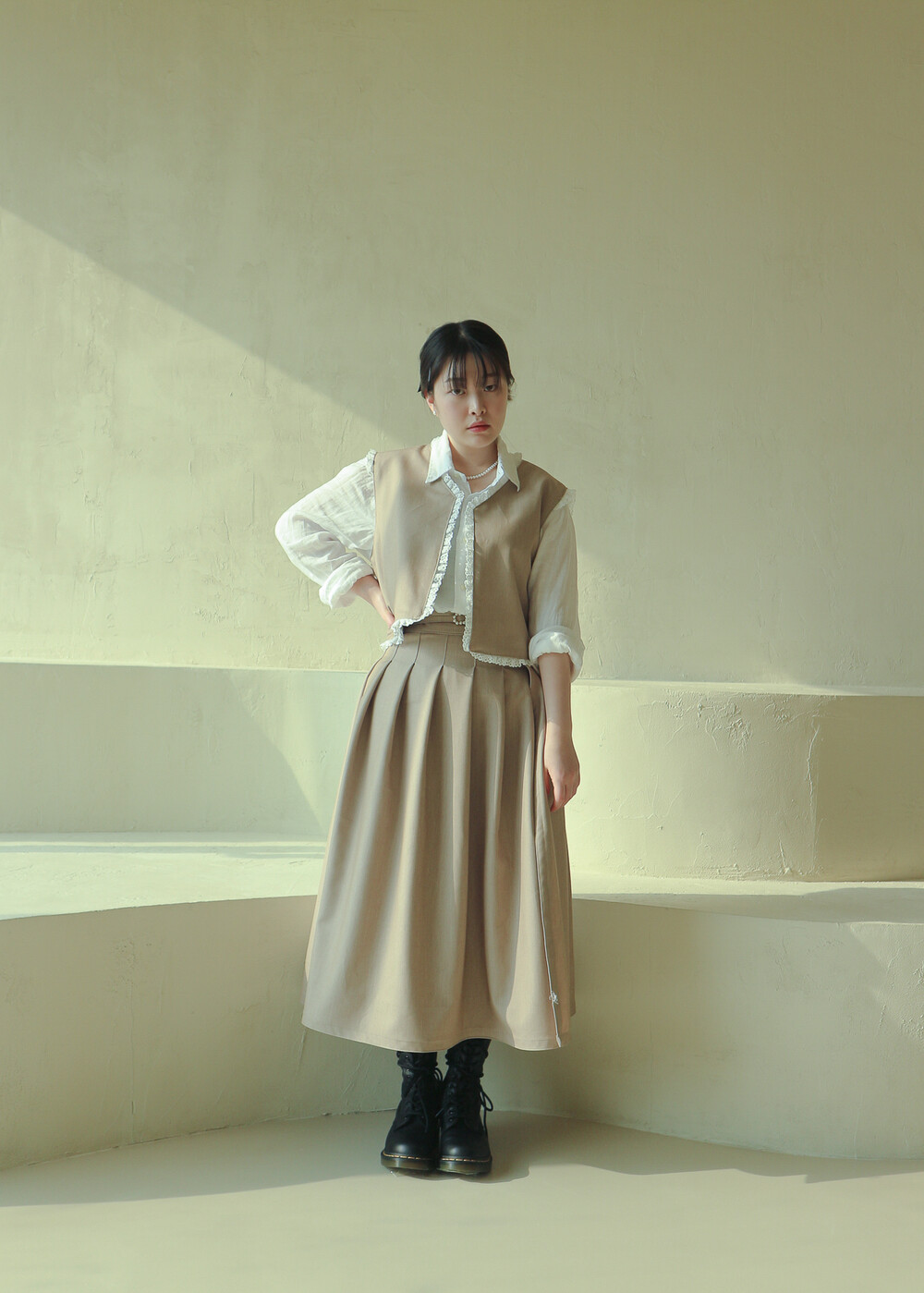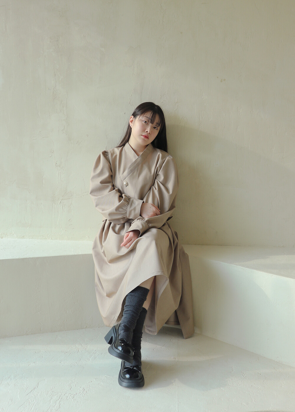 고급스러운 베이지 색감의 트렌치 핀턱 허리치마 입니다. 밀도가 있고