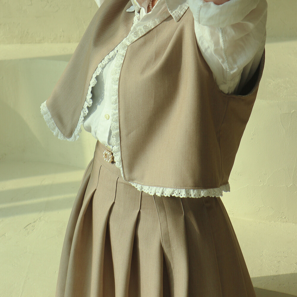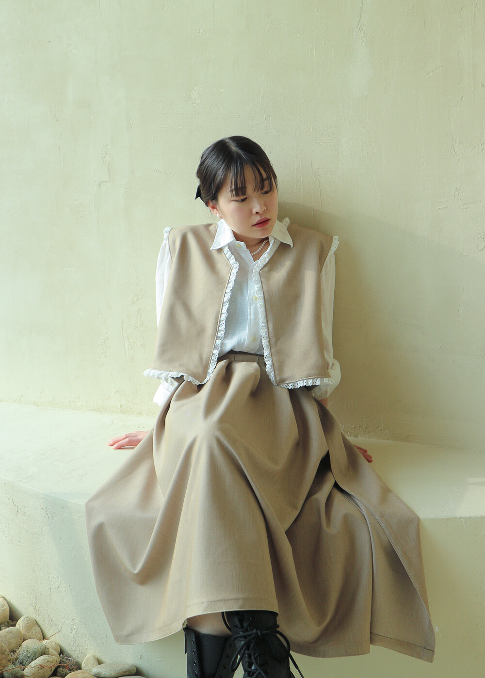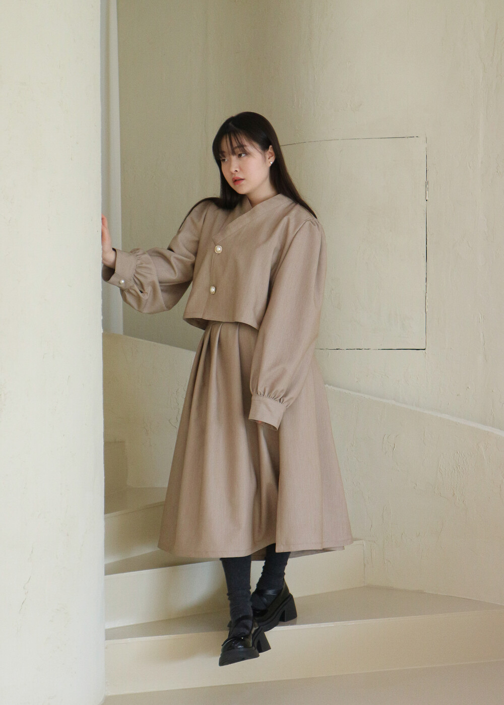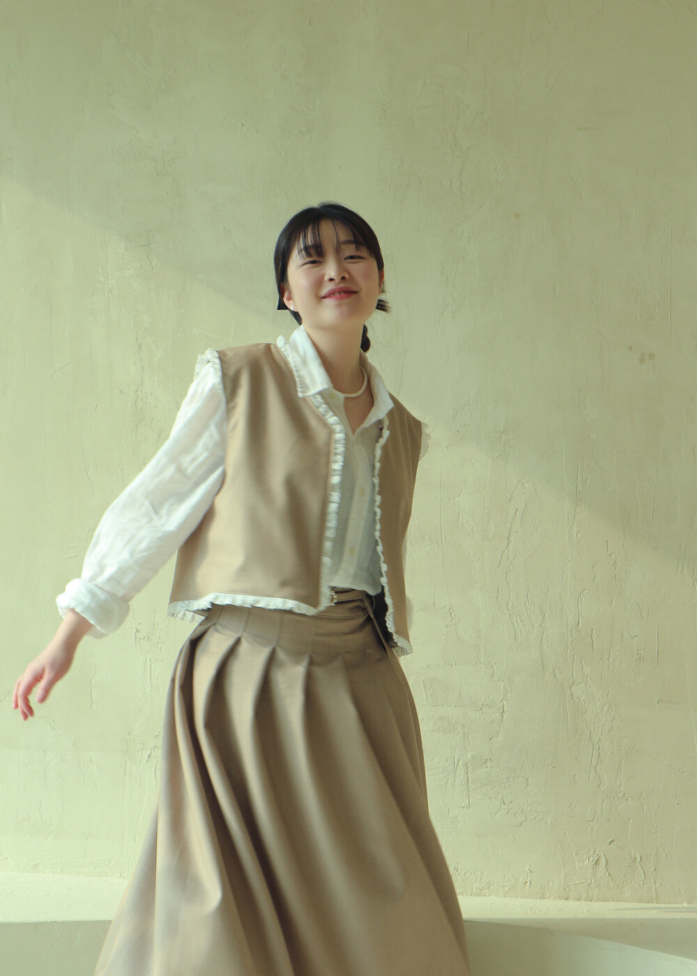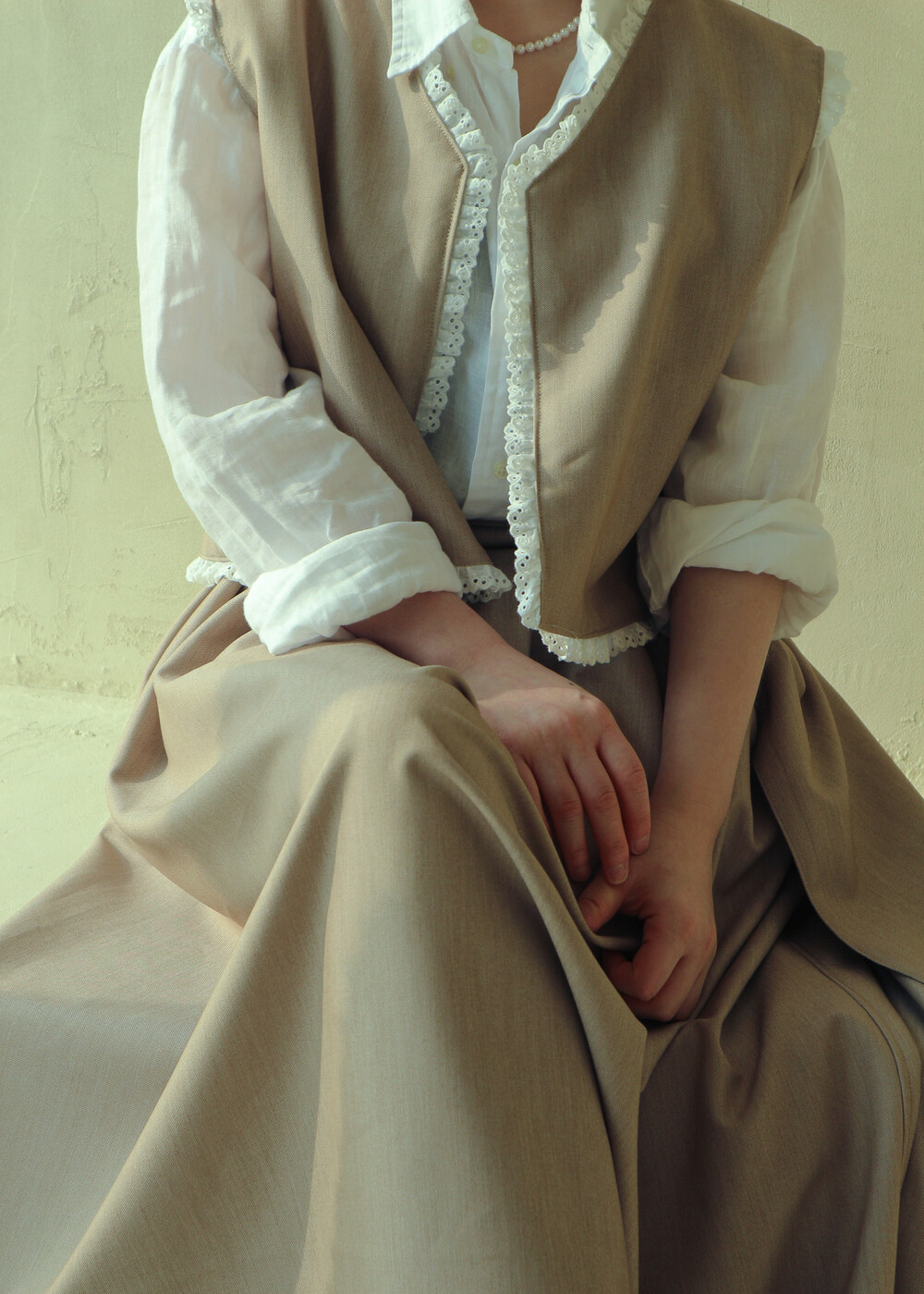 고급스러운 베이지 색감의 트렌치 핀턱 허리치마 입니다. 밀도가 있고