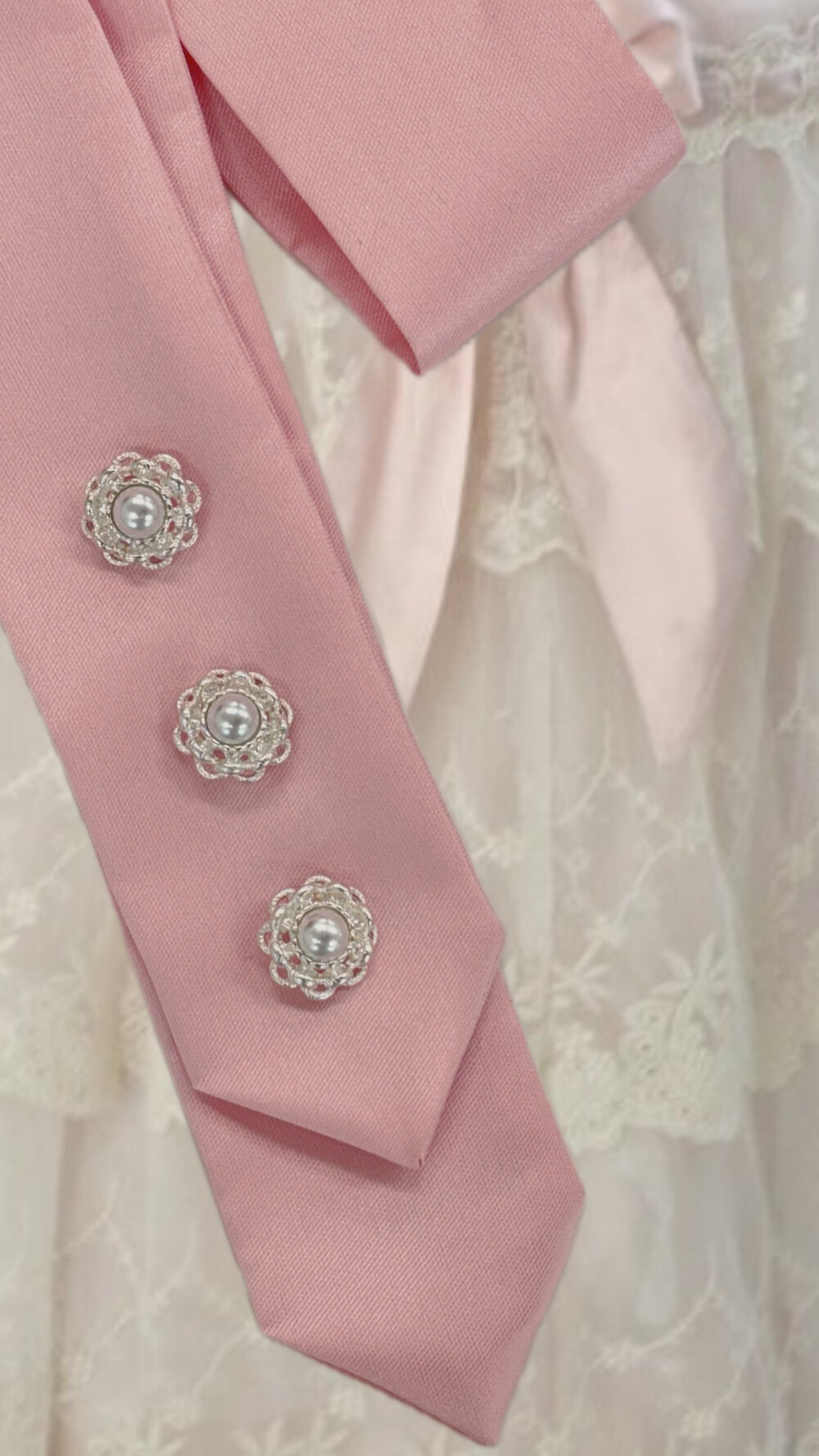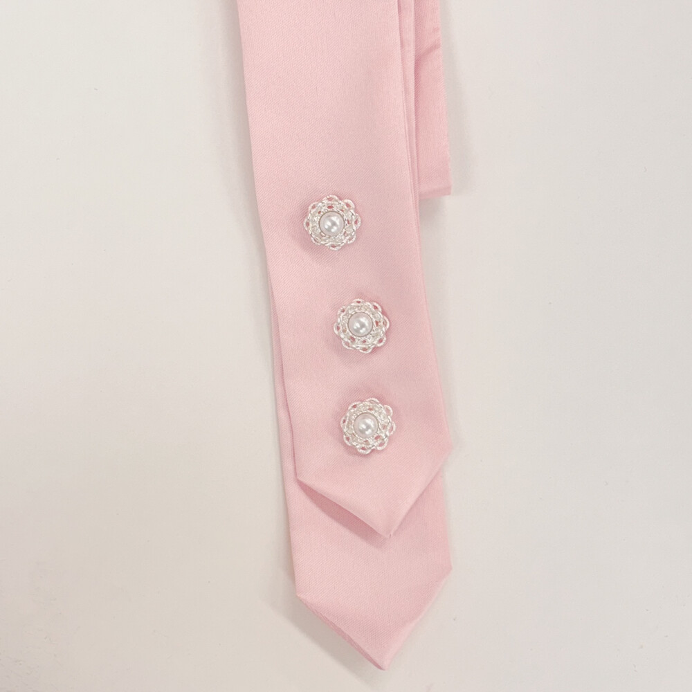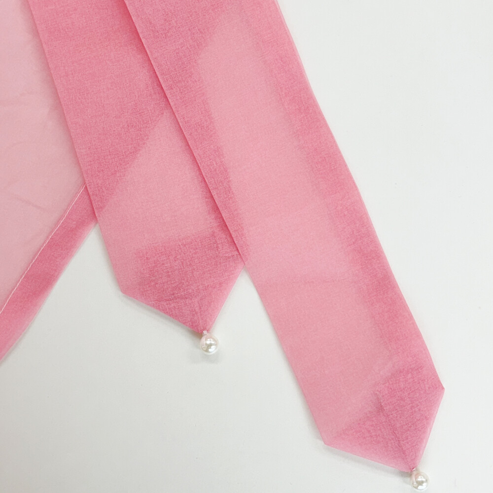 고급스러운 광택감이 있는 핑크 미카도 실크 원단으로 제작 된 댕기 입니다. 코랄 핑크 색감으로 화사한 색감이 매력있고 진주 꽃 모양의 단추가 장식되어있습니다. 길게 제작되어 여러번 겹쳐 핀으로 고정하여 착용 가능합니다.