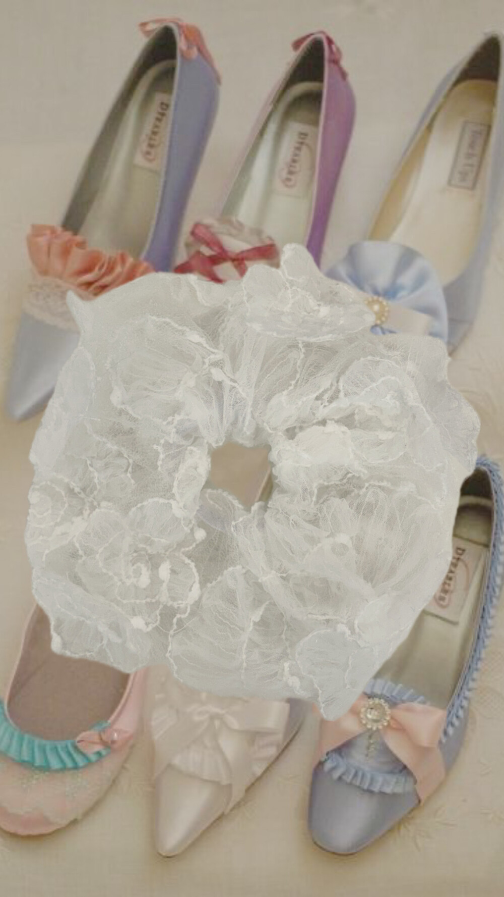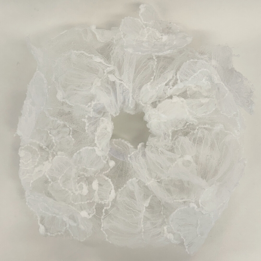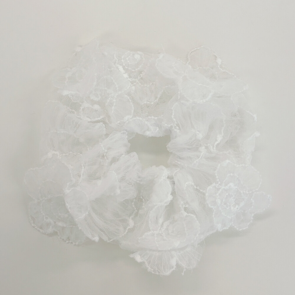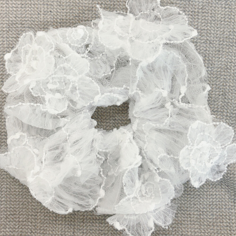 튤 원단위에 입체적으로 꽃 패턴이 반복되는 레이스 원단으로 제작 된 풍성한 헤어슈슈입니다. 헤어슈슈를 제작 하고 꽃패턴을 컷팅하여 슈슈 위에 한번 씩 더 장식하여 더욱 입체적인 헤어슈슈가 완성되었습니다.