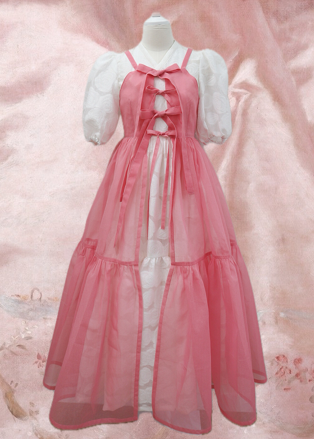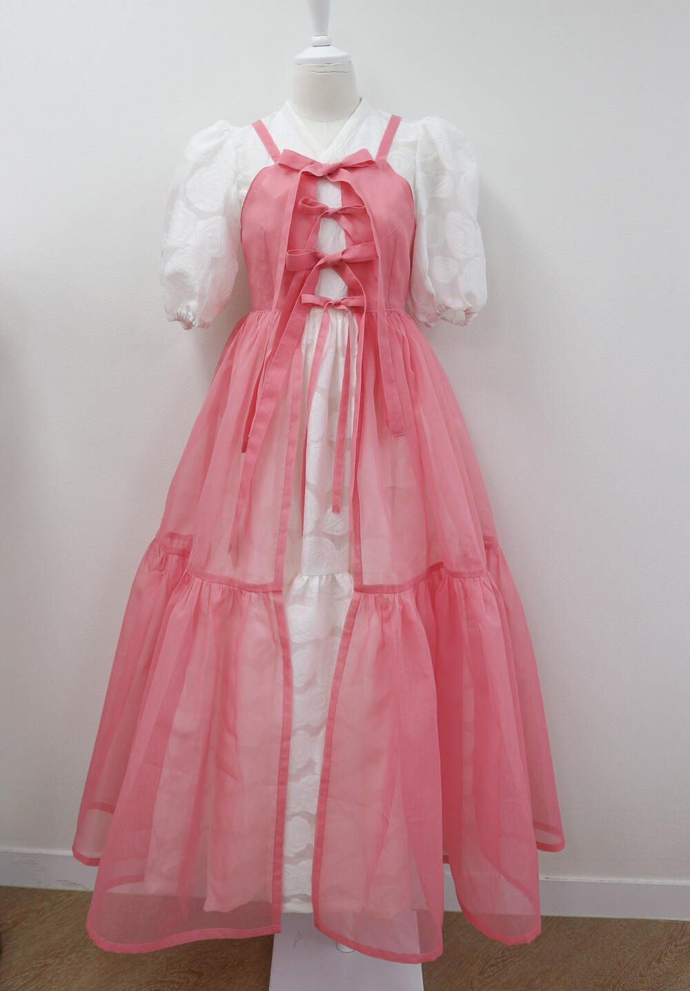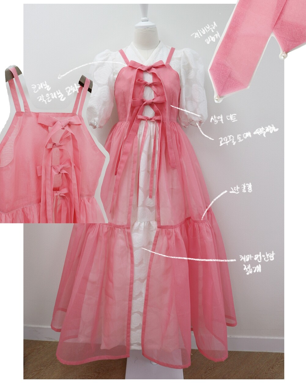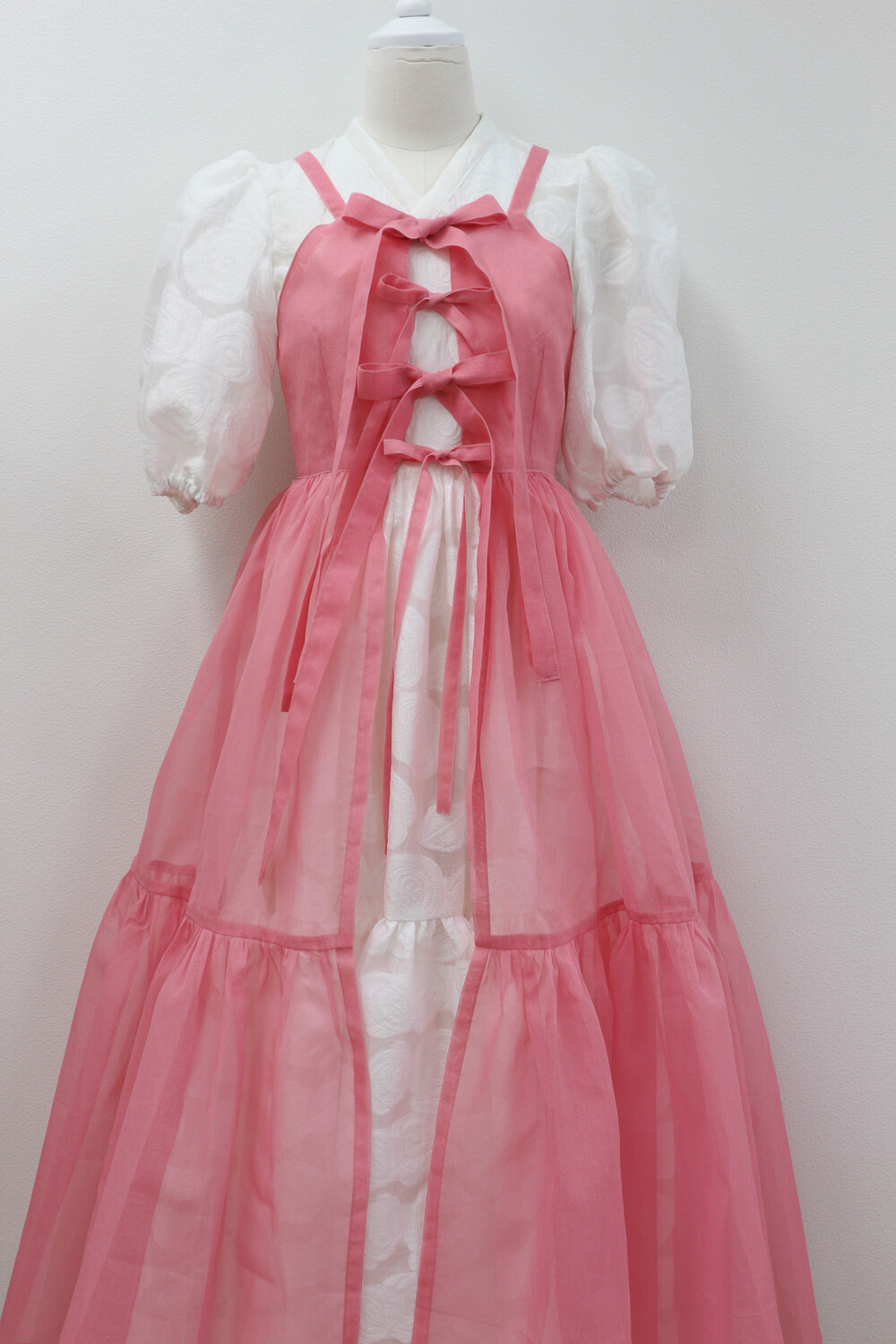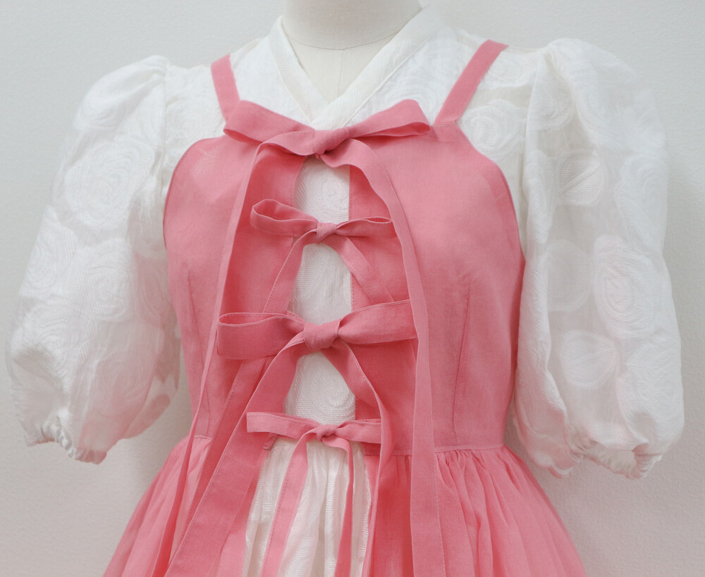 - 한복 노방 원단으로 제작 된 핑크 레이어드 원피스입니다. 중심에서 리본으로 여미는 형태로 아래까지 트여있는 디자인입니다.기존에 가지고있던 심플한 기성원피스나 철릭 한복 위에 포인트를 주기 좋은 에이프런 형식으로 제작이 되었으며 치마부분이 두단으로 풍성하게 제작 되었습니다. 리본은 두께가 다른 두 종류를 교차하여 달아주었으며 리본 끈 수을 더 줄일 수 있습니다. 173cm에 135cm 기장으로 함께 입은 화이트 로즈 철릭원피스보다 5cm 길게 제작 되었습니다.