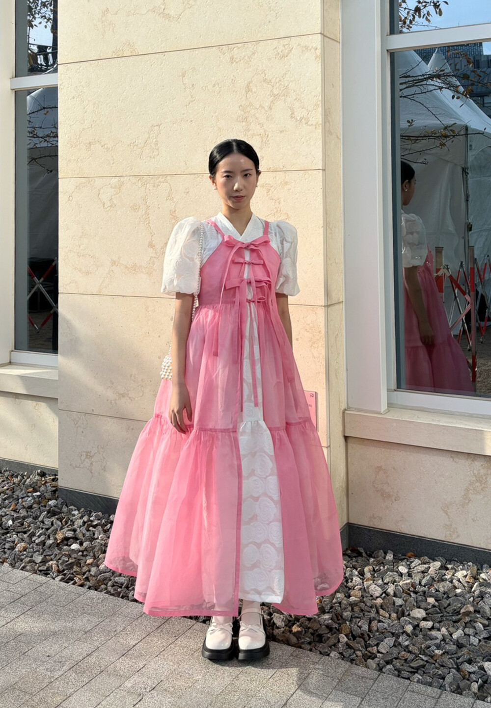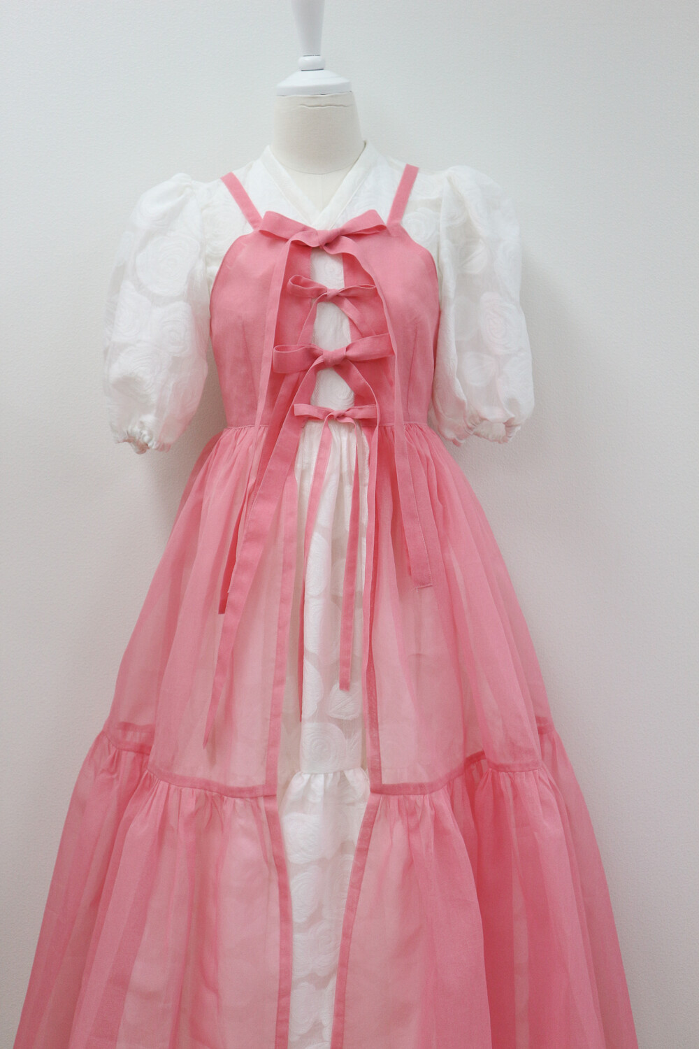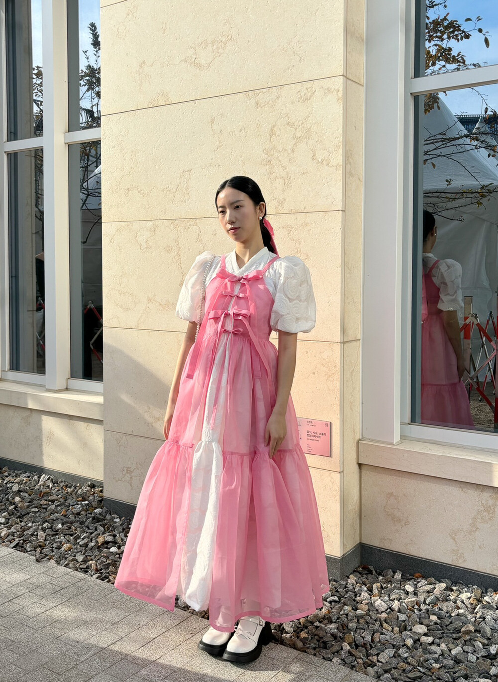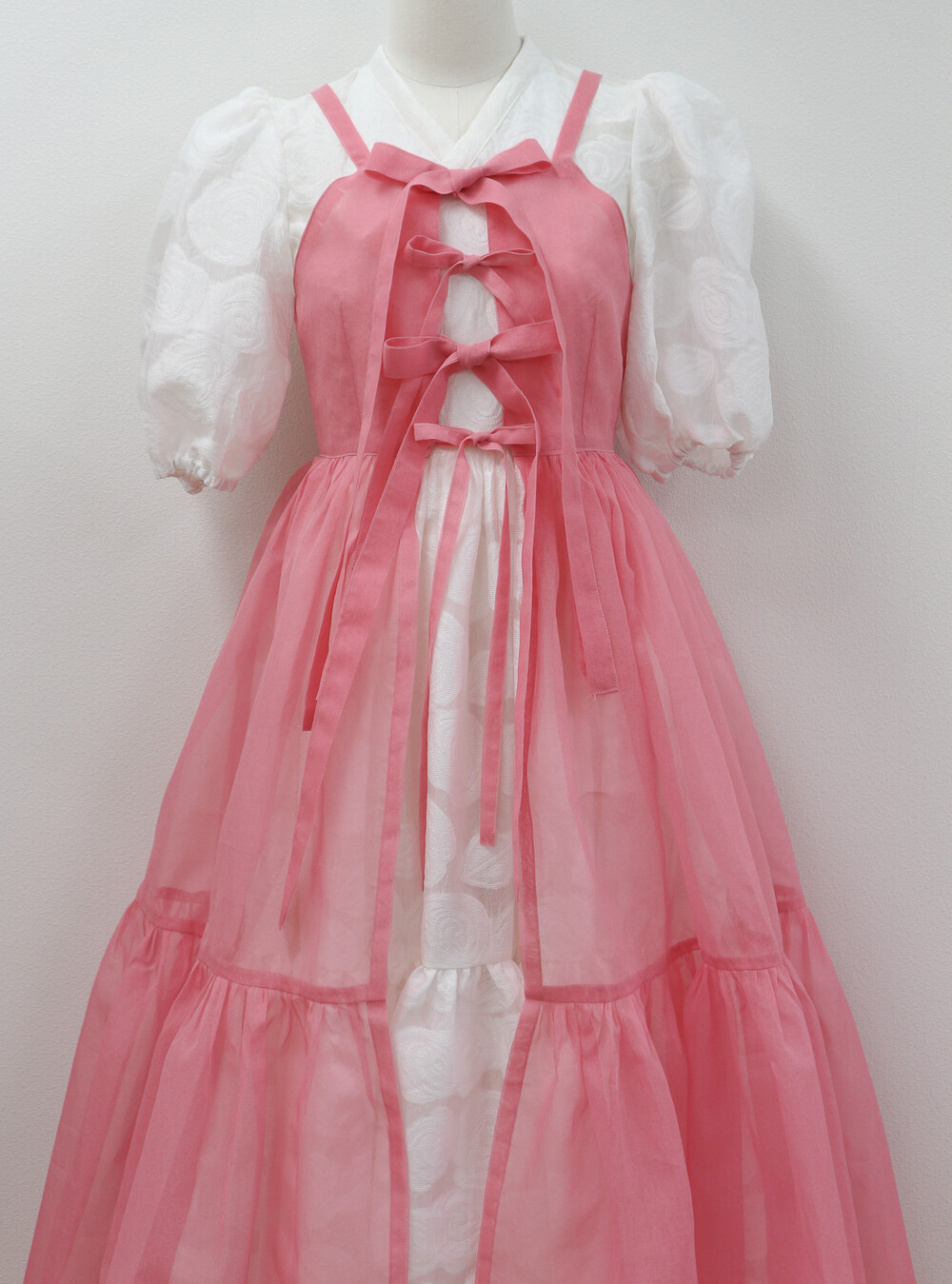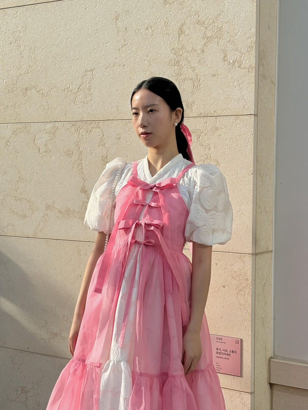 - 한복 노방 원단으로 제작 된 핑크 레이어드 원피스입니다. 중심에서 리본으로 여미는 형태로 아래까지 트여있는 디자인입니다.기존에 가지고있던 심플한 기성원피스나 철릭 한복 위에 포인트를 주기 좋은 에이프런 형식으로 제작이 되었으며 치마부분이 두단으로 풍성하게 제작 되었습니다. 리본은 두께가 다른 두 종류를 교차하여 달아주었으며 리본 끈 수을 더 줄일 수 있습니다. 173cm에 135cm 기장으로 함께 입은 화이트 로즈 철릭원피스보다 5cm 길게 제작 되었습니다.