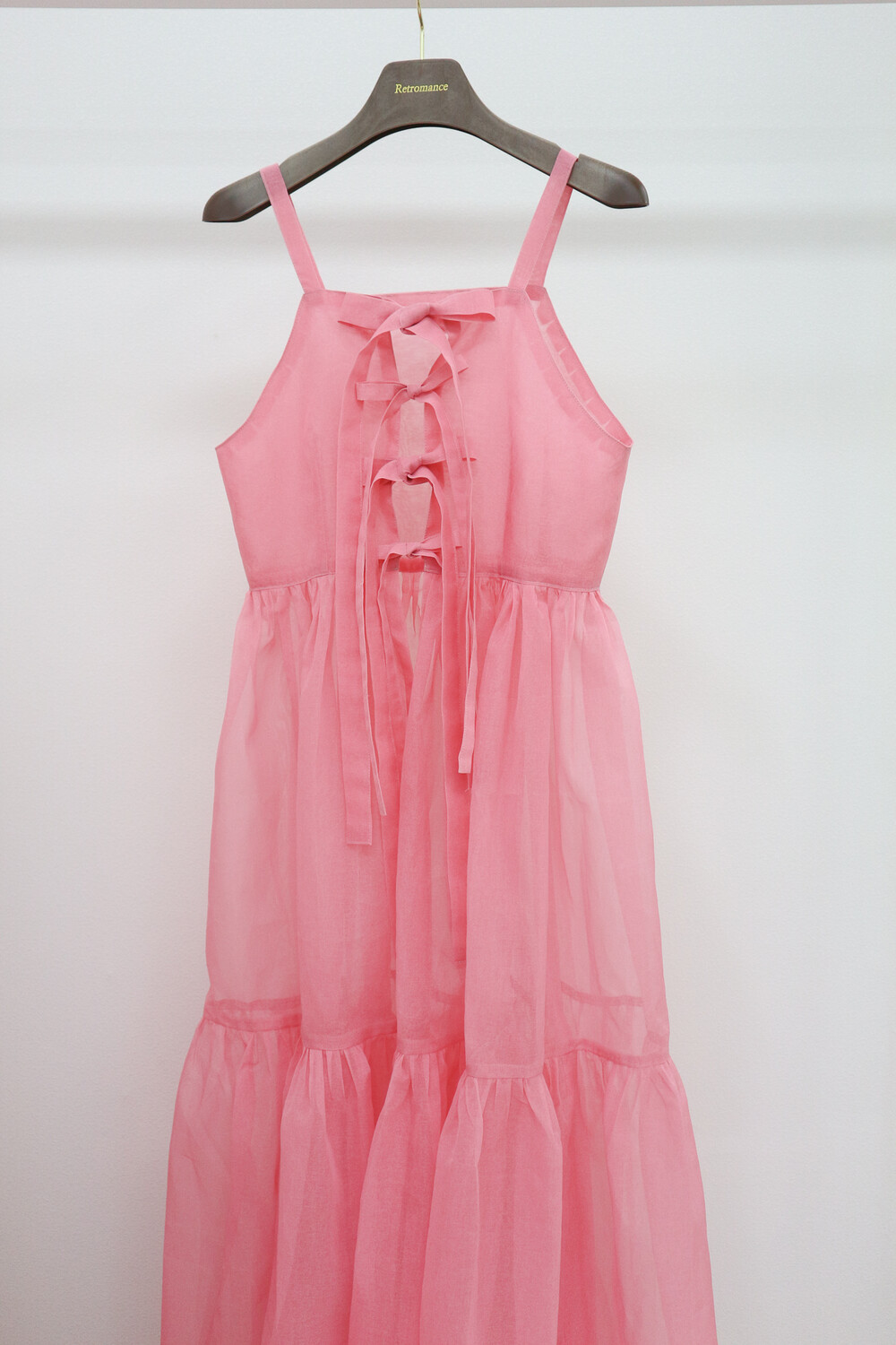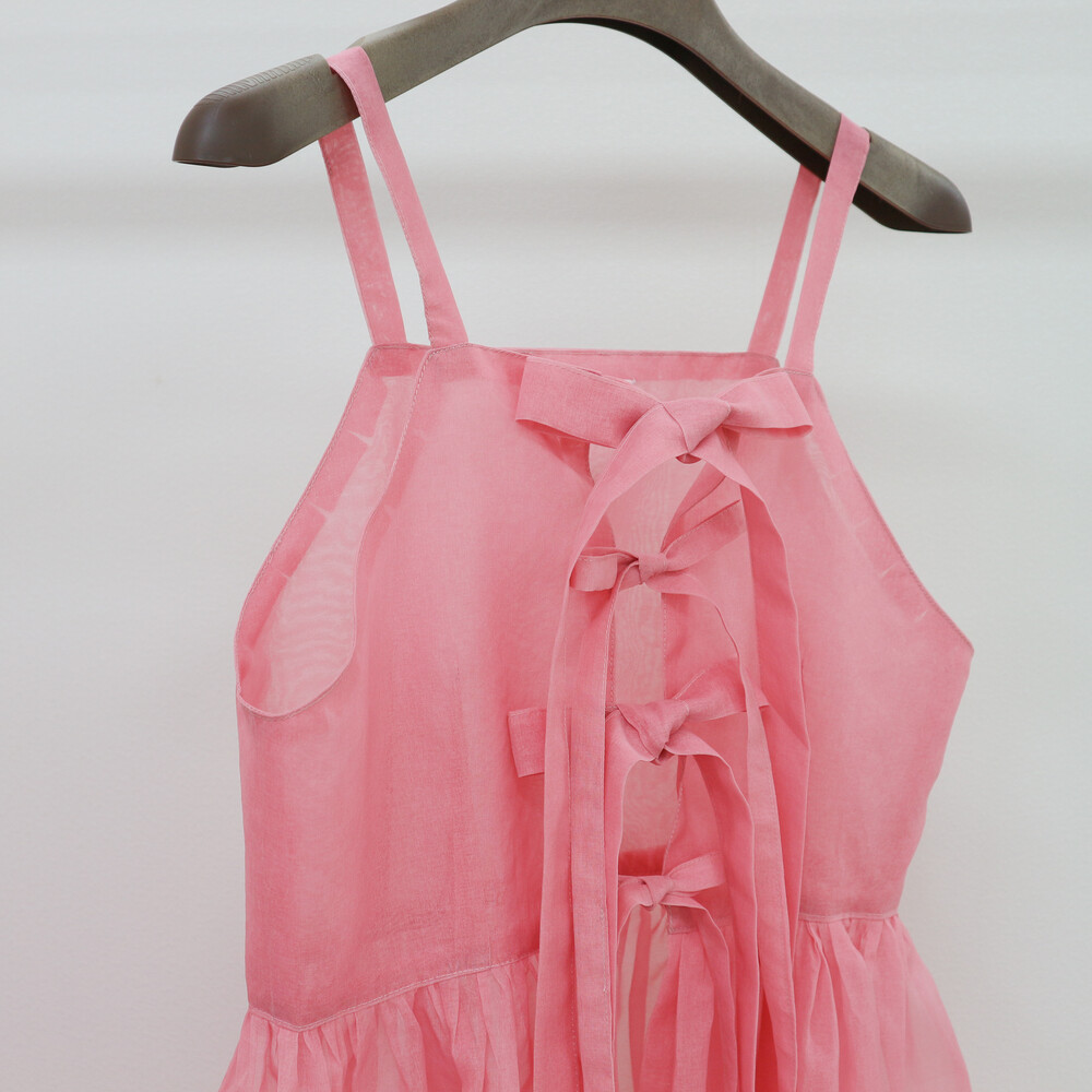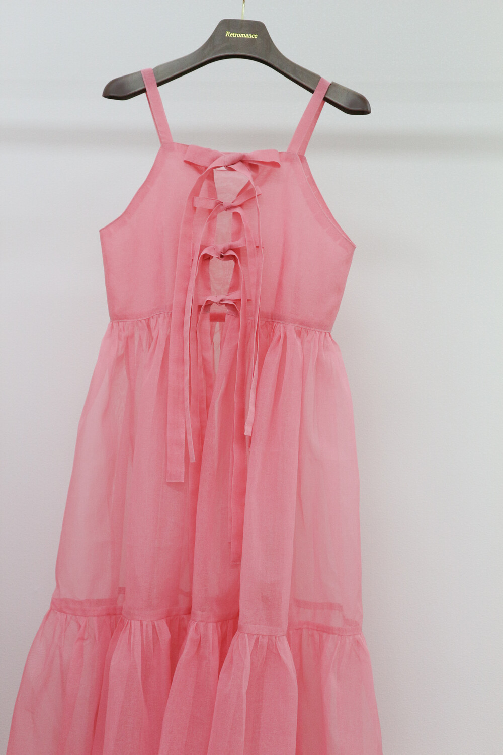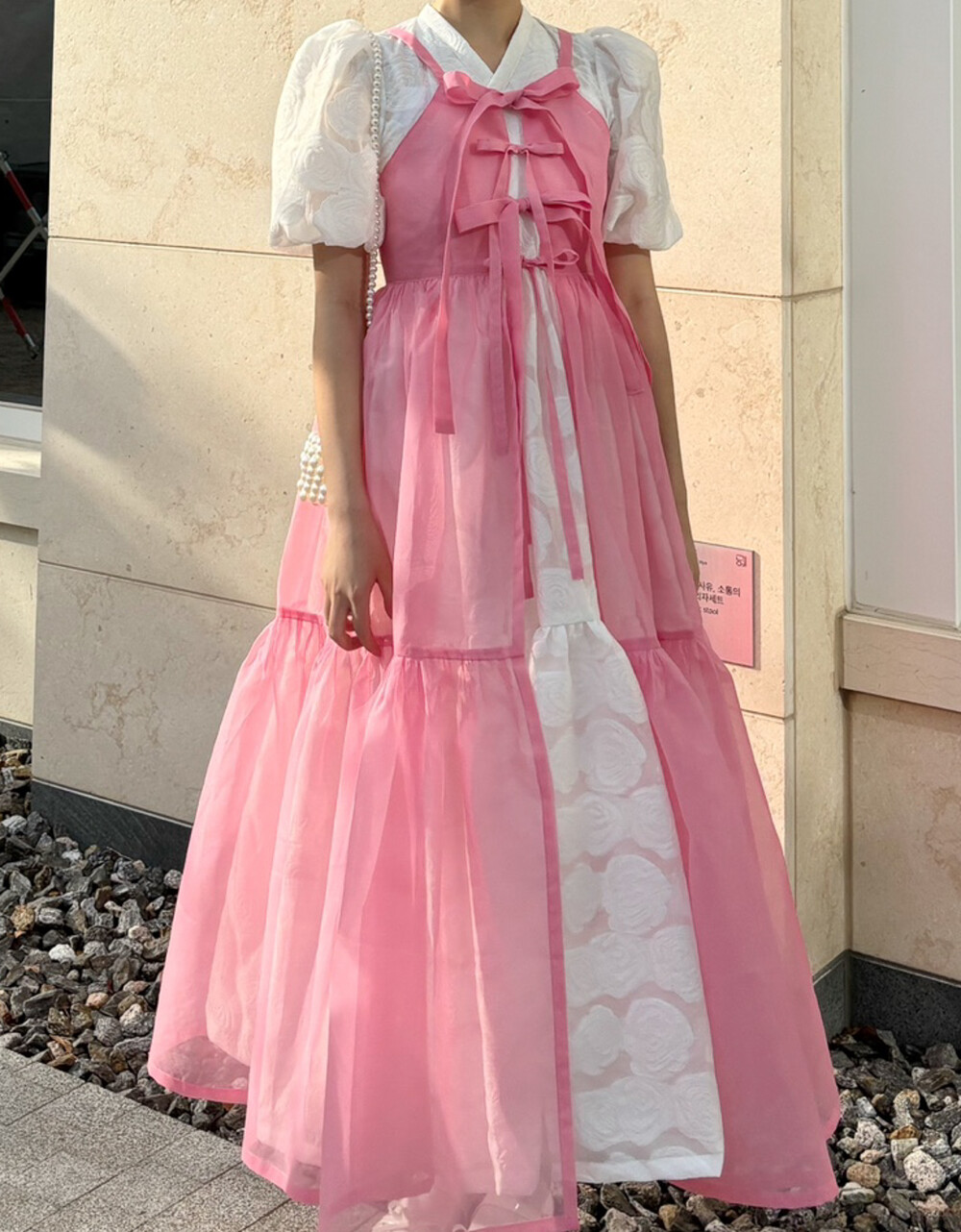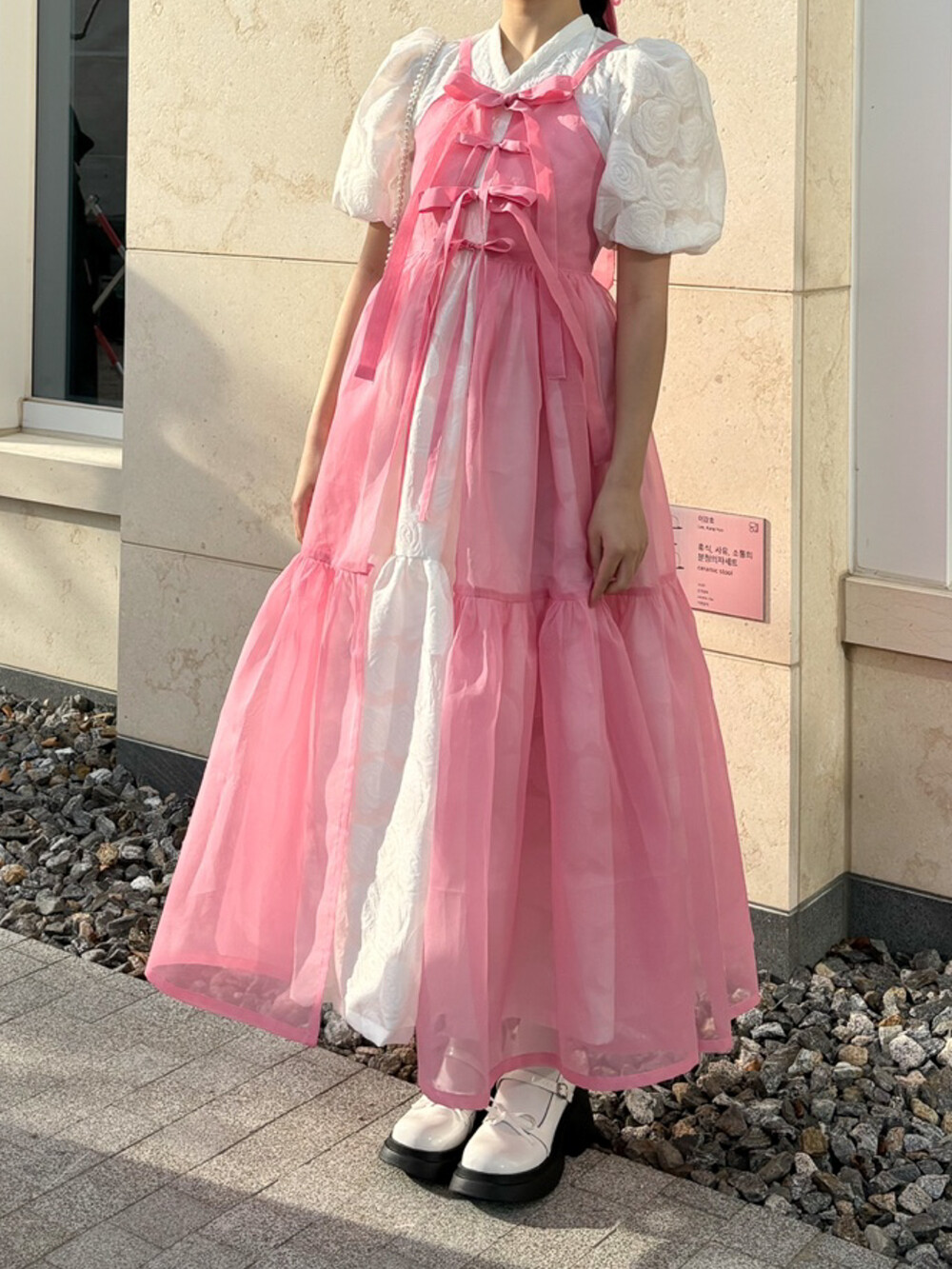 - 한복 노방 원단으로 제작 된 핑크 레이어드 원피스입니다. 중심에서 리본으로 여미는 형태로 아래까지 트여있는 디자인입니다.기존에 가지고있던 심플한 기성원피스나 철릭 한복 위에 포인트를 주기 좋은 에이프런 형식으로 제작이 되었으며 치마부분이 두단으로 풍성하게 제작 되었습니다. 리본은 두께가 다른 두 종류를 교차하여 달아주었으며 리본 끈 수을 더 줄일 수 있습니다. 173cm에 135cm 기장으로 함께 입은 화이트 로즈 철릭원피스보다 5cm 길게 제작 되었습니다.