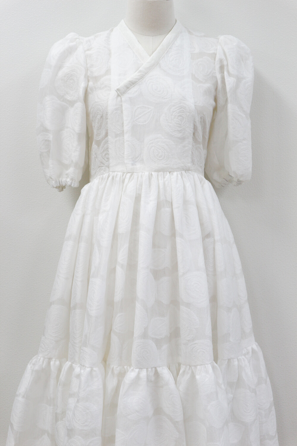 - 고급스러운 장미 패턴의 엠보가 있는 원단으로 제작된 철릭 원피스 입니다. 원단이 돋보이는 깔끔하고 군더더기 없는 디자인으로 캉캉으로 제작되어 풍성한 원피스 입니다. 얇은 깃에 스냅단추로 여미는 방식이며, 스냅 단추 대신 고름으로 변경 가능합니다. 소매 부분은 퍼프소매에 고무줄로 되어있습니다. 치마 부분에만 얇은 60수 면 원단으로 짧게 안감이 있습니다. 총장은 모델 사이즈 기준으로 173cm에 130cm기장에 44-55 사이즈로 제작 되었습니다. 총장과 사이즈는 전체 맞춤으로 제작됩니다.
