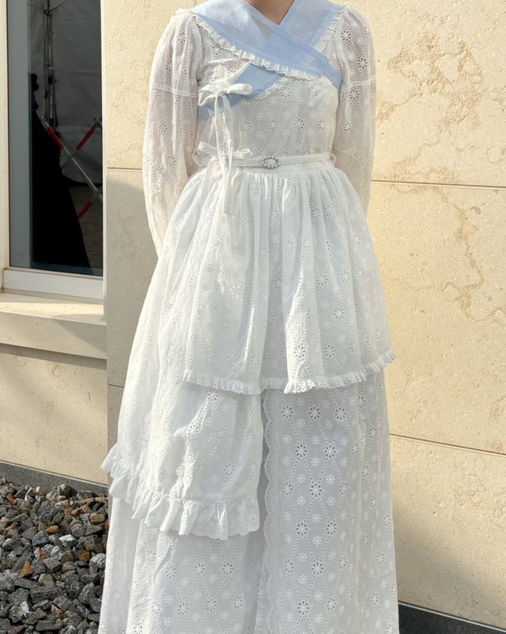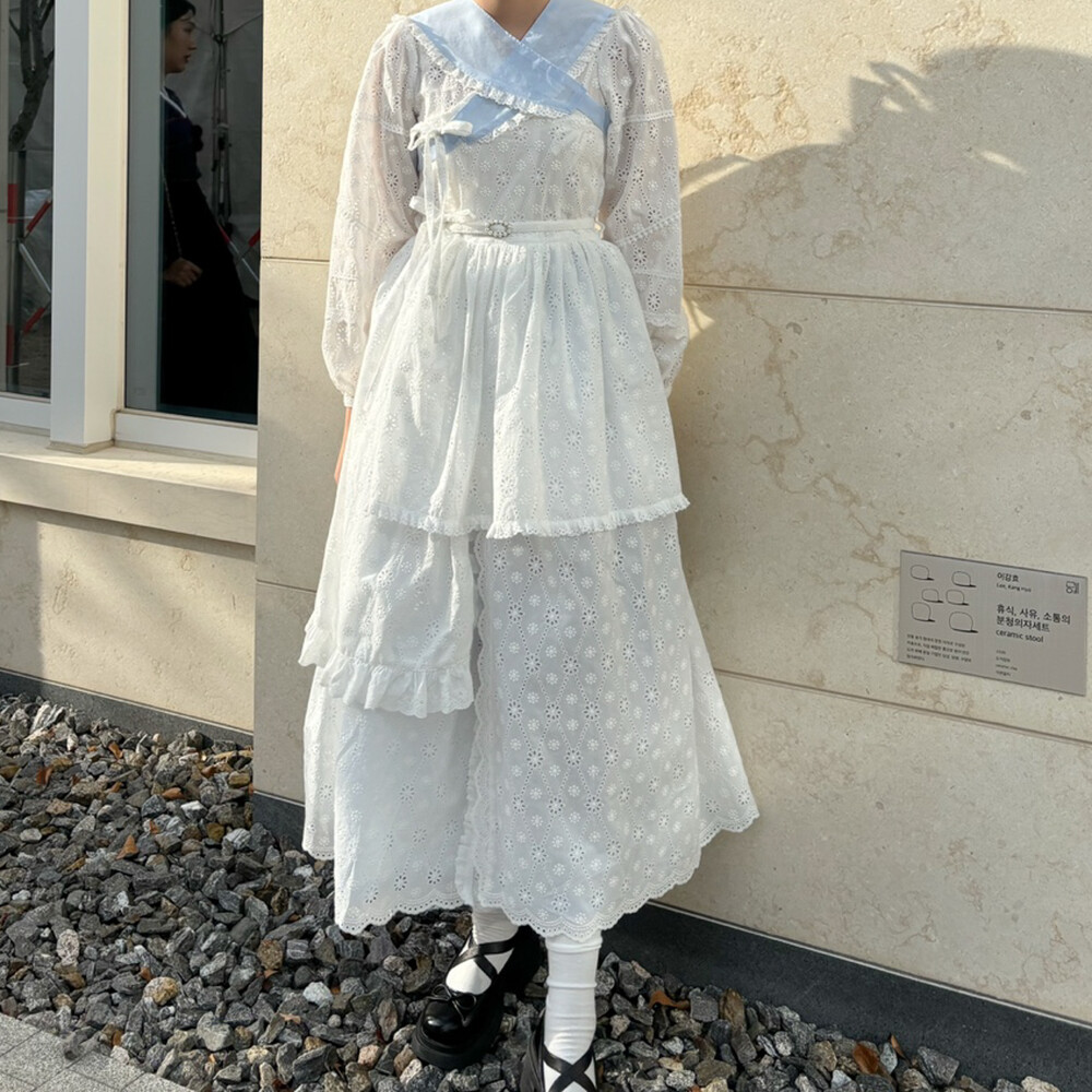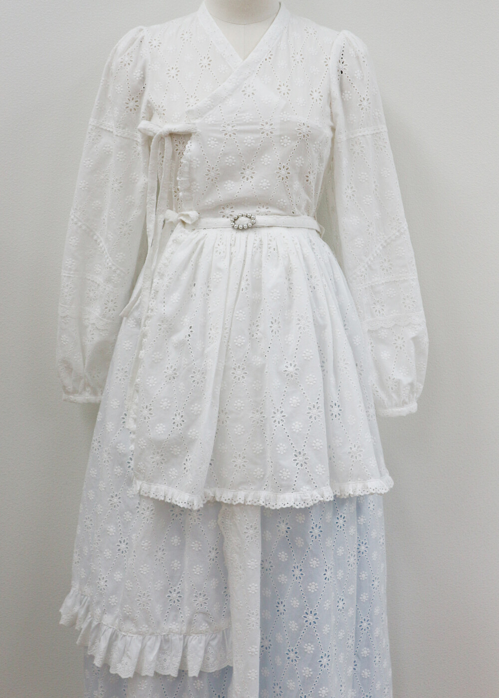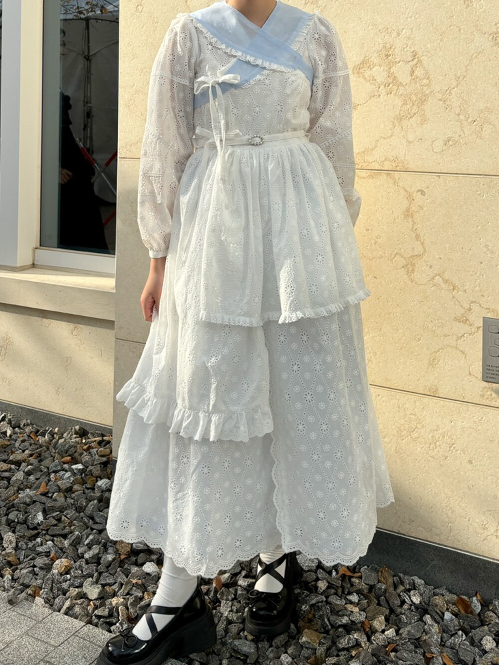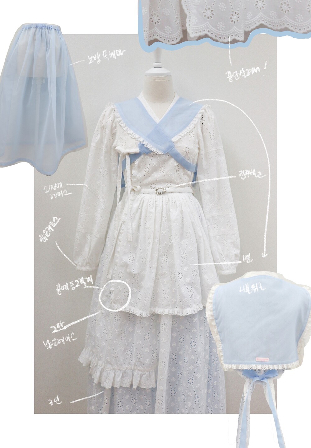 - 펀칭이 있는 면 레이스 원단으로 제작된 3단의 슬릿 철릭 원피스입니다. 원단에 펀칭이 있어 안이 비치는게 포인트로 하늘색 노방 속치마가 포함되어있는 상품으로 활동할때 나풀거리는 것이 특징입니다. 치마는 각각 단마다 레이스를 다르게 부착하여 포인트를 주었으며 제일 안쪽단은 레이스의 끝단을 살려 동그란 모양으로 마감되었습니다. 상의 소매는 레이스를 여러개 장식하고 커프스를 얇게 제작하였습니다. 진주벨트로 포인트를 준 상품입니다. 단가가 높은 고급 면 레이스 원단으로 사랑스럽고 독특한 무드의 레트로맨스 만의 슬릿 철릭 원피스입니다. 175cm 기준으로 135cm 기장을 착용하였습니다.