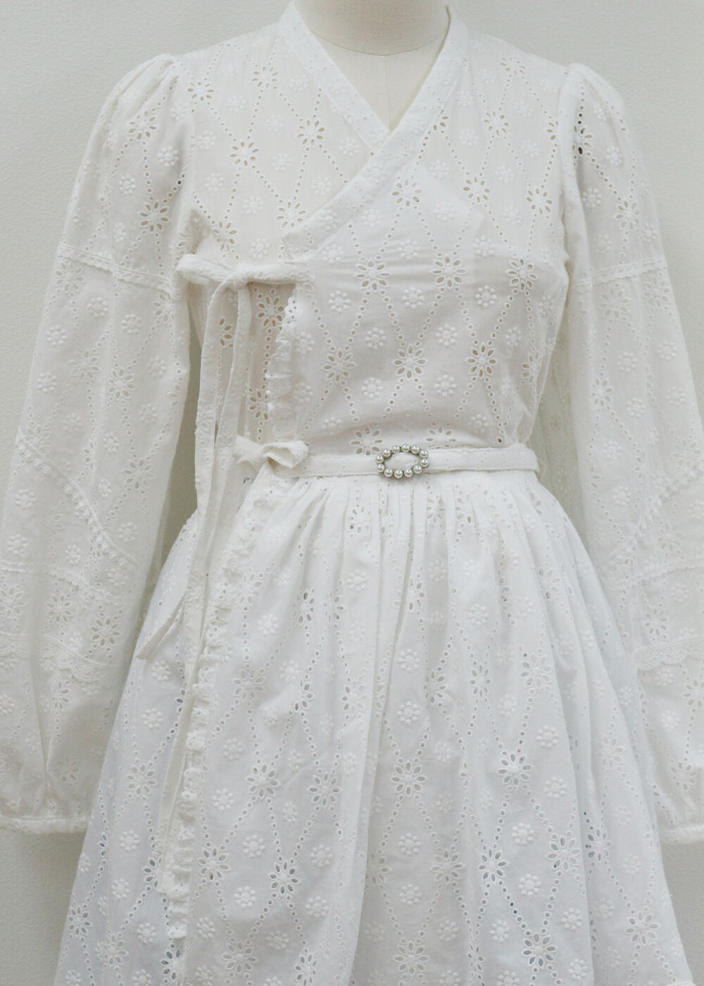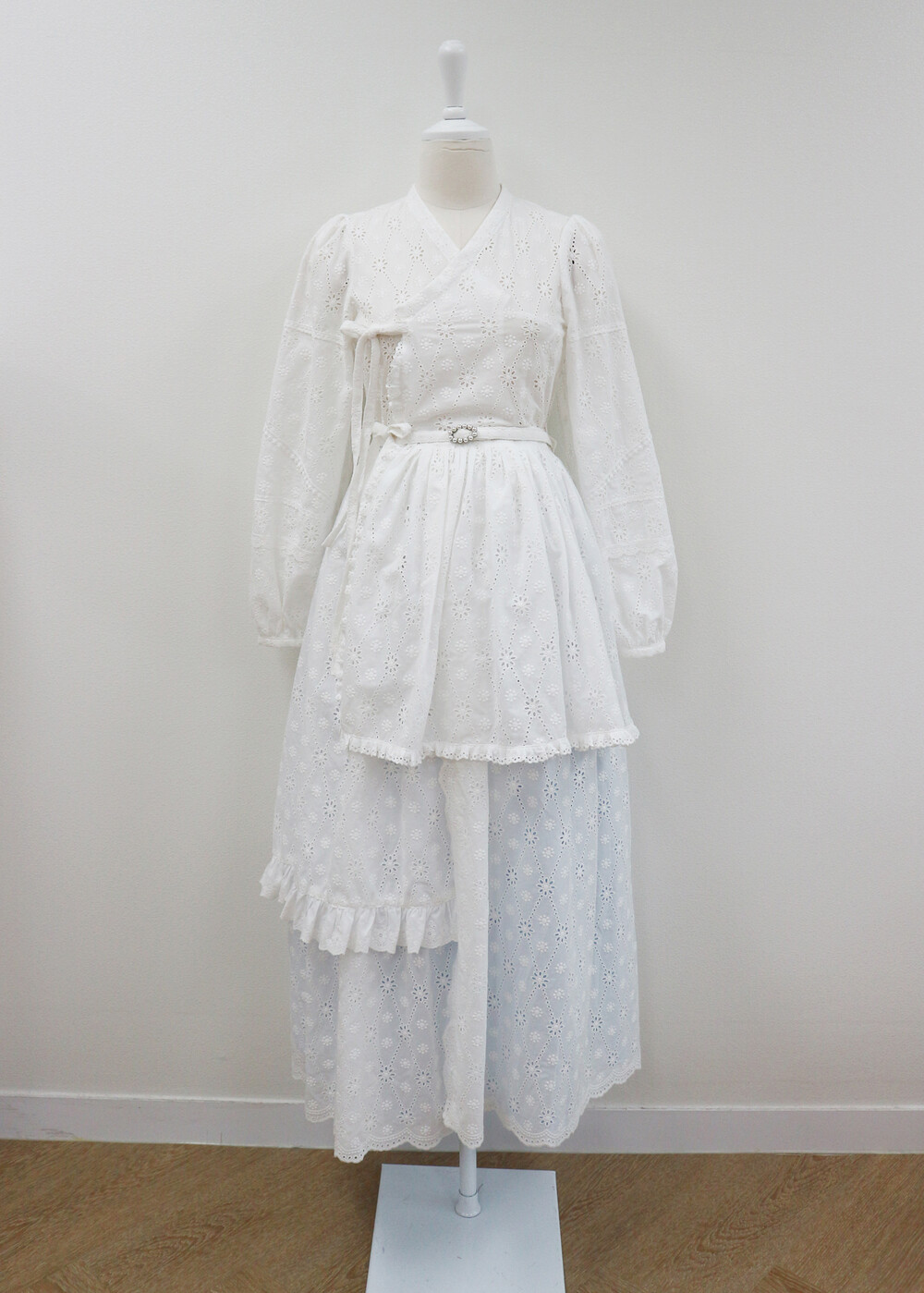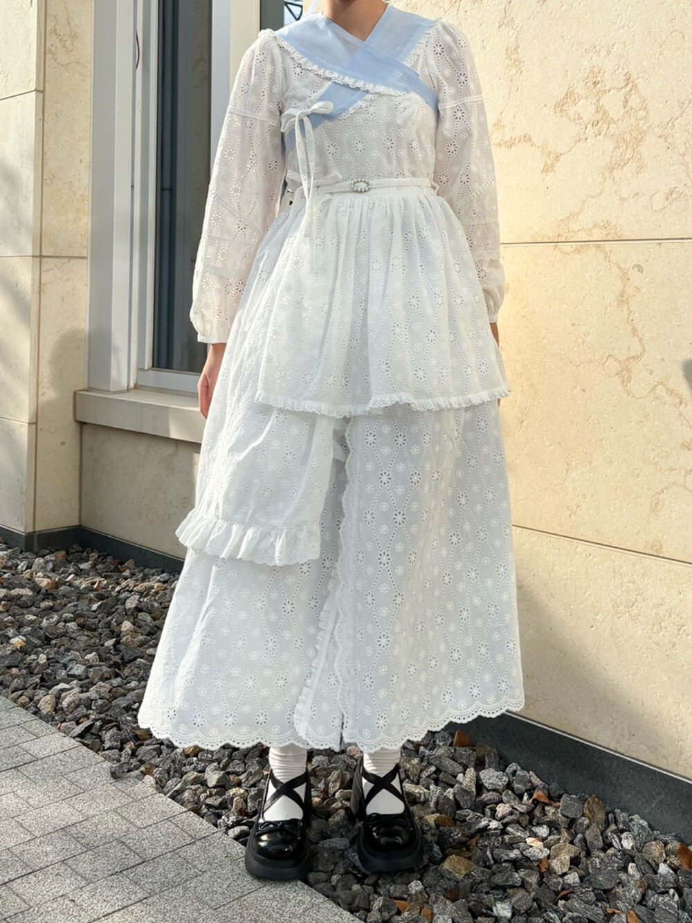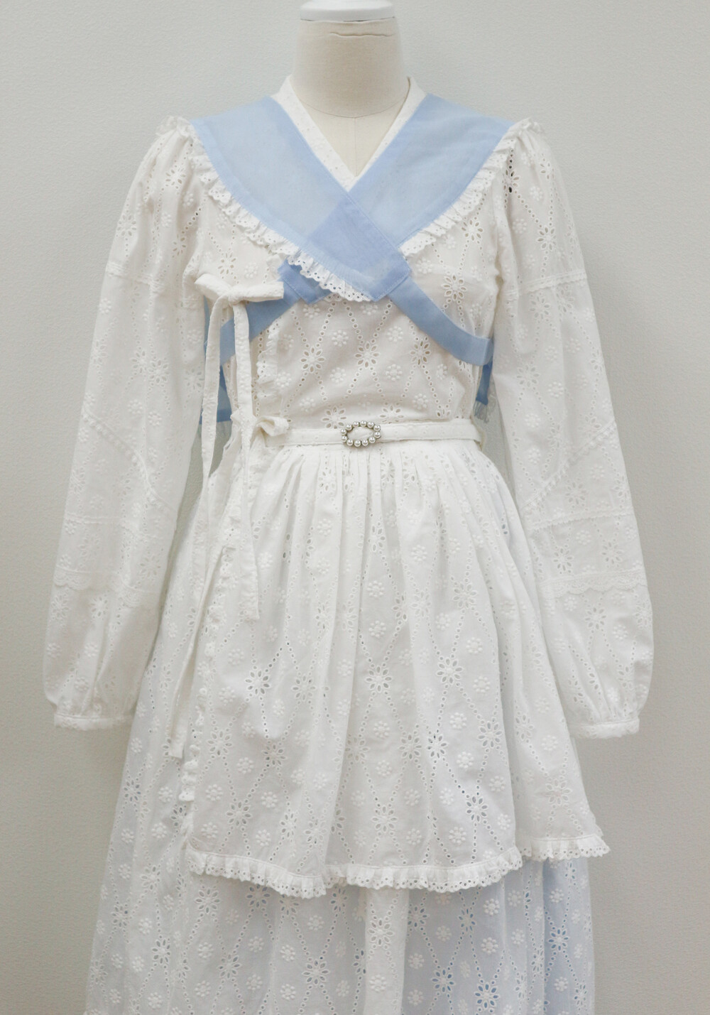 - 펀칭이 있는 면 레이스 원단으로 제작된 3단의 슬릿 철릭 원피스입니다. 원단에 펀칭이 있어 안이 비치는게 포인트로 하늘색 노방 속치마가 포함되어있는 상품으로 활동할때 나풀거리는 것이 특징입니다. 치마는 각각 단마다 레이스를 다르게 부착하여 포인트를 주었으며 제일 안쪽단은 레이스의 끝단을 살려 동그란 모양으로 마감되었습니다. 상의 소매는 레이스를 여러개 장식하고 커프스를 얇게 제작하였습니다. 진주벨트로 포인트를 준 상품입니다. 단가가 높은 고급 면 레이스 원단으로 사랑스럽고 독특한 무드의 레트로맨스 만의 슬릿 철릭 원피스입니다. 175cm 기준으로 135cm 기장을 착용하였습니다.