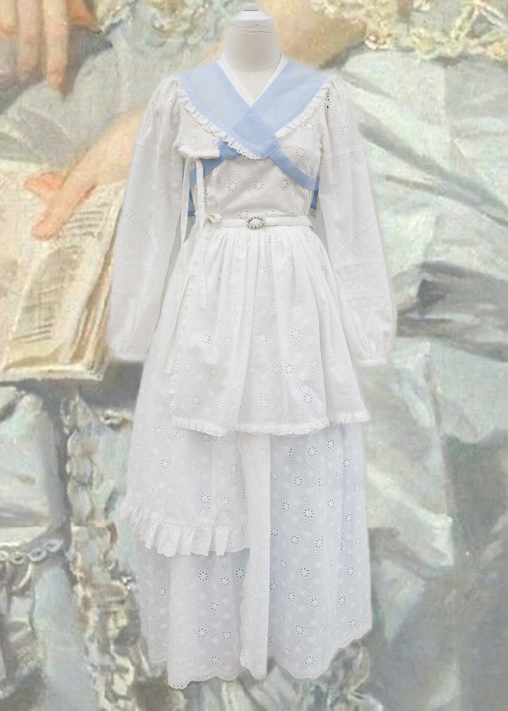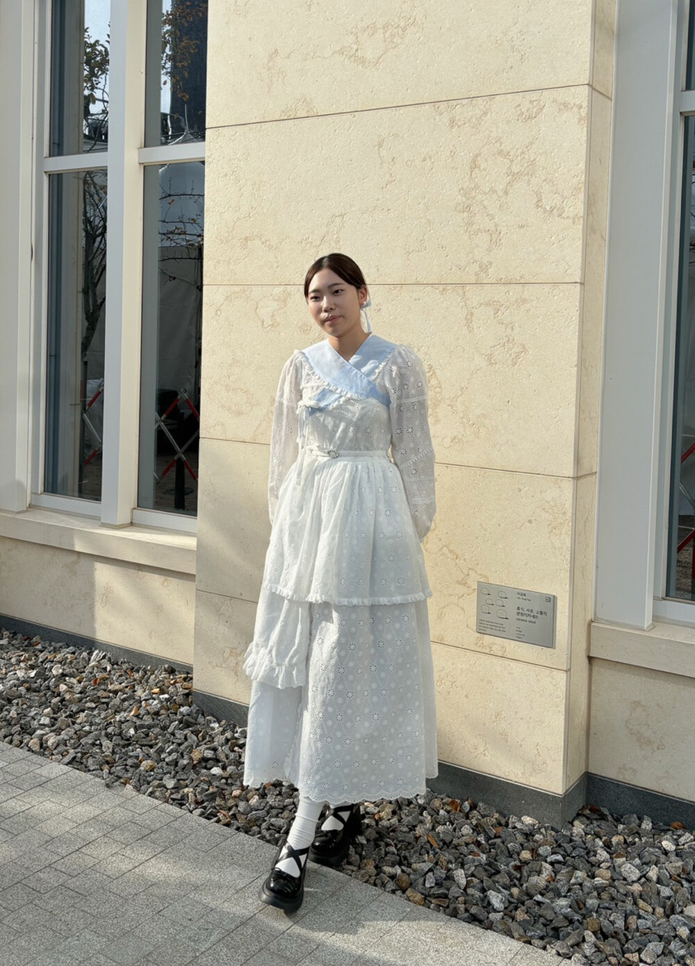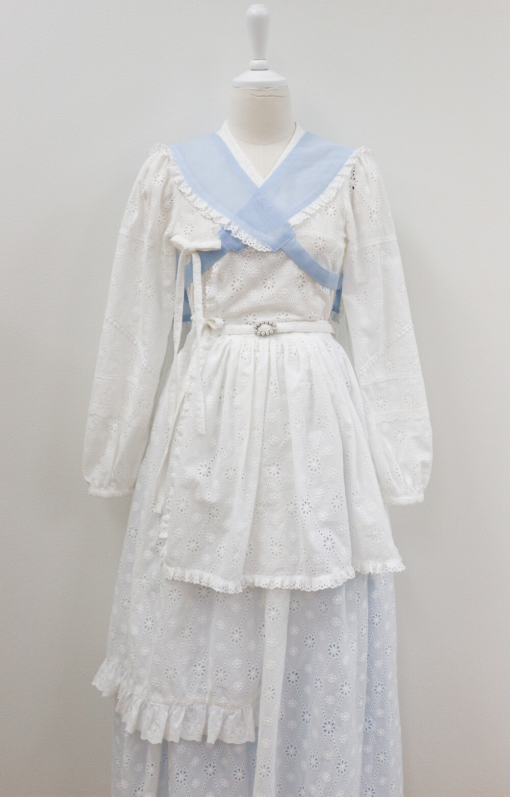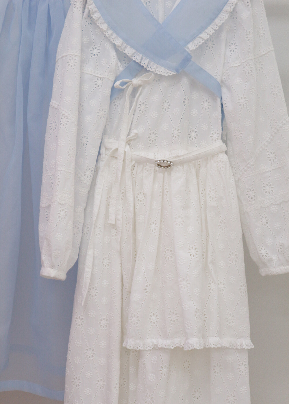 - 펀칭이 있는 면 레이스 원단으로 제작된 3단의 슬릿 철릭 원피스입니다. 원단에 펀칭이 있어 안이 비치는게 포인트로 하늘색 노방 속치마가 포함되어있는 상품으로 활동할때 나풀거리는 것이 특징입니다. 치마는 각각 단마다 레이스를 다르게 부착하여 포인트를 주었으며 제일 안쪽단은 레이스의 끝단을 살려 동그란 모양으로 마감되었습니다. 상의 소매는 레이스를 여러개 장식하고 커프스를 얇게 제작하였습니다. 진주벨트로 포인트를 준 상품입니다. 단가가 높은 고급 면 레이스 원단으로 사랑스럽고 독특한 무드의 레트로맨스 만의 슬릿 철릭 원피스입니다. 175cm 기준으로 135cm 기장을 착용하였습니다.