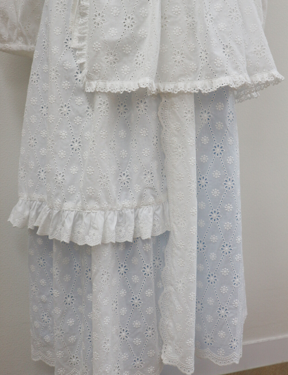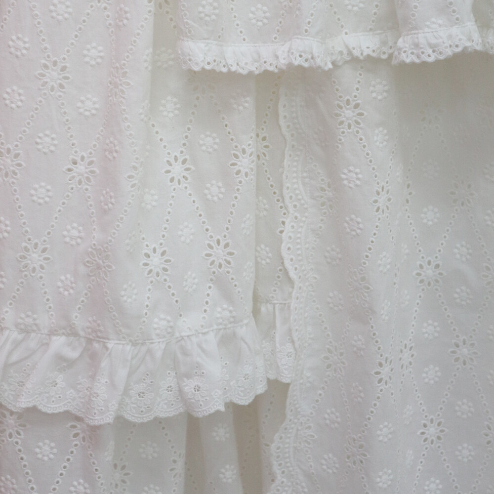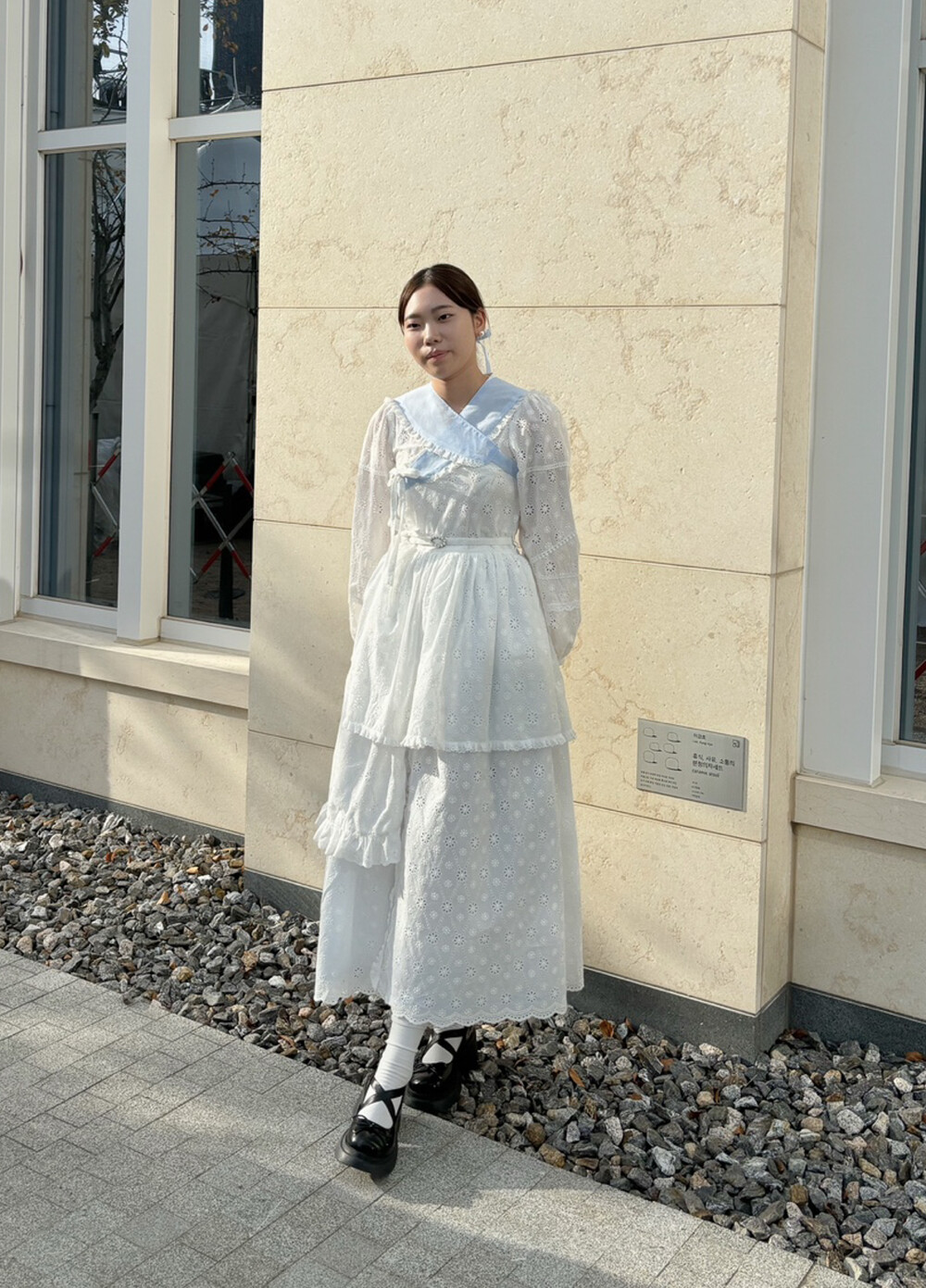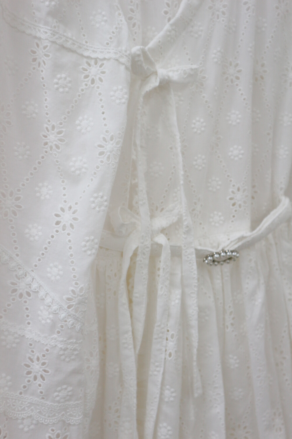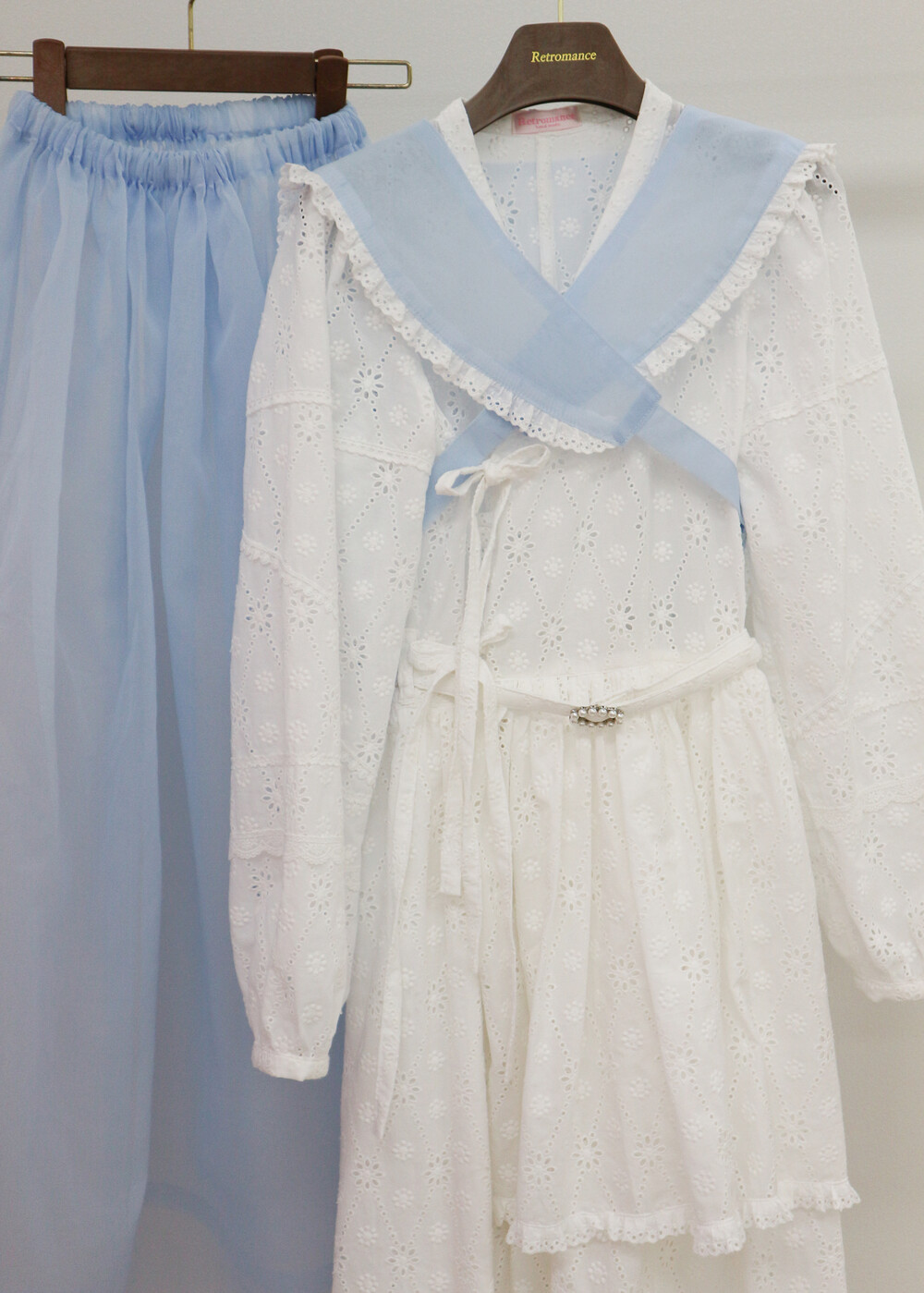 - 펀칭이 있는 면 레이스 원단으로 제작된 3단의 슬릿 철릭 원피스입니다. 원단에 펀칭이 있어 안이 비치는게 포인트로 하늘색 노방 속치마가 포함되어있는 상품으로 활동할때 나풀거리는 것이 특징입니다. 치마는 각각 단마다 레이스를 다르게 부착하여 포인트를 주었으며 제일 안쪽단은 레이스의 끝단을 살려 동그란 모양으로 마감되었습니다. 상의 소매는 레이스를 여러개 장식하고 커프스를 얇게 제작하였습니다. 진주벨트로 포인트를 준 상품입니다. 단가가 높은 고급 면 레이스 원단으로 사랑스럽고 독특한 무드의 레트로맨스 만의 슬릿 철릭 원피스입니다. 175cm 기준으로 135cm 기장을 착용하였습니다.