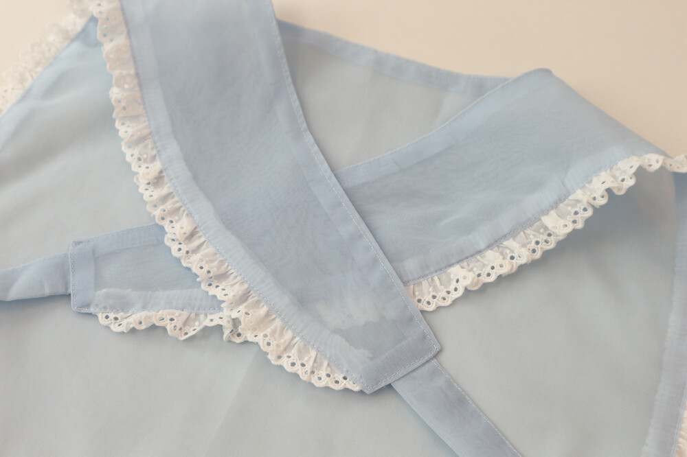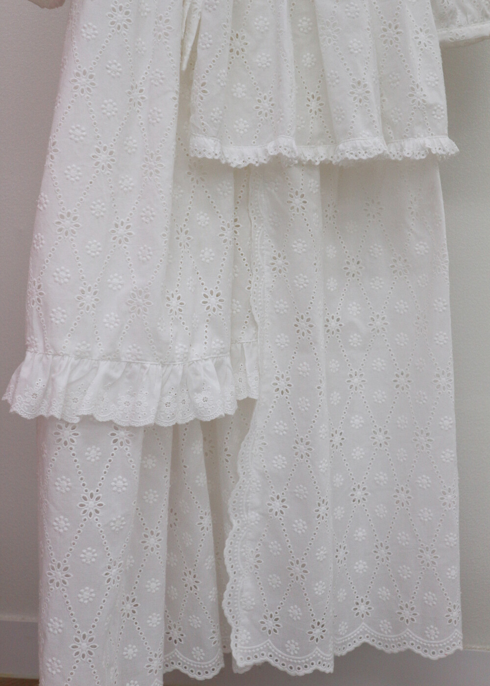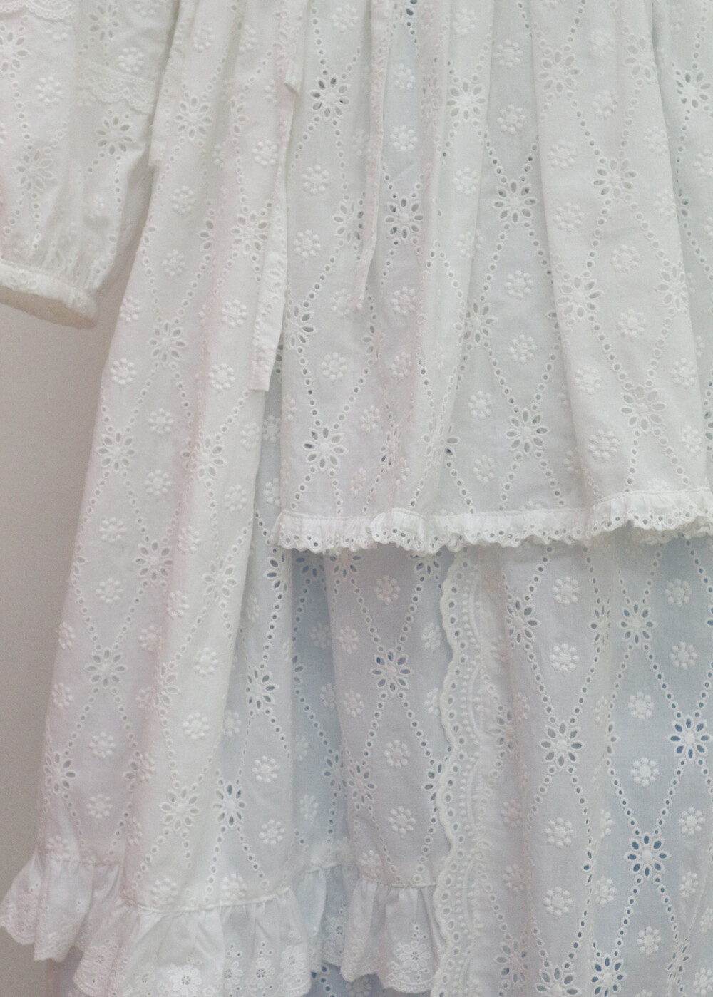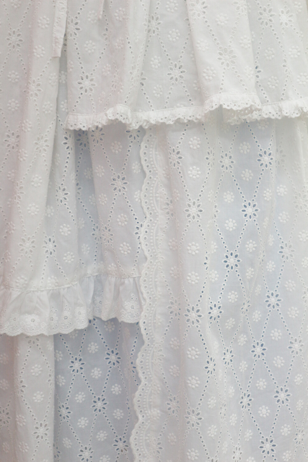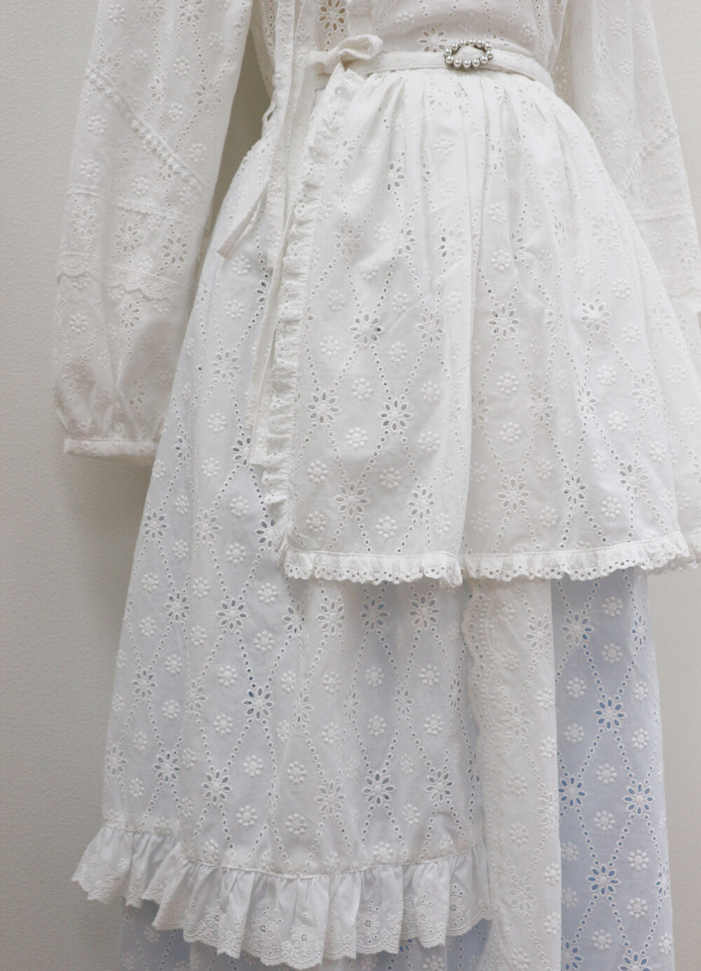 - 펀칭이 있는 면 레이스 원단으로 제작된 3단의 슬릿 철릭 원피스입니다. 원단에 펀칭이 있어 안이 비치는게 포인트로 하늘색 노방 속치마가 포함되어있는 상품으로 활동할때 나풀거리는 것이 특징입니다. 치마는 각각 단마다 레이스를 다르게 부착하여 포인트를 주었으며 제일 안쪽단은 레이스의 끝단을 살려 동그란 모양으로 마감되었습니다. 상의 소매는 레이스를 여러개 장식하고 커프스를 얇게 제작하였습니다. 진주벨트로 포인트를 준 상품입니다. 단가가 높은 고급 면 레이스 원단으로 사랑스럽고 독특한 무드의 레트로맨스 만의 슬릿 철릭 원피스입니다. 175cm 기준으로 135cm 기장을 착용하였습니다.
