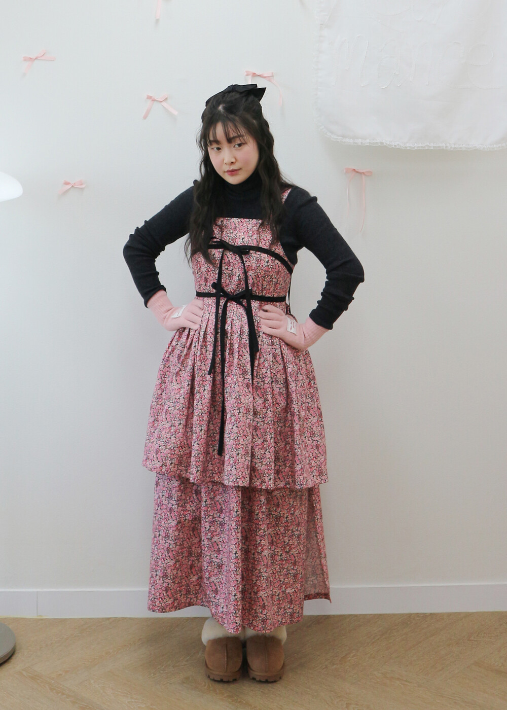 검정 바탕에 플라워 패턴의 면 원단으로 제작 된 2단 말기원피스입니다.