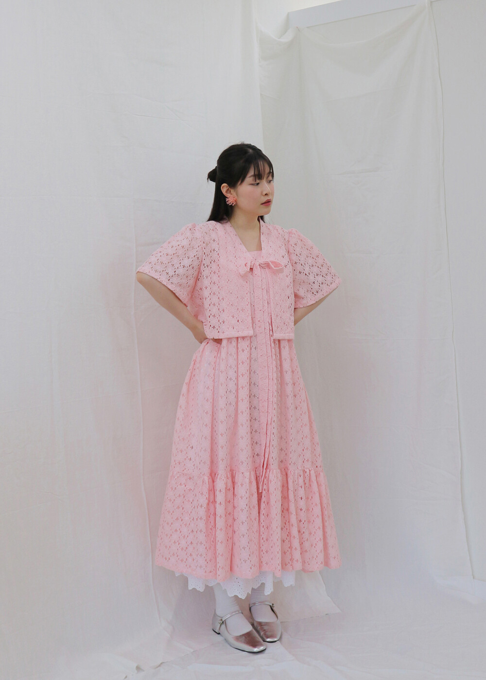 목선과 도련선 어깨선을 따라서 펀칭 프릴 레이스를 달아주어