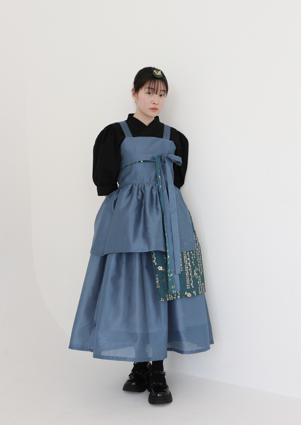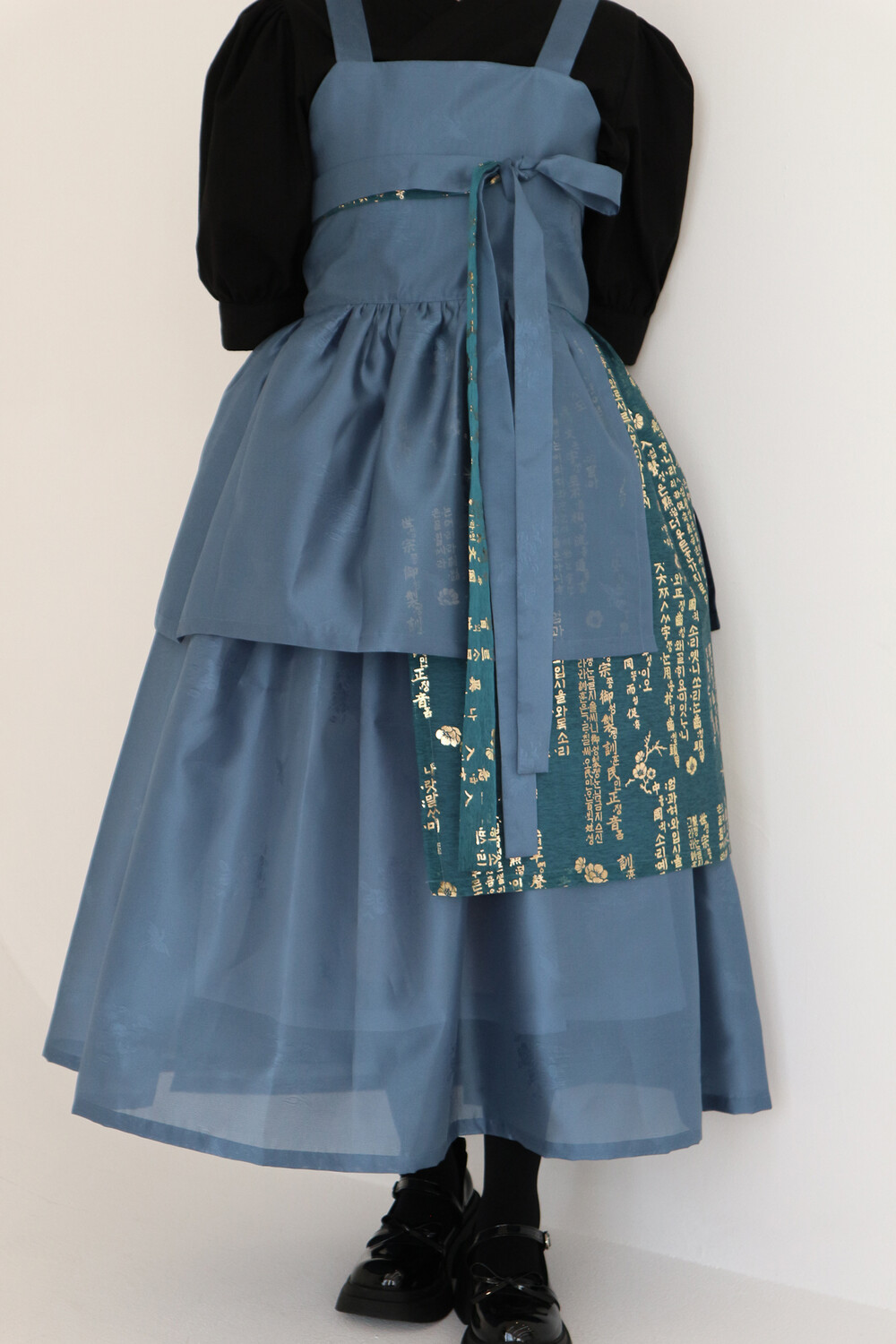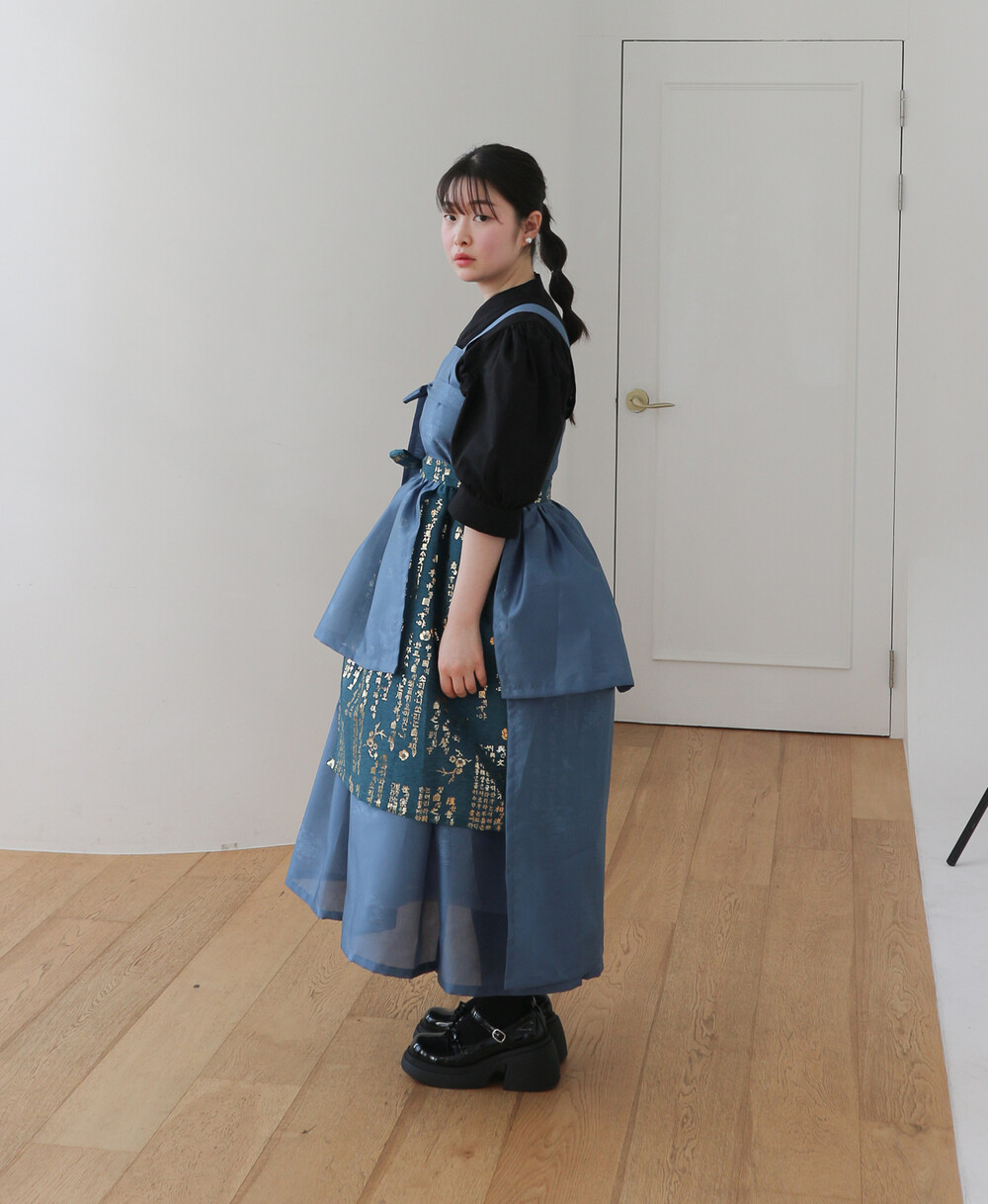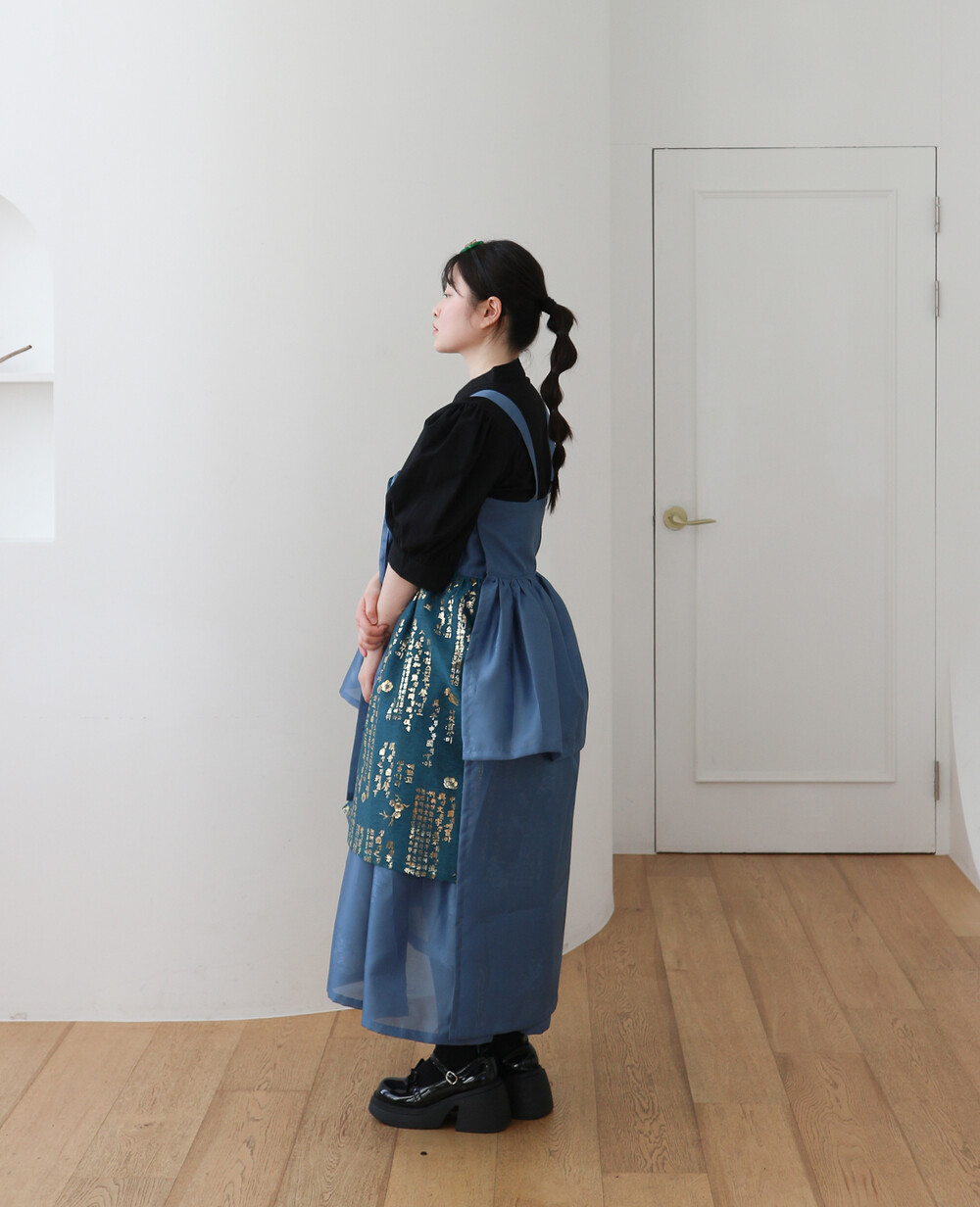 한복 원단 소담견으로 제작한 톤 다운 된 블루 컬러의 겹 말기 원피스입니다.