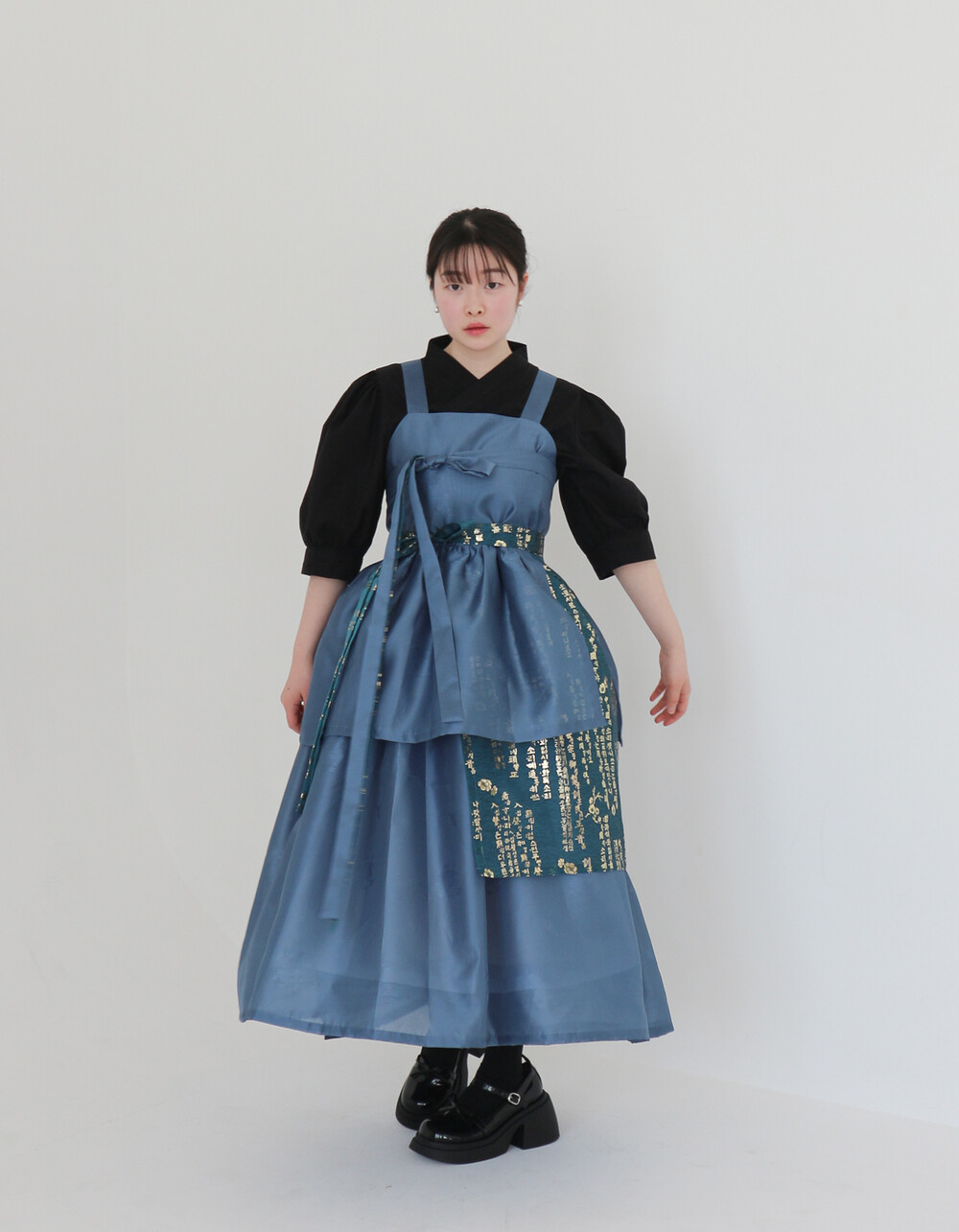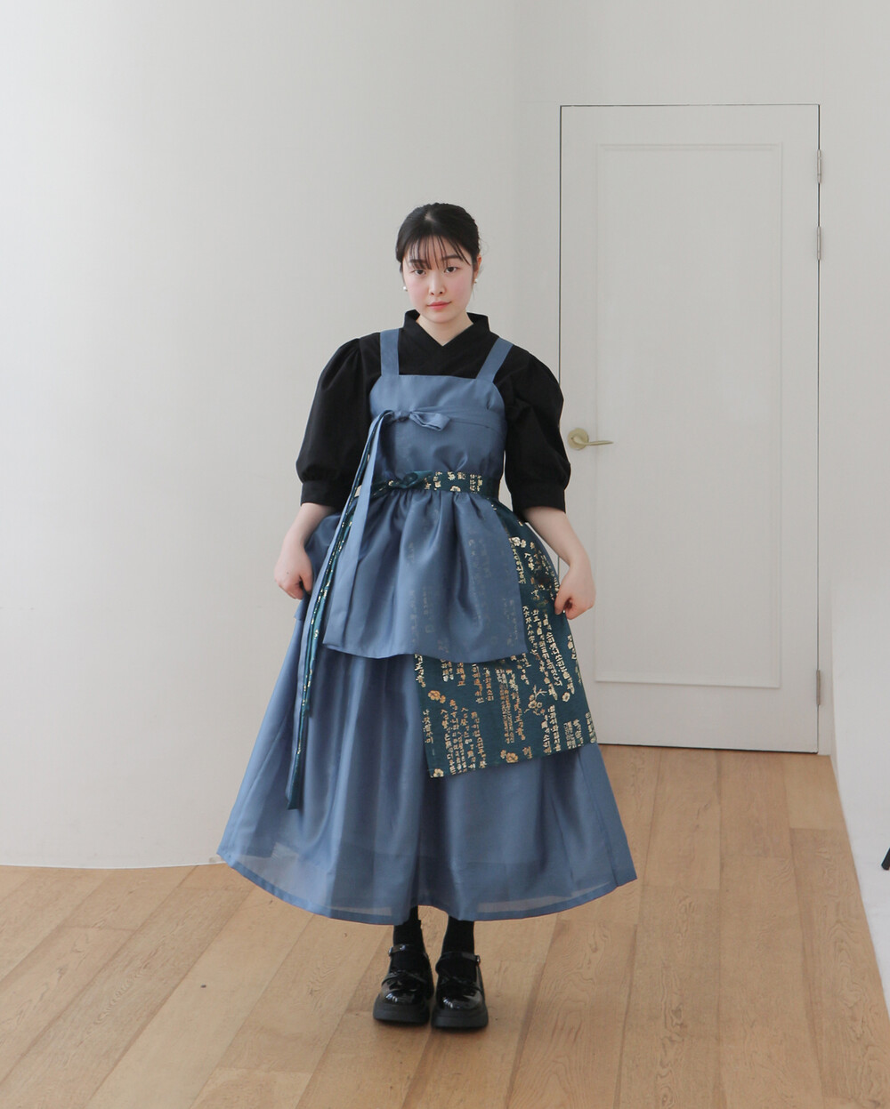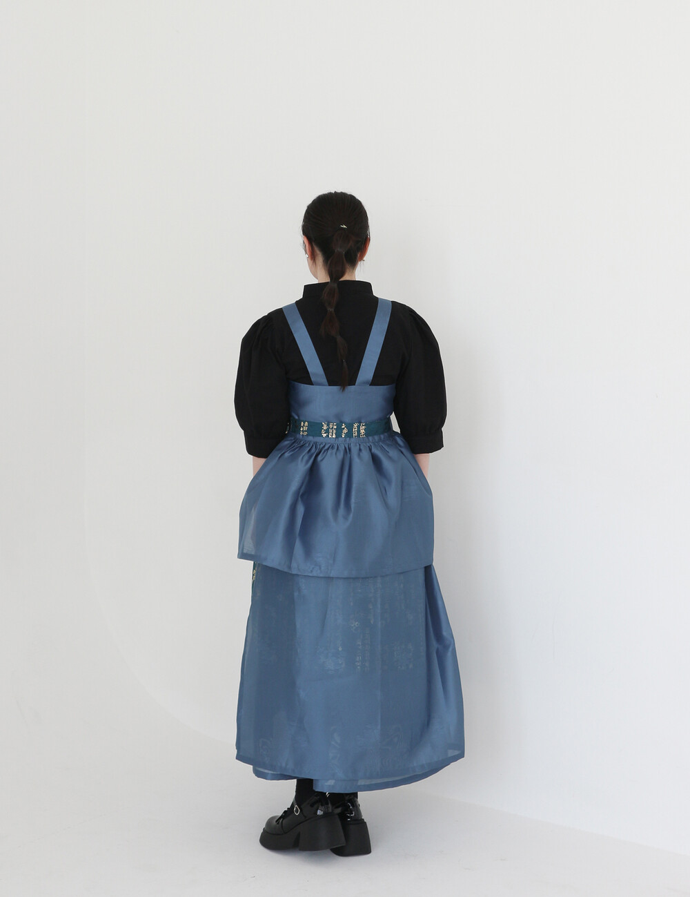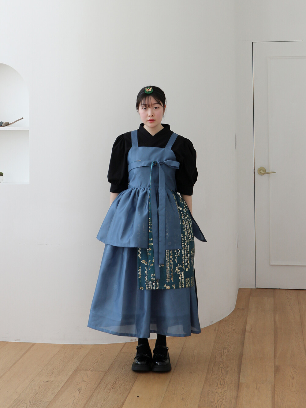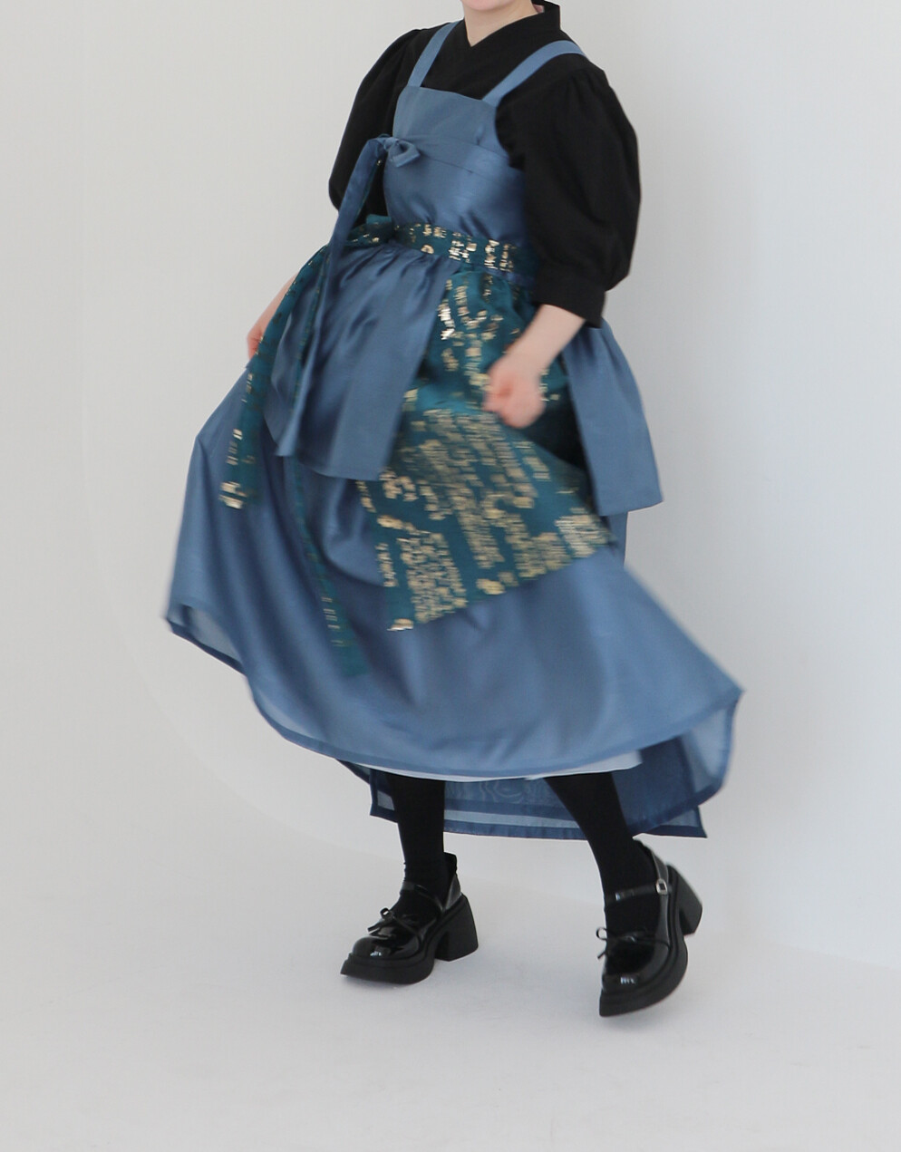 한복 원단 소담견으로 제작한 톤 다운 된 블루 컬러의 겹 말기 원피스입니다.