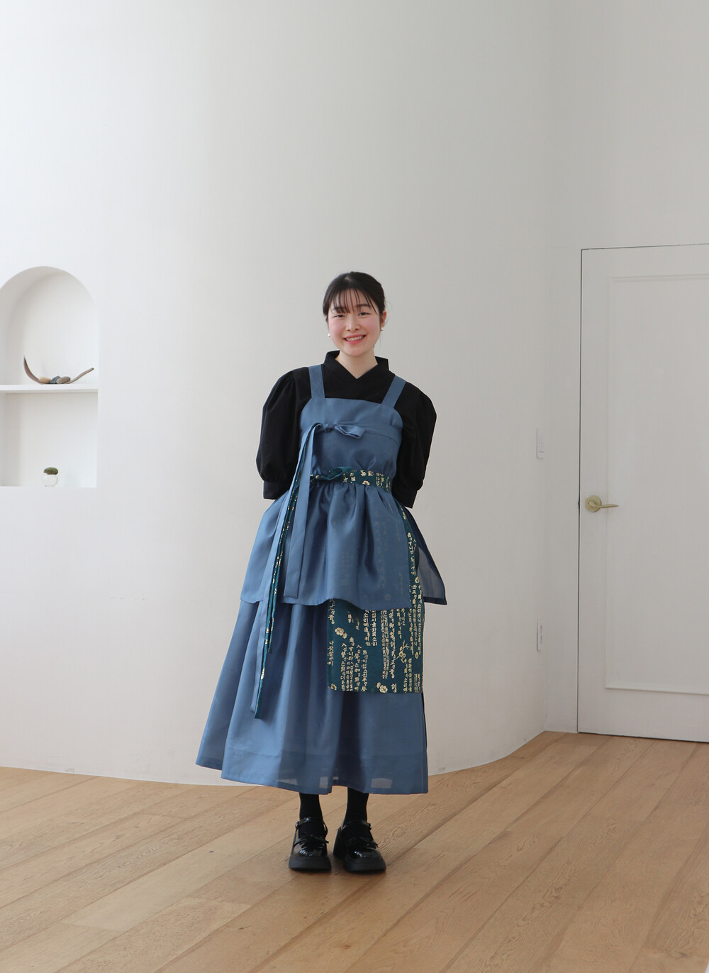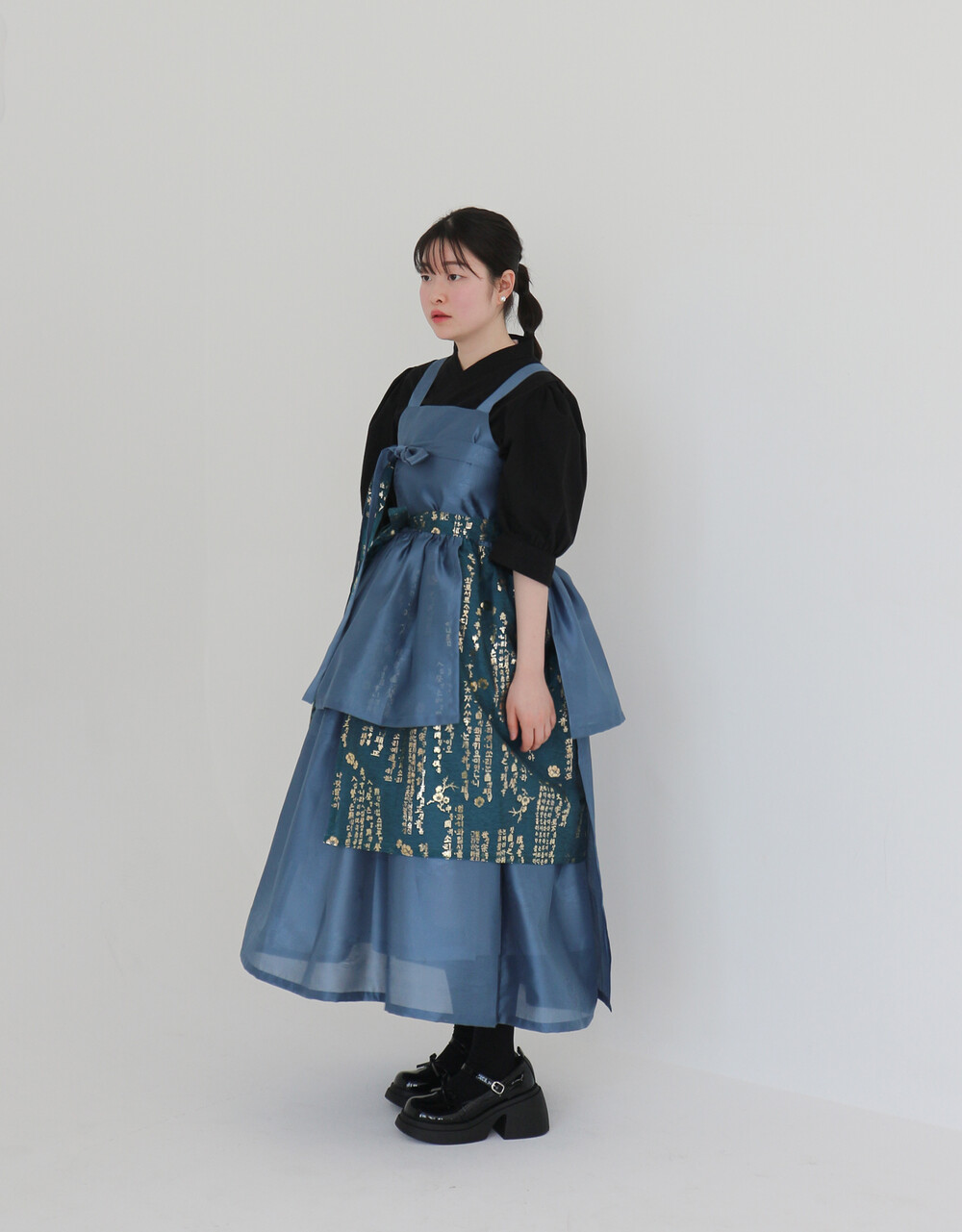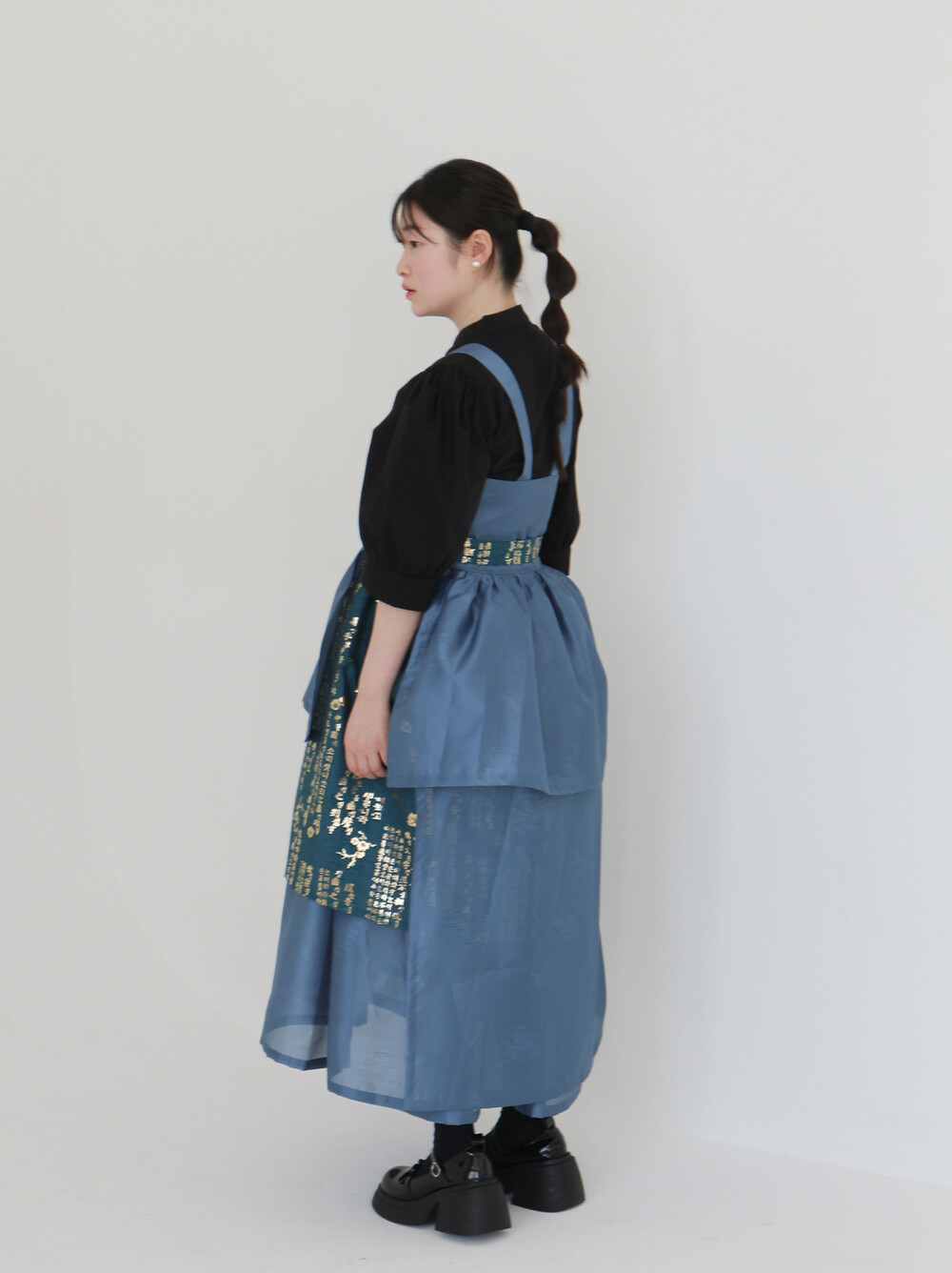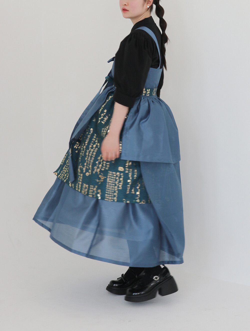 한복 원단 소담견으로 제작한 톤 다운 된 블루 컬러의 겹 말기 원피스입니다.