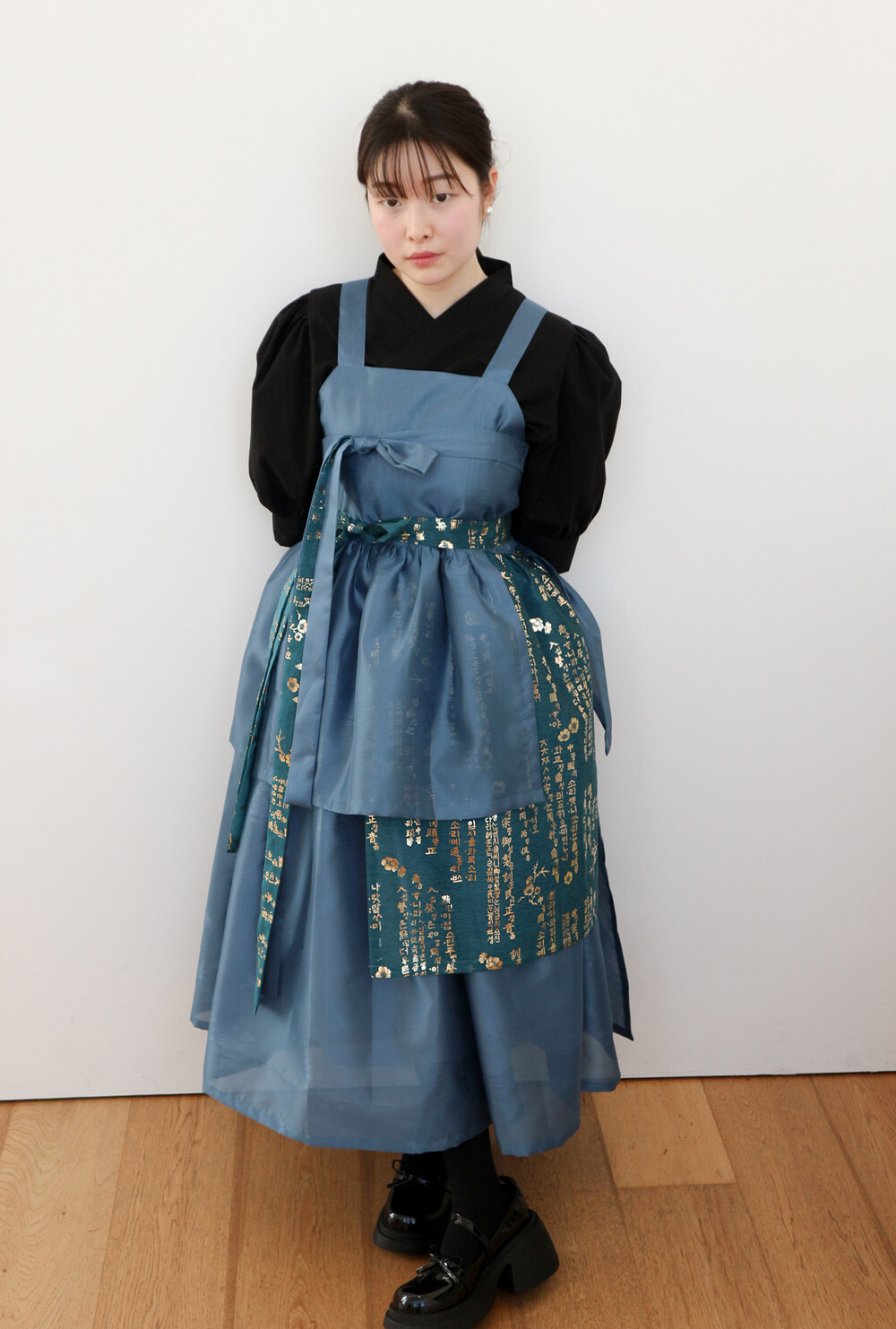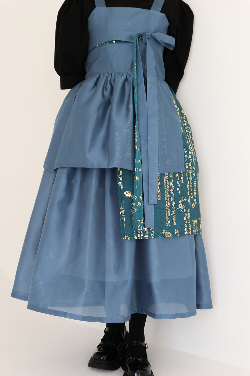 청록색의 유니크한 금박 한글원단과 믹스매치하여 전통한복 원단의 고급스러움을 느껴볼 수 있습니다.