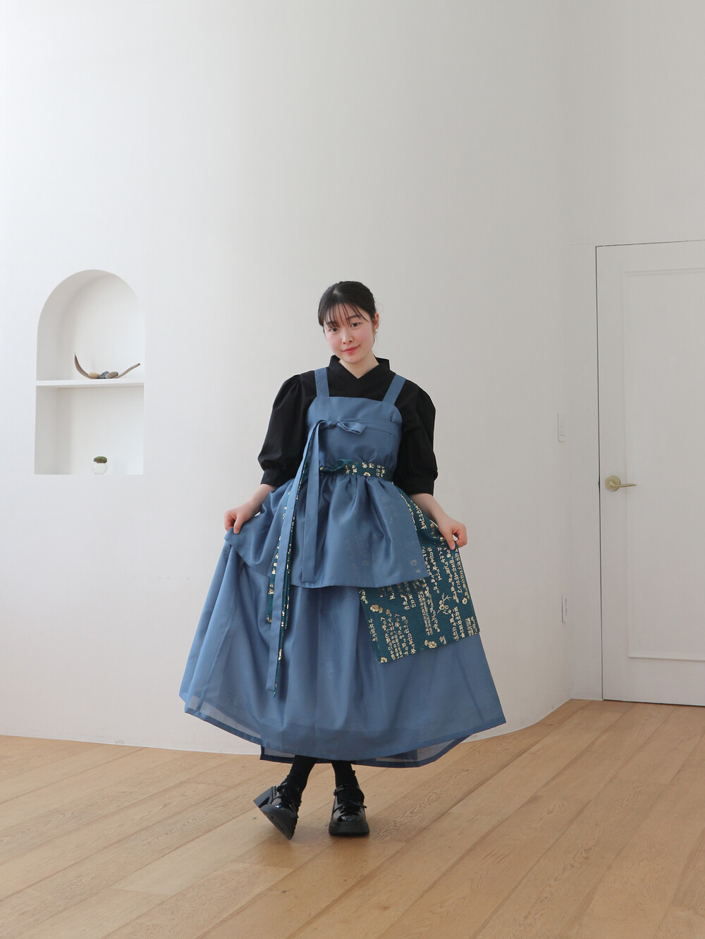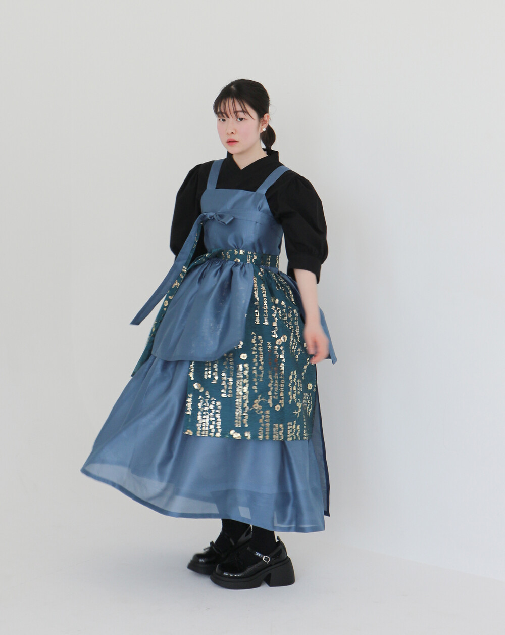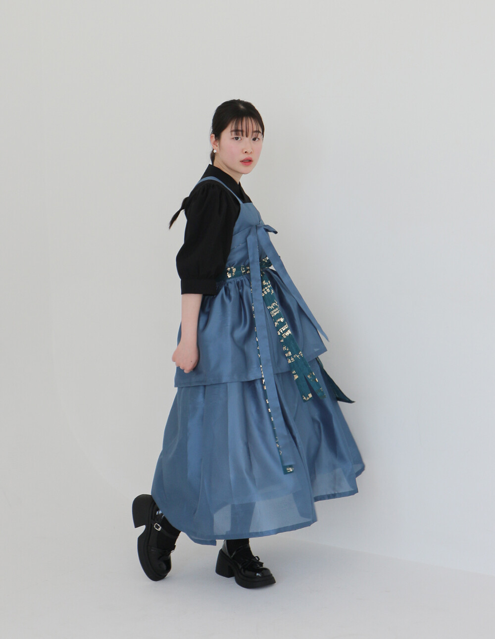 치마는 폭을 넓게하여 총 3겹으로 제작하였으며 각각 기장을 다르게 레이어드하여서 실루엣이 독특하고