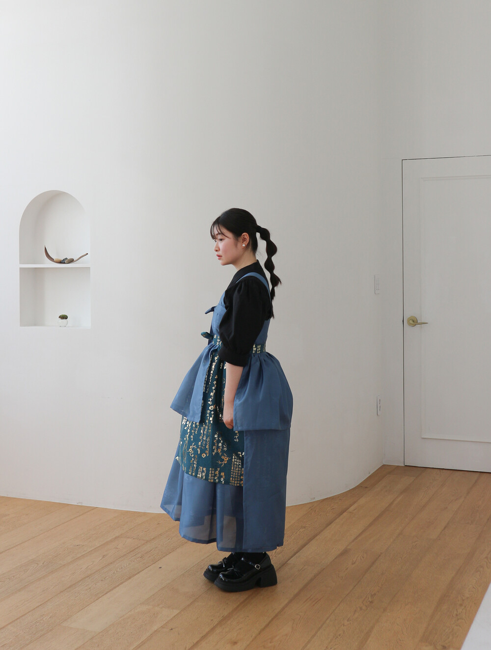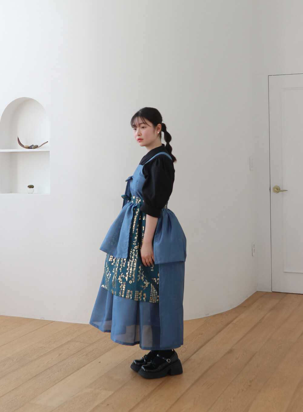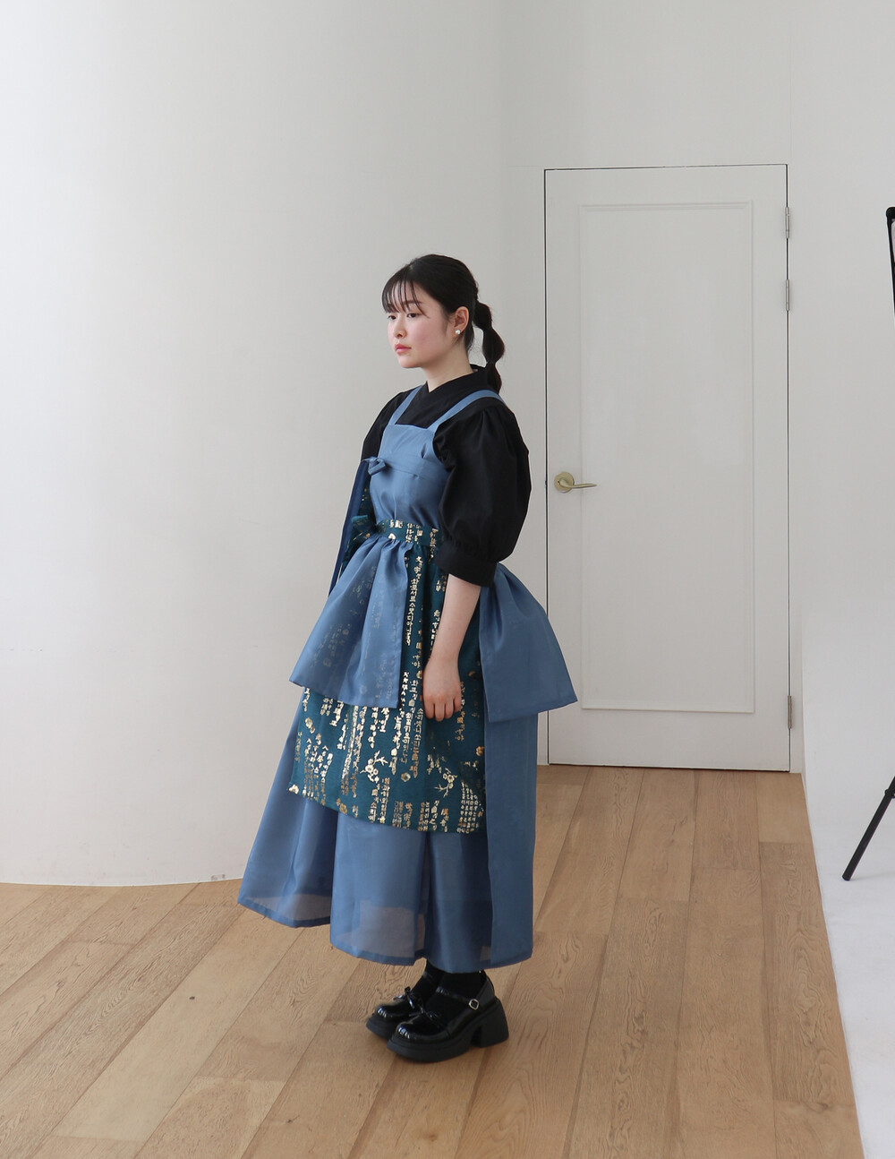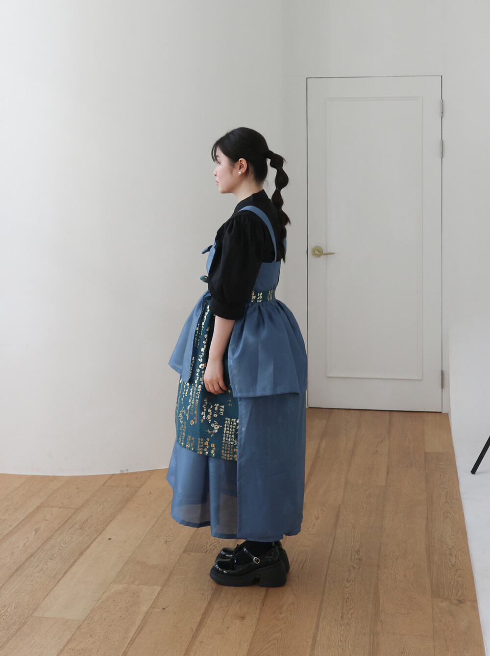 치마는 폭을 넓게하여 총 3겹으로 제작하였으며 각각 기장을 다르게 레이어드하여서 실루엣이 독특하고
