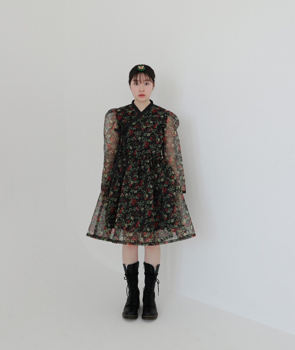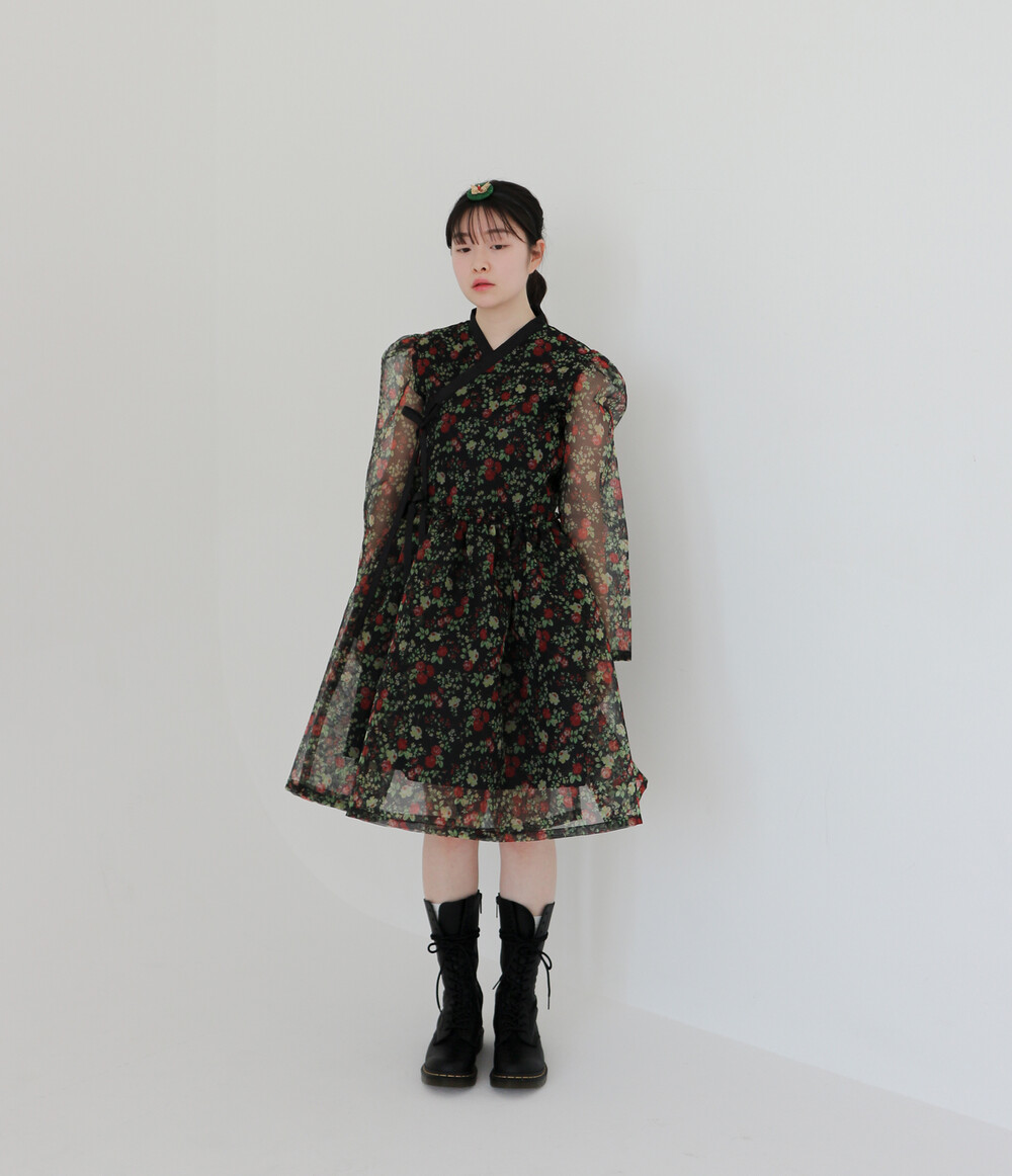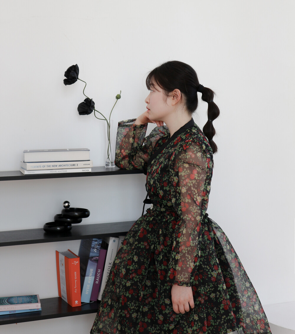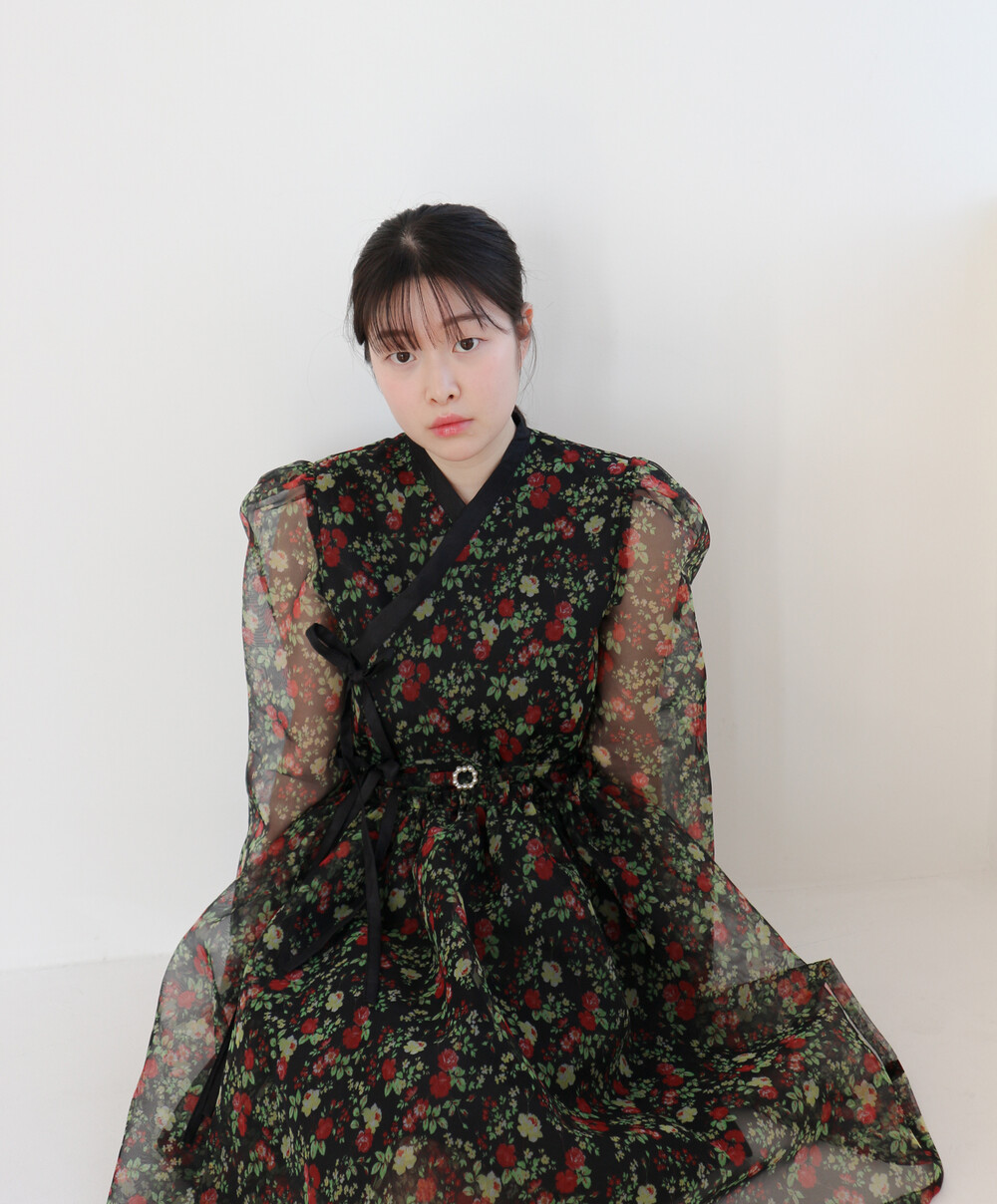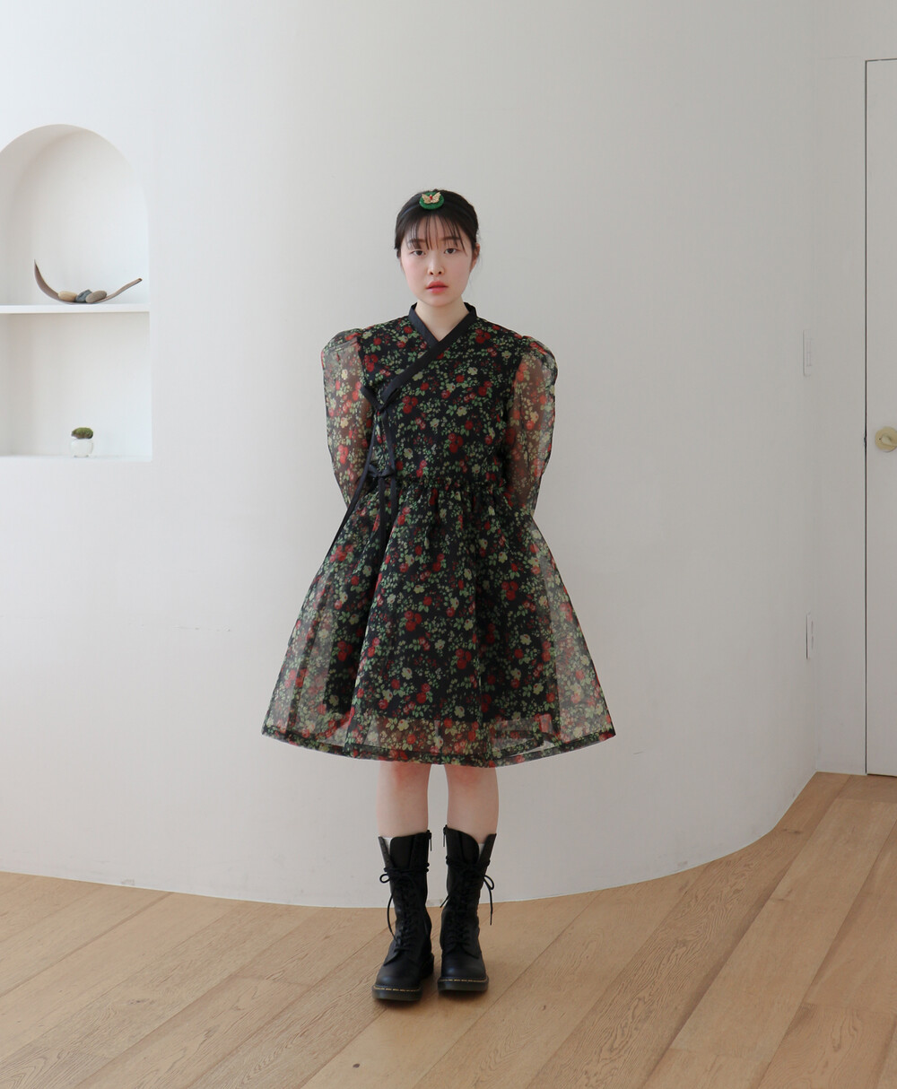 원단이 풍성하게 살아나는 힘있는 노방원단으로 제작 된 블랙 플라워 노방원피스입니다.