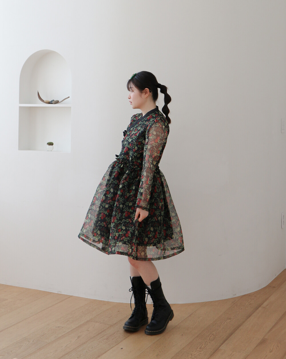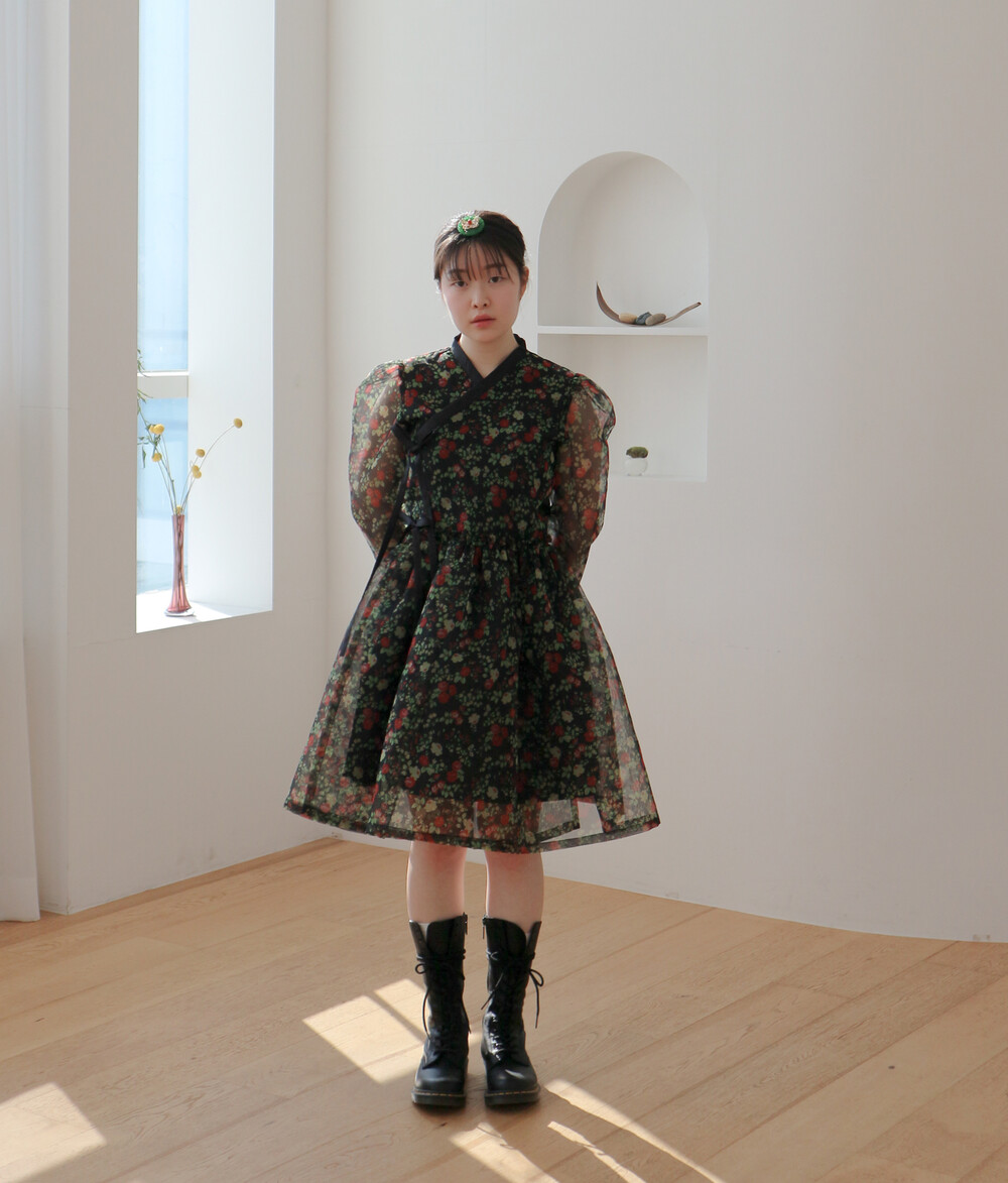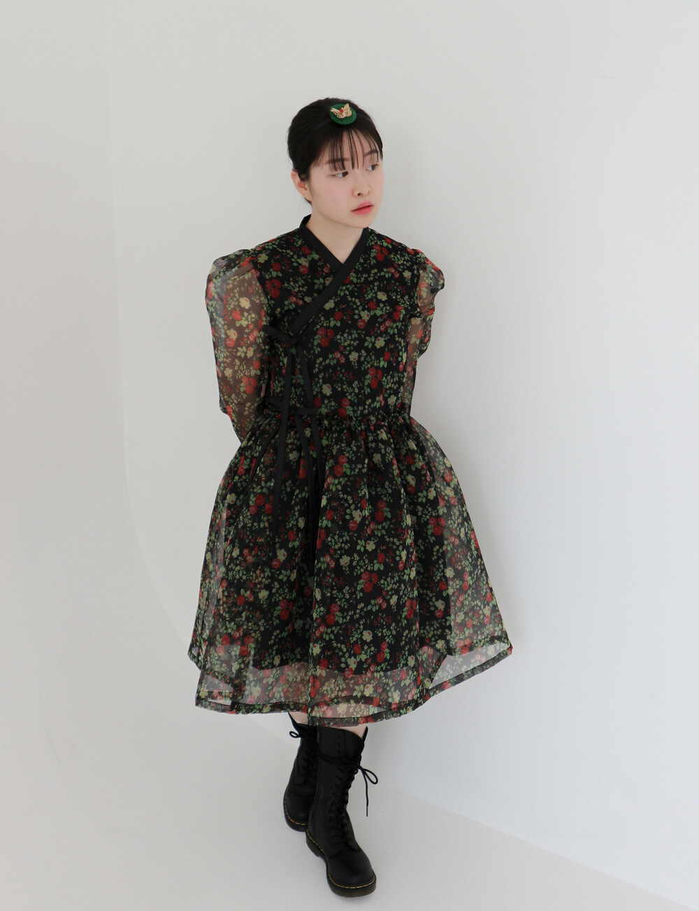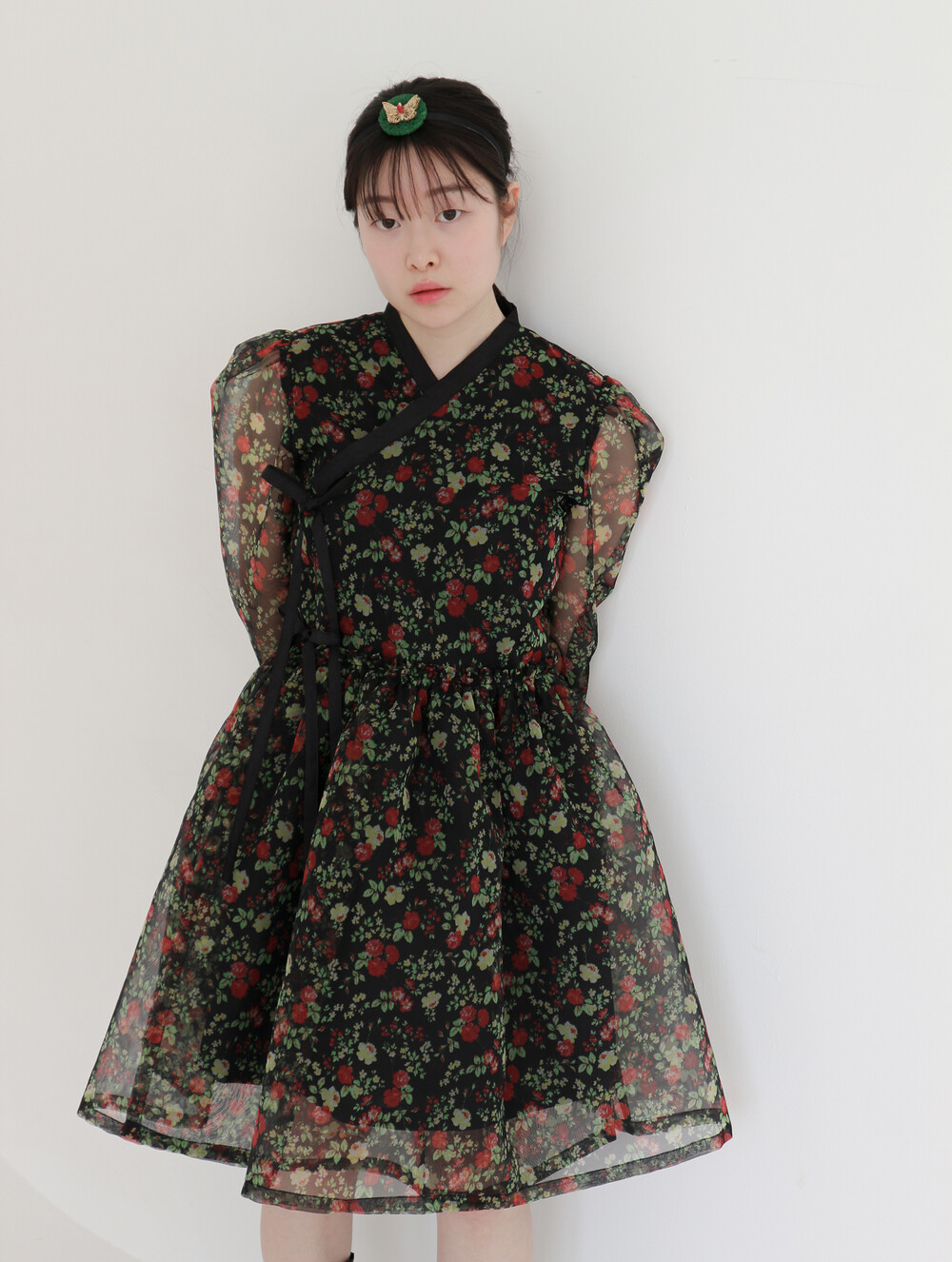 원단이 풍성하게 살아나는 힘있는 노방원단으로 제작 된 블랙 플라워 노방원피스입니다.