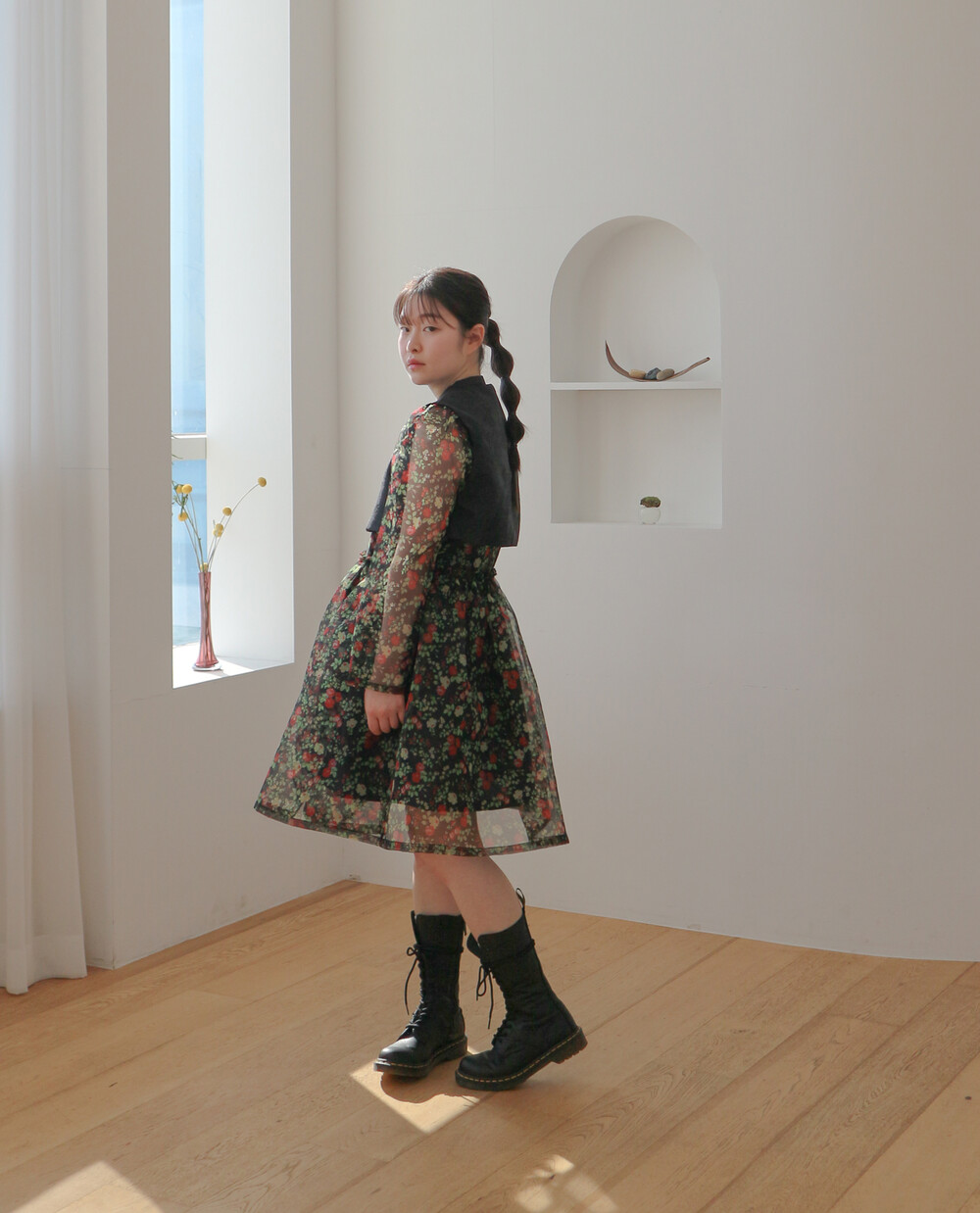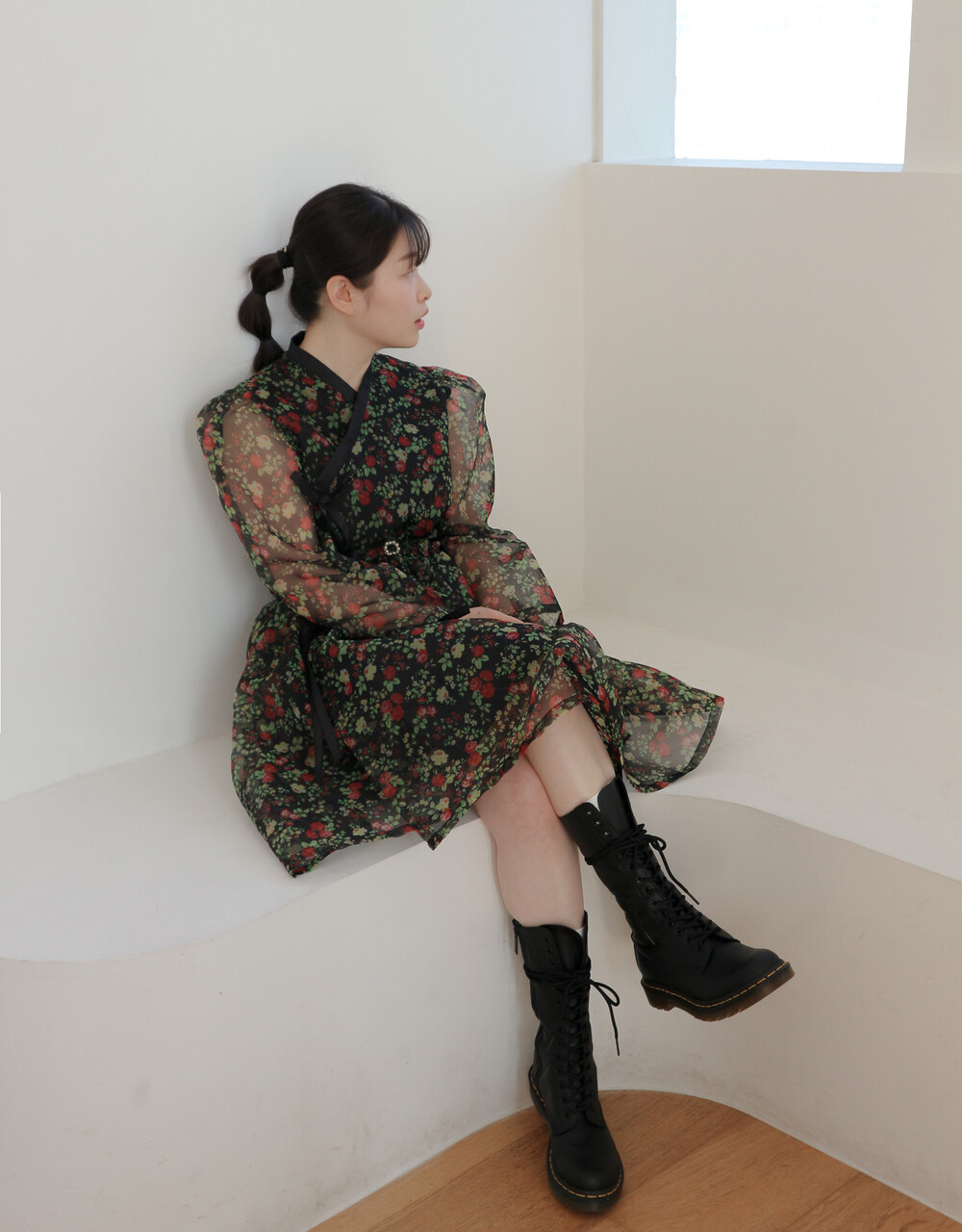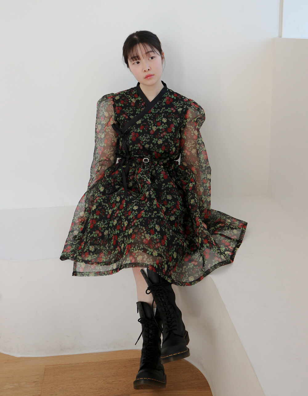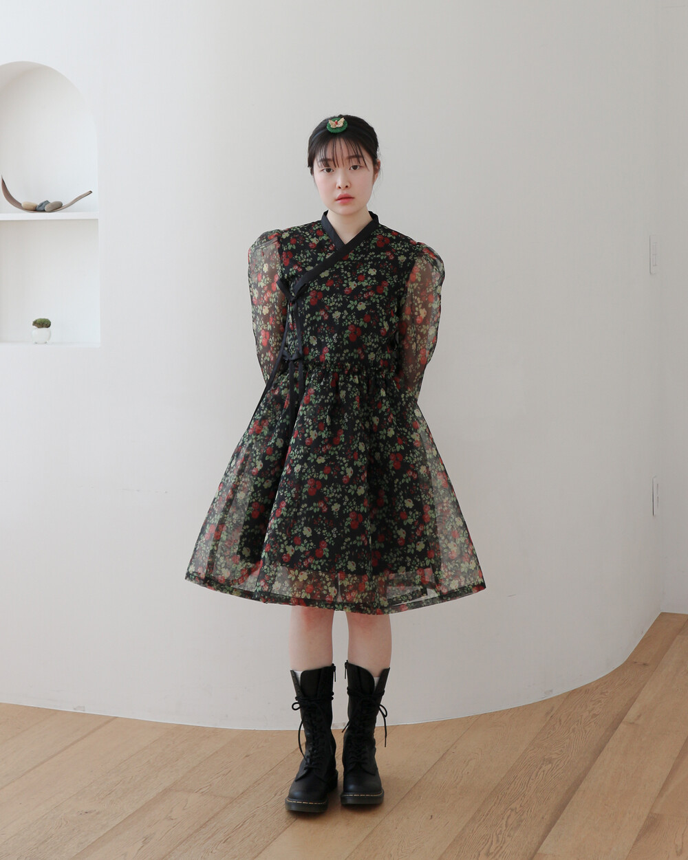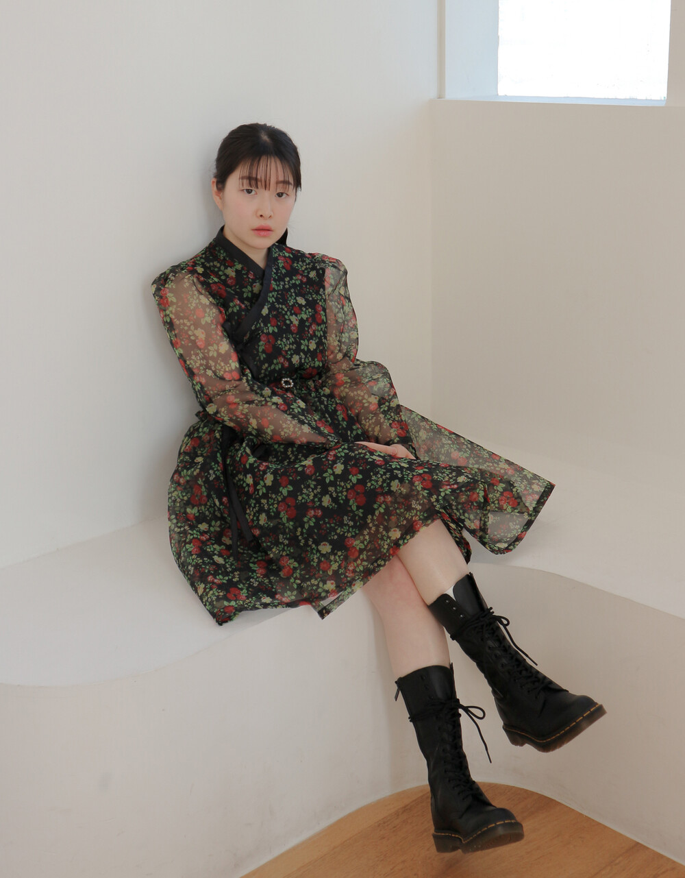 원단이 풍성하게 살아나는 힘있는 노방원단으로 제작 된 블랙 플라워 노방원피스입니다.