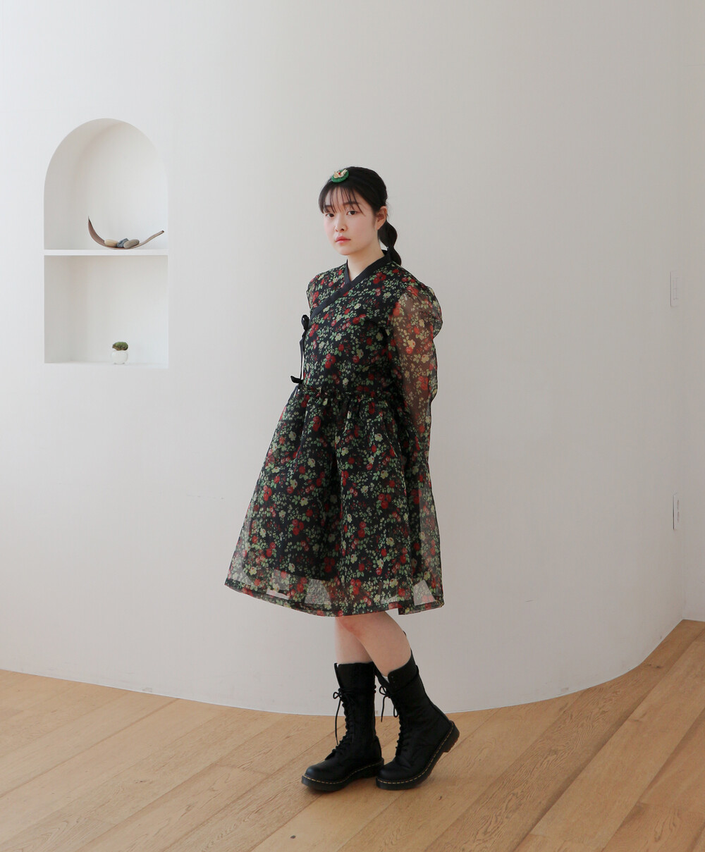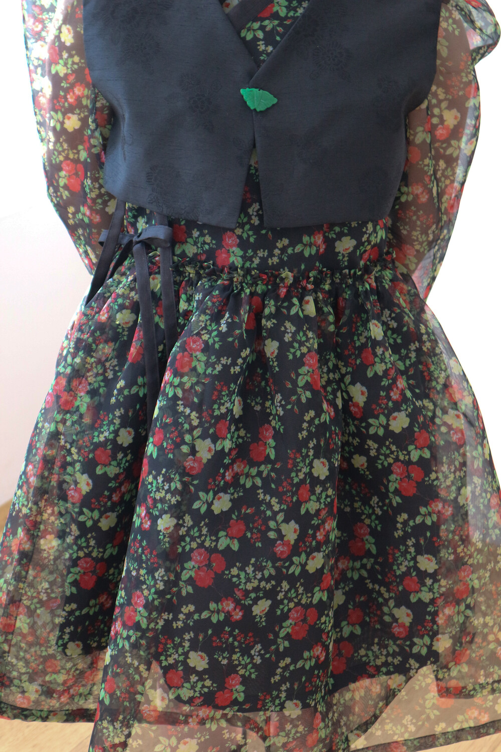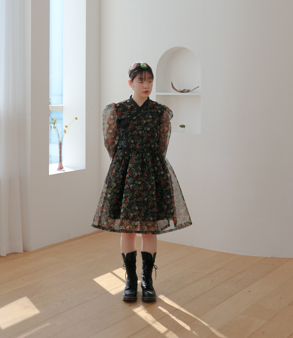 치마 아랫단 쪽과 소매부분만 비침이 있는 디자인으로 제작하였습니다. 풍성한 어깨퍼프와