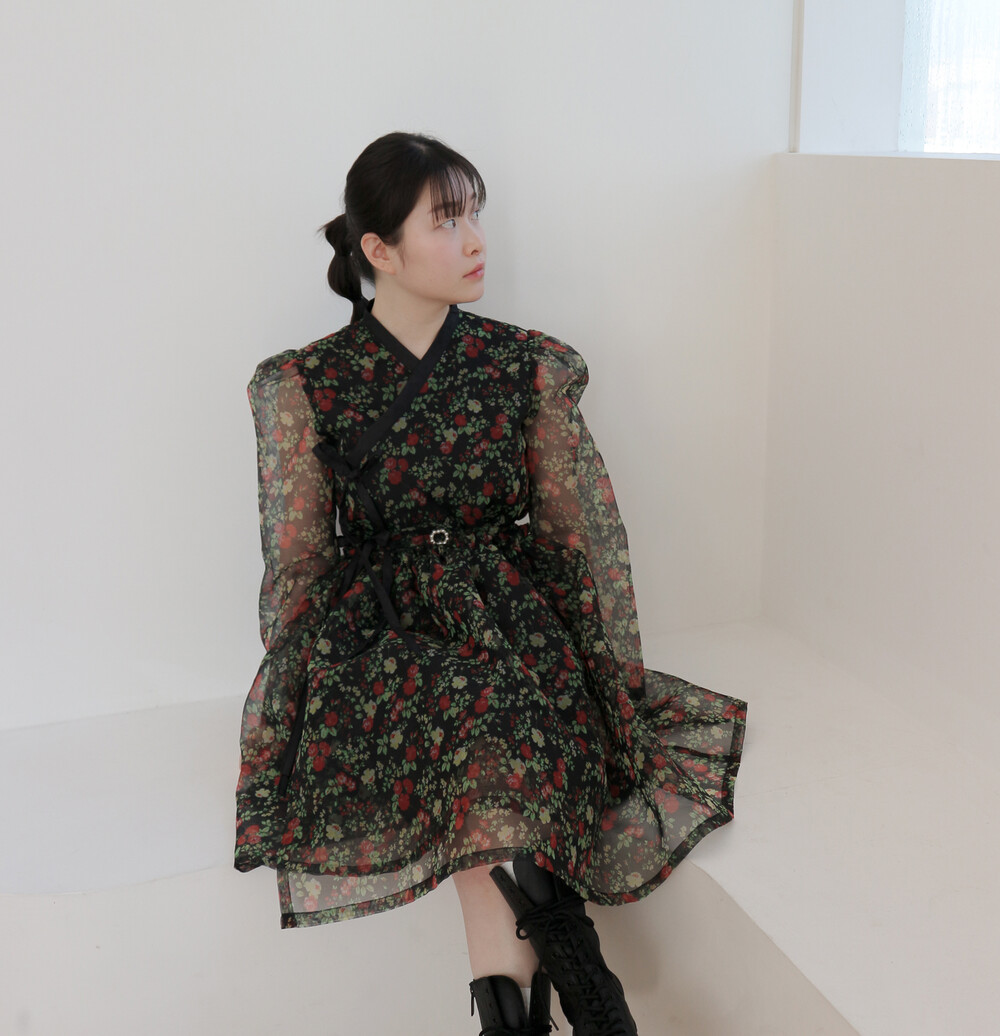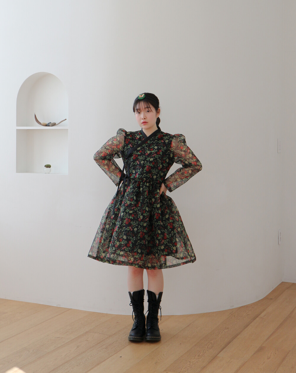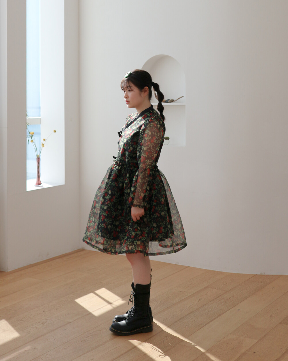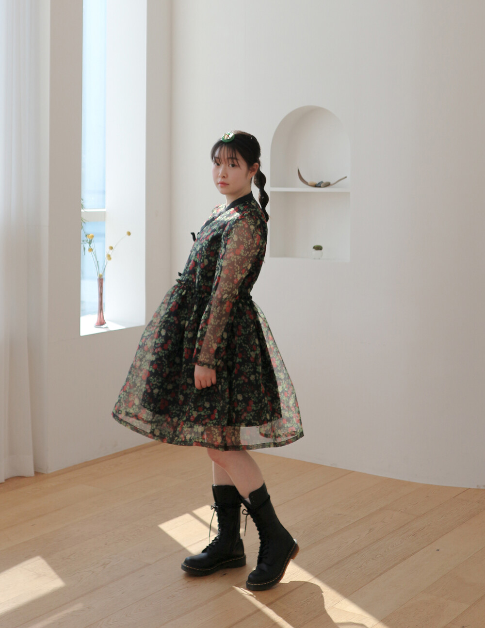치마 아랫단 쪽과 소매부분만 비침이 있는 디자인으로 제작하였습니다. 풍성한 어깨퍼프와