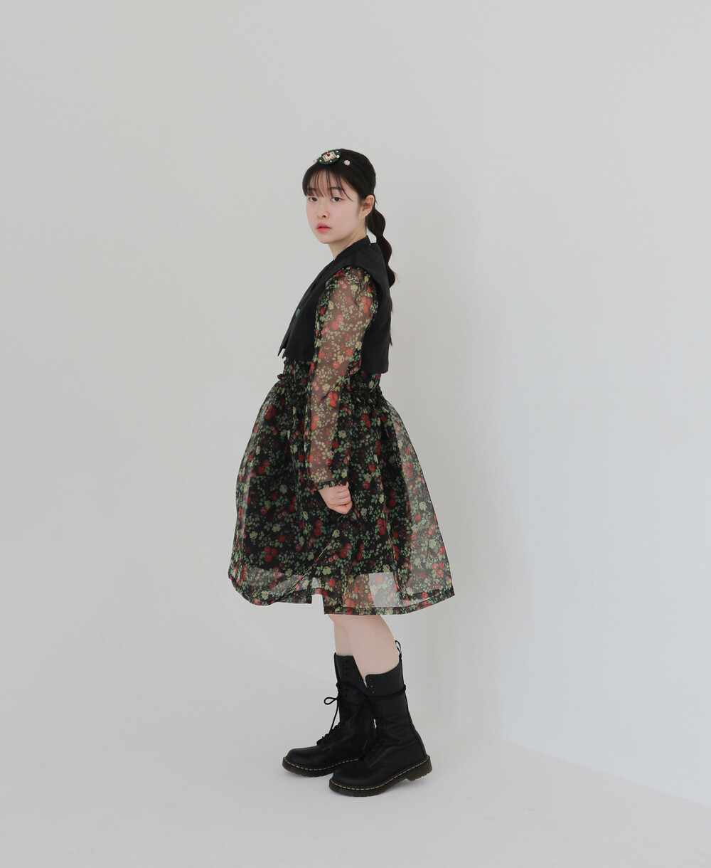 풍성한 치마 실루엣에 치마부분을 상의와 연결할 때 시접을 말아 위로 올려 셔링디테일을 주었습니다.