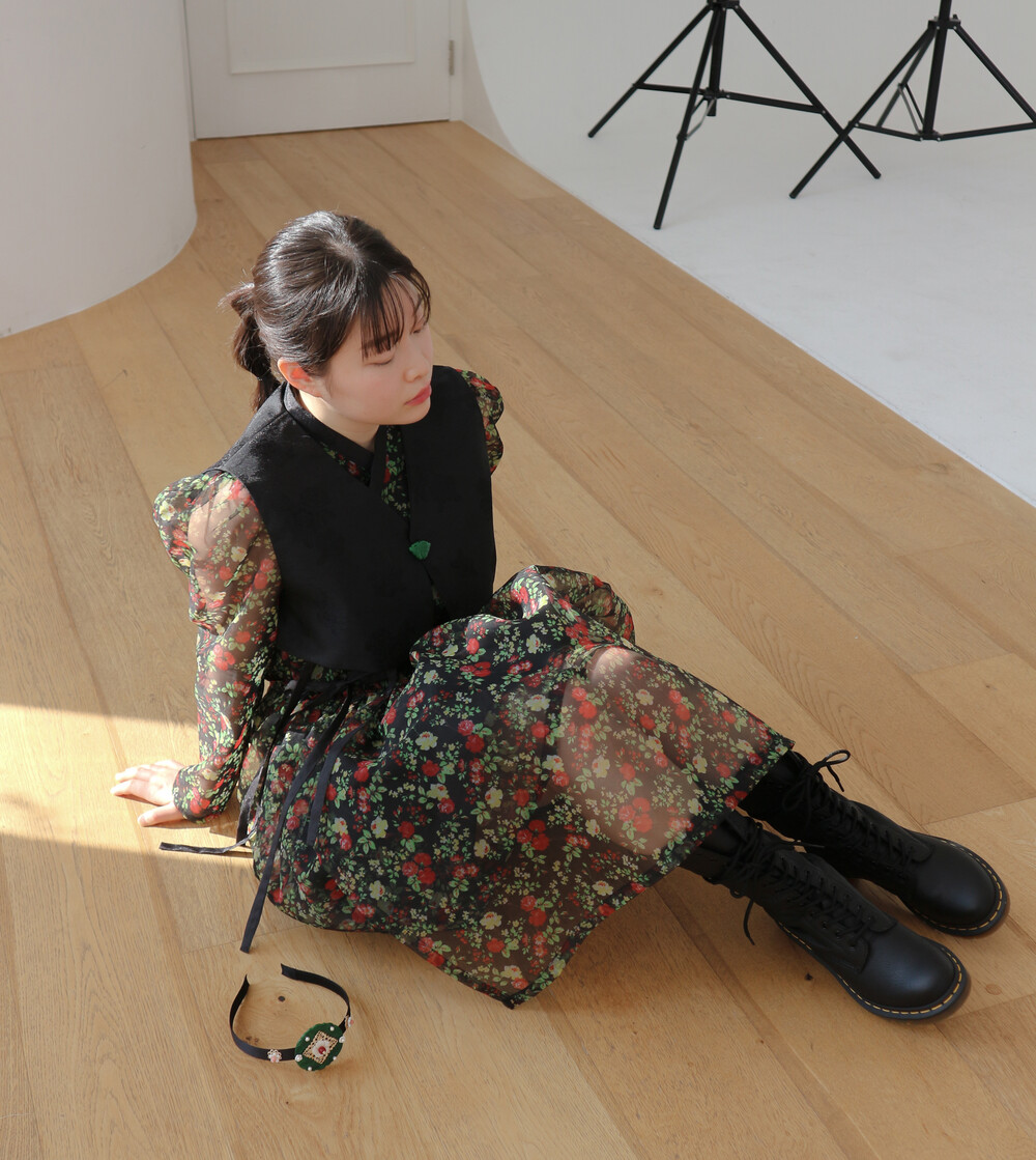 치마는 안감과 겉감의 길이가 차이나도록 제작하여 은은하게 비치는 포인트가 있고