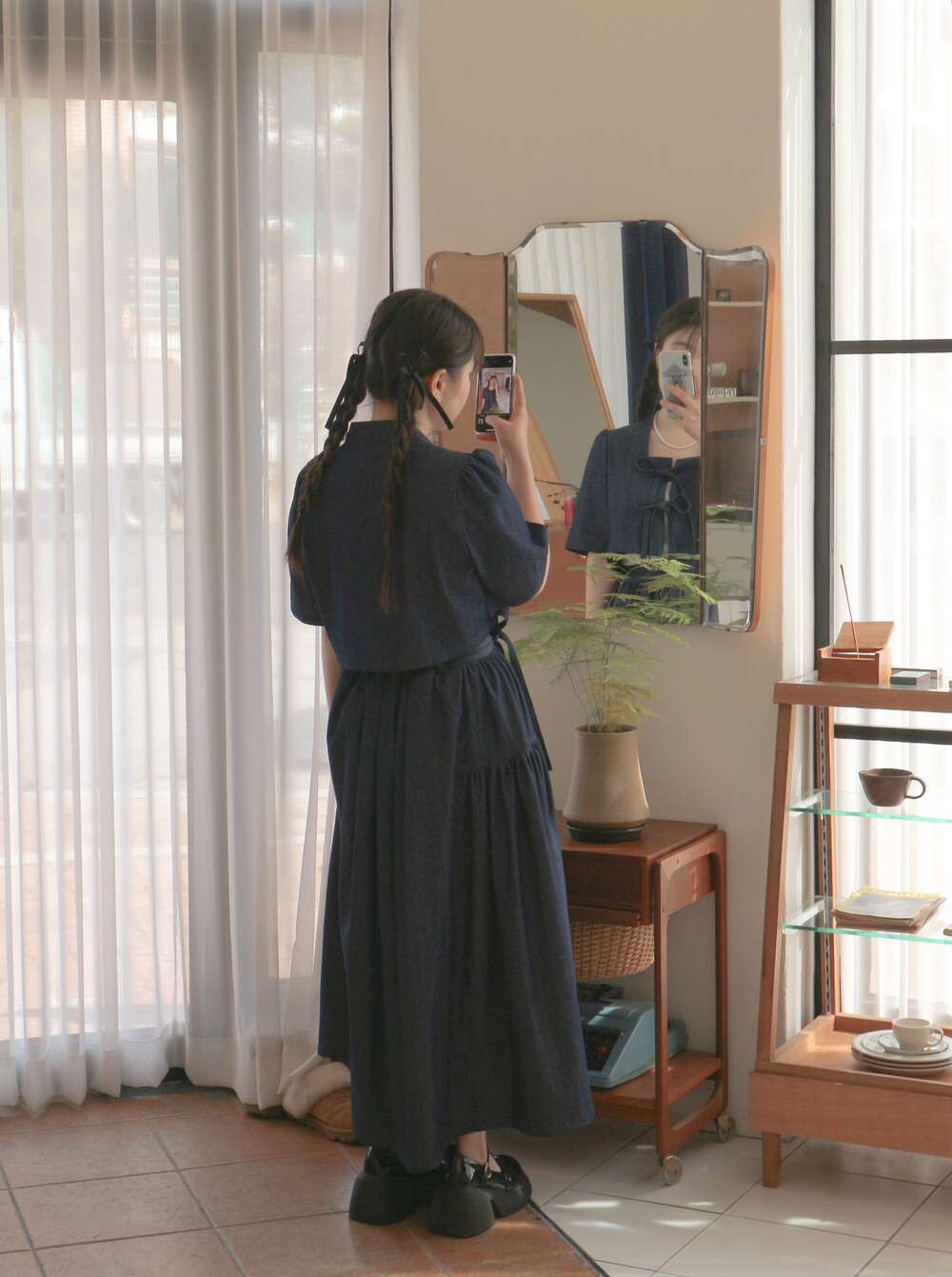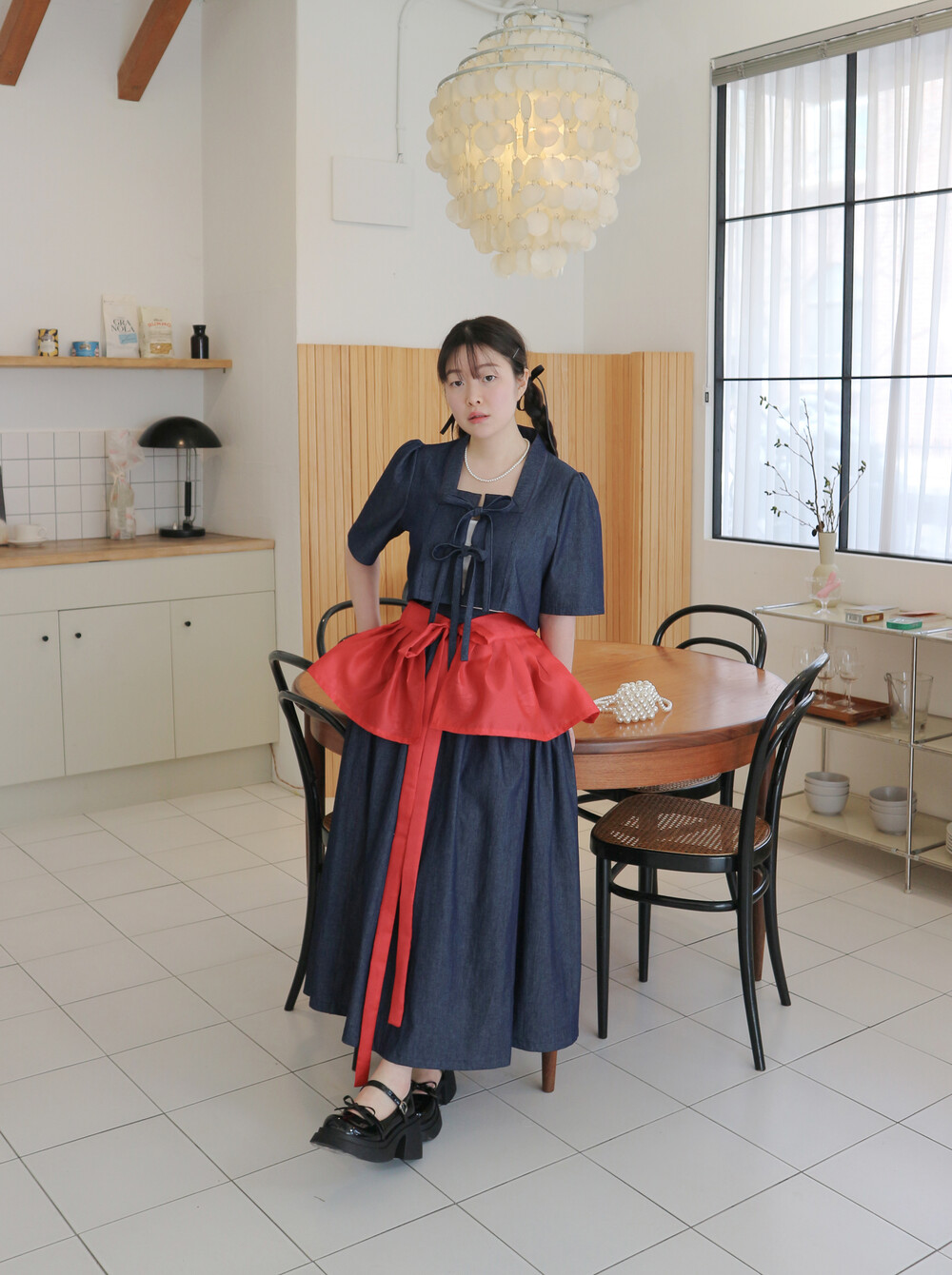 가벼운 데님 원단으로 제작 된 방령깃 저고리와 액주름 밴딩 치마입니다.