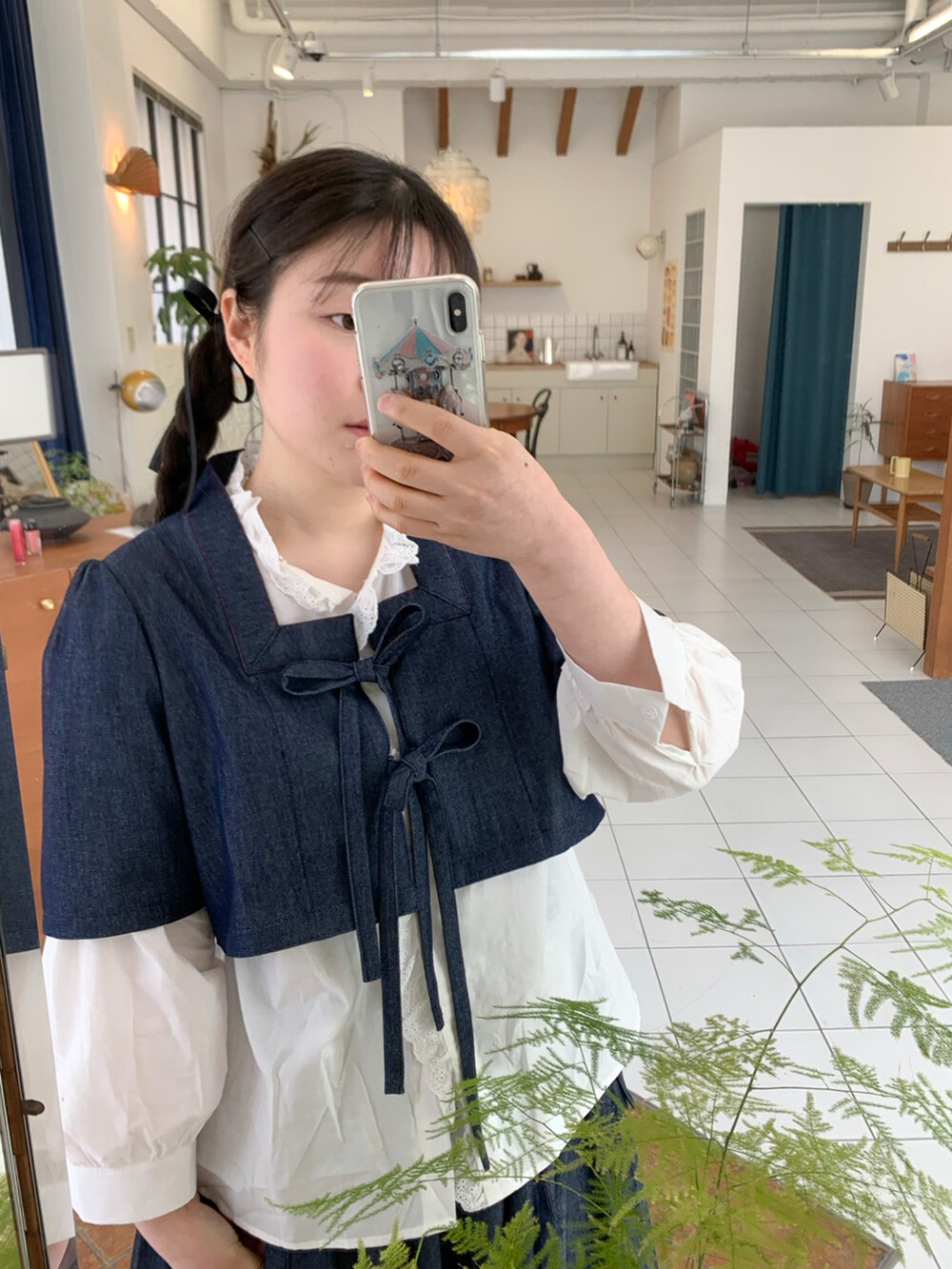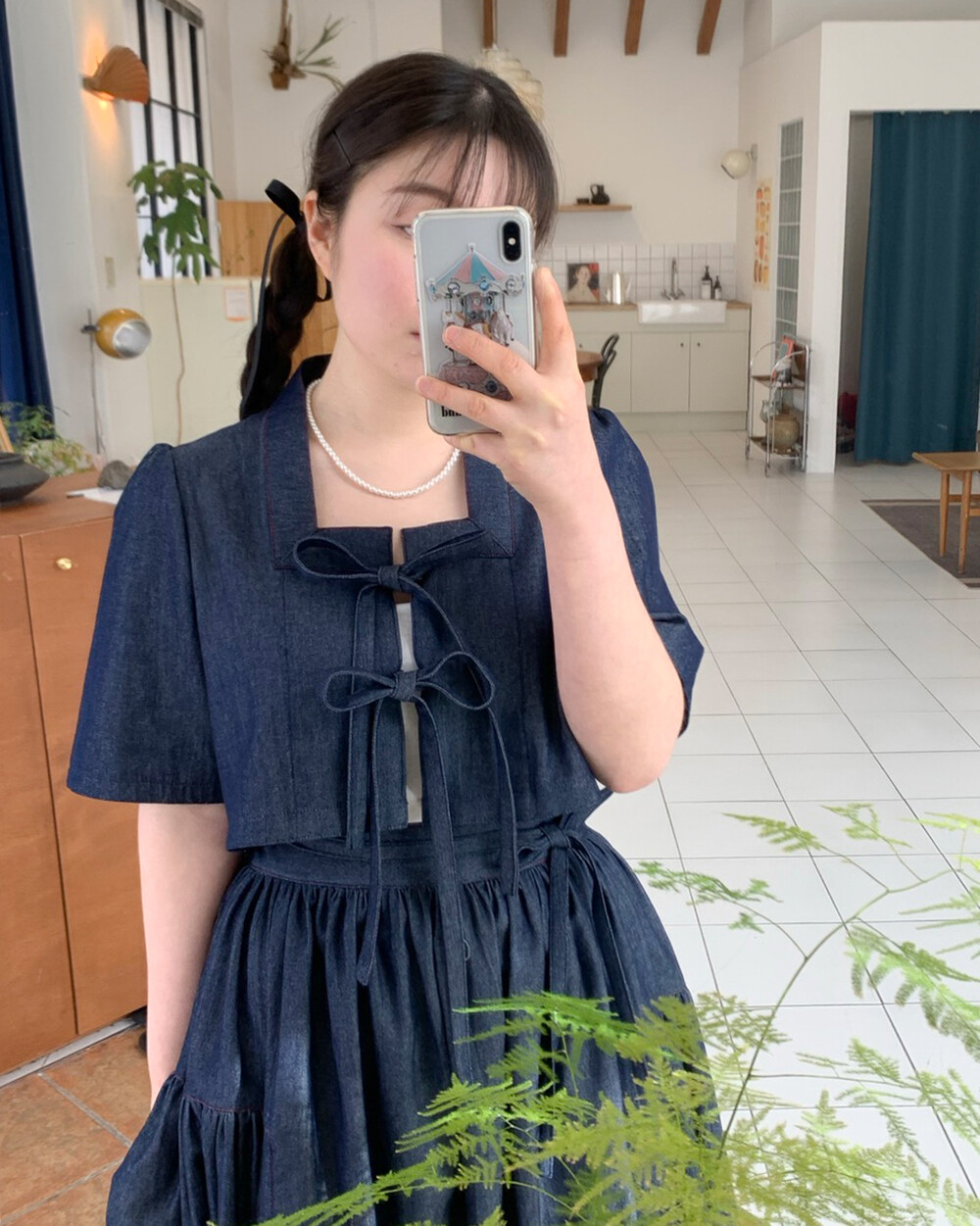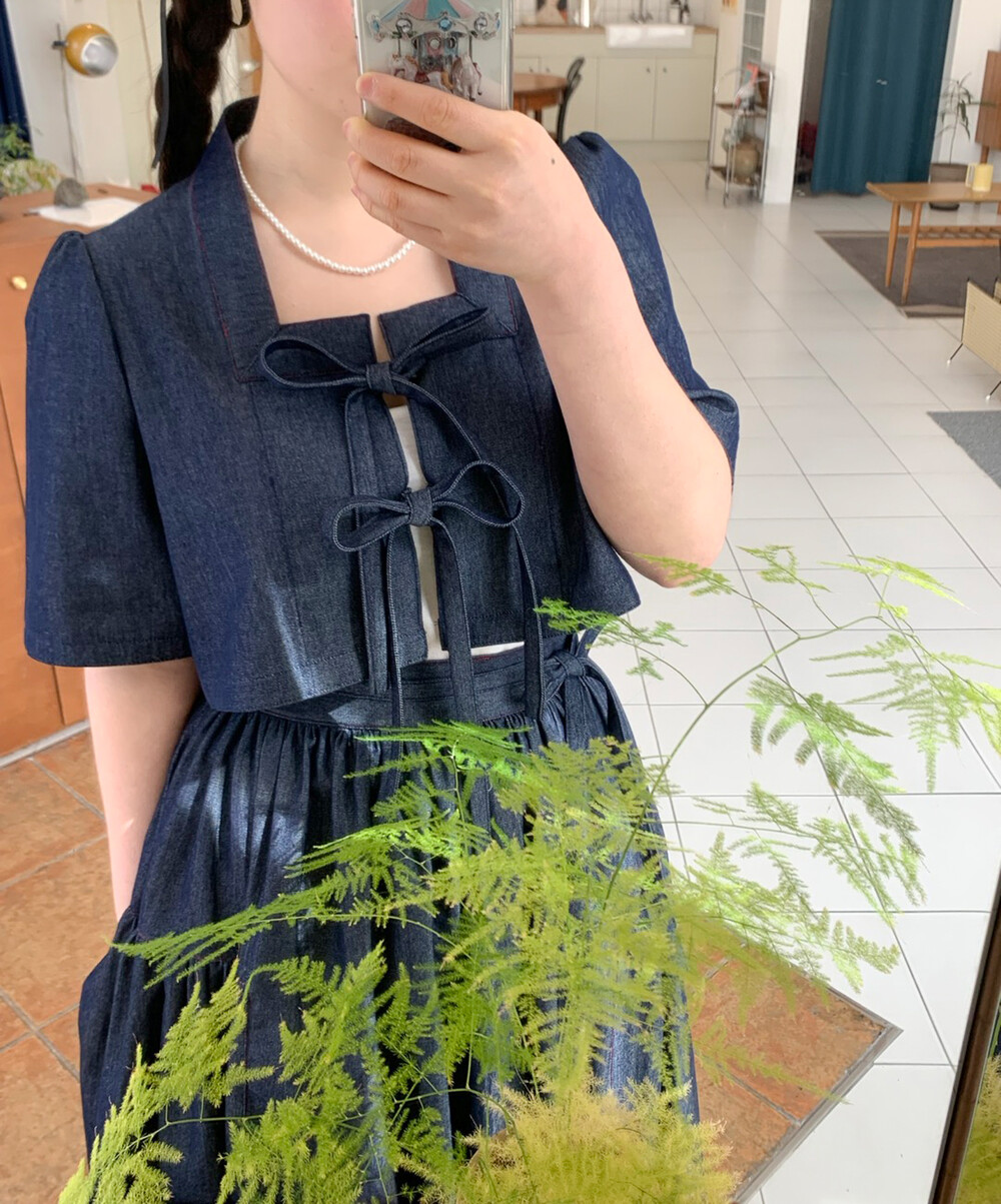 크롭 기장에 앞이 트여있어 리본으로 여미는 맞깃에 반팔 소매로 제작되어 레이어드
