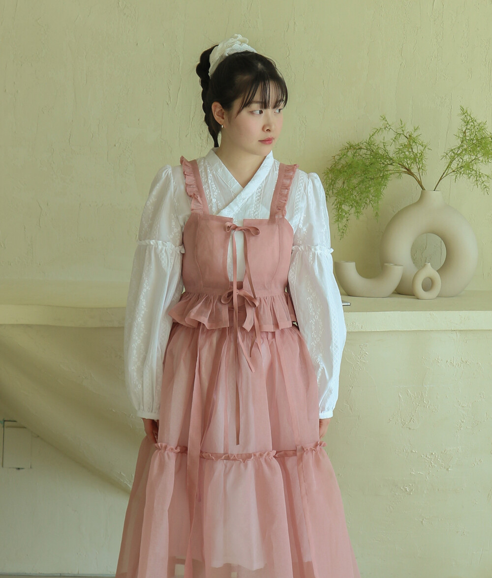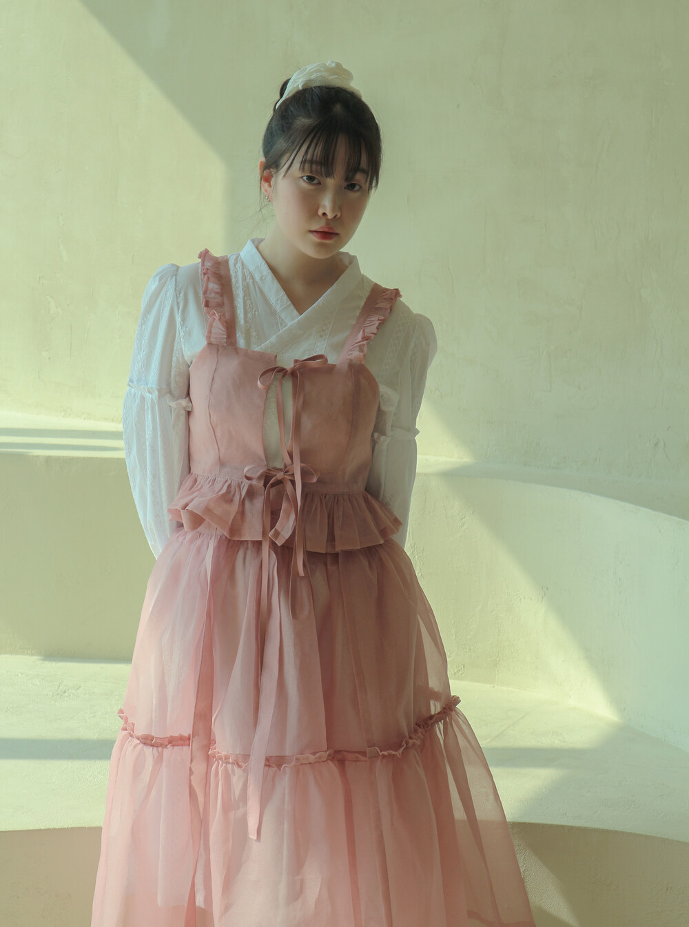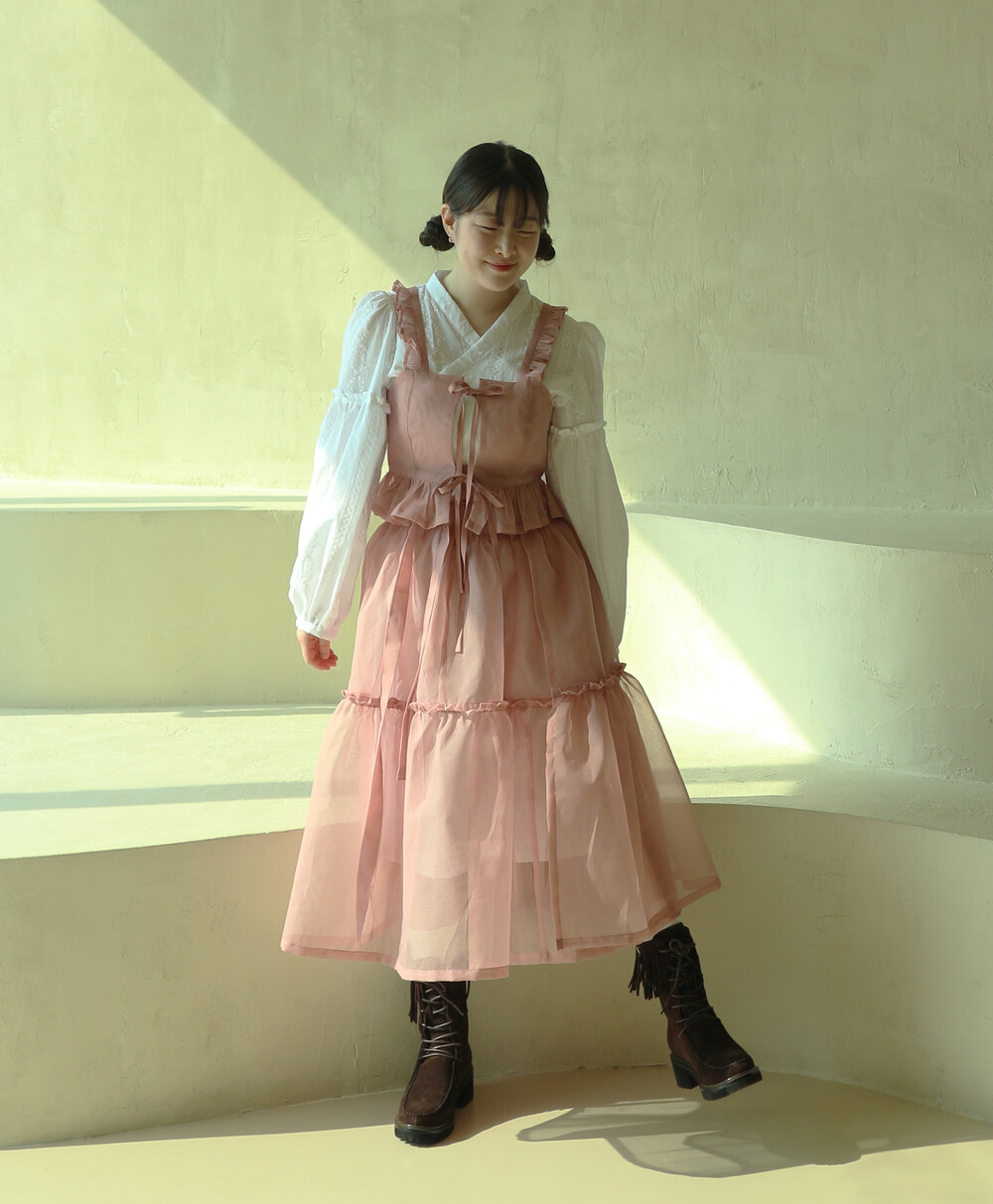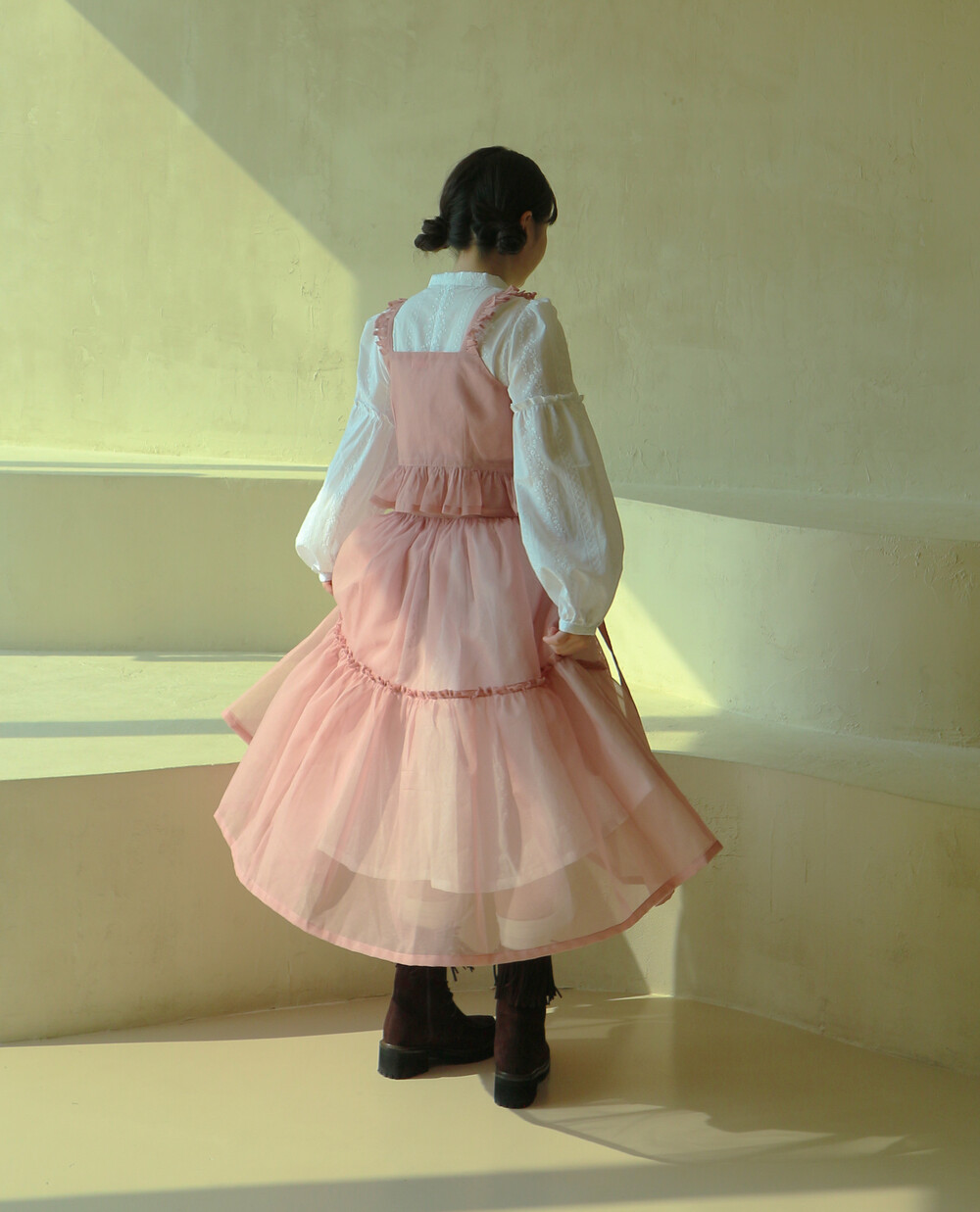 얇은 어깨끈에 프릴을 넣어서 장식하고, 아랫단에도 프릴을 달아 포인트를