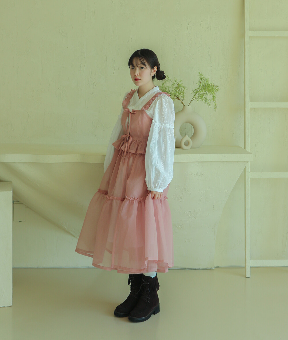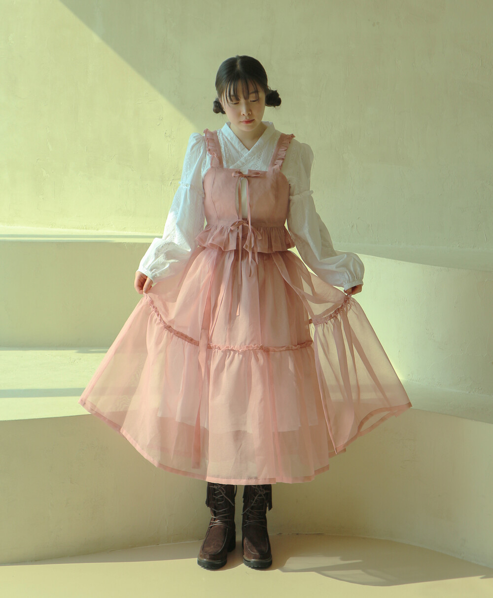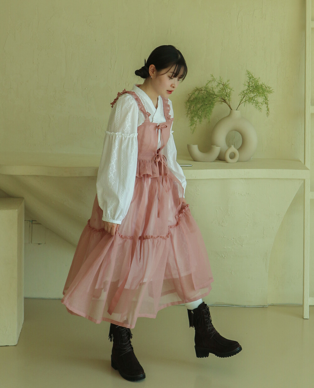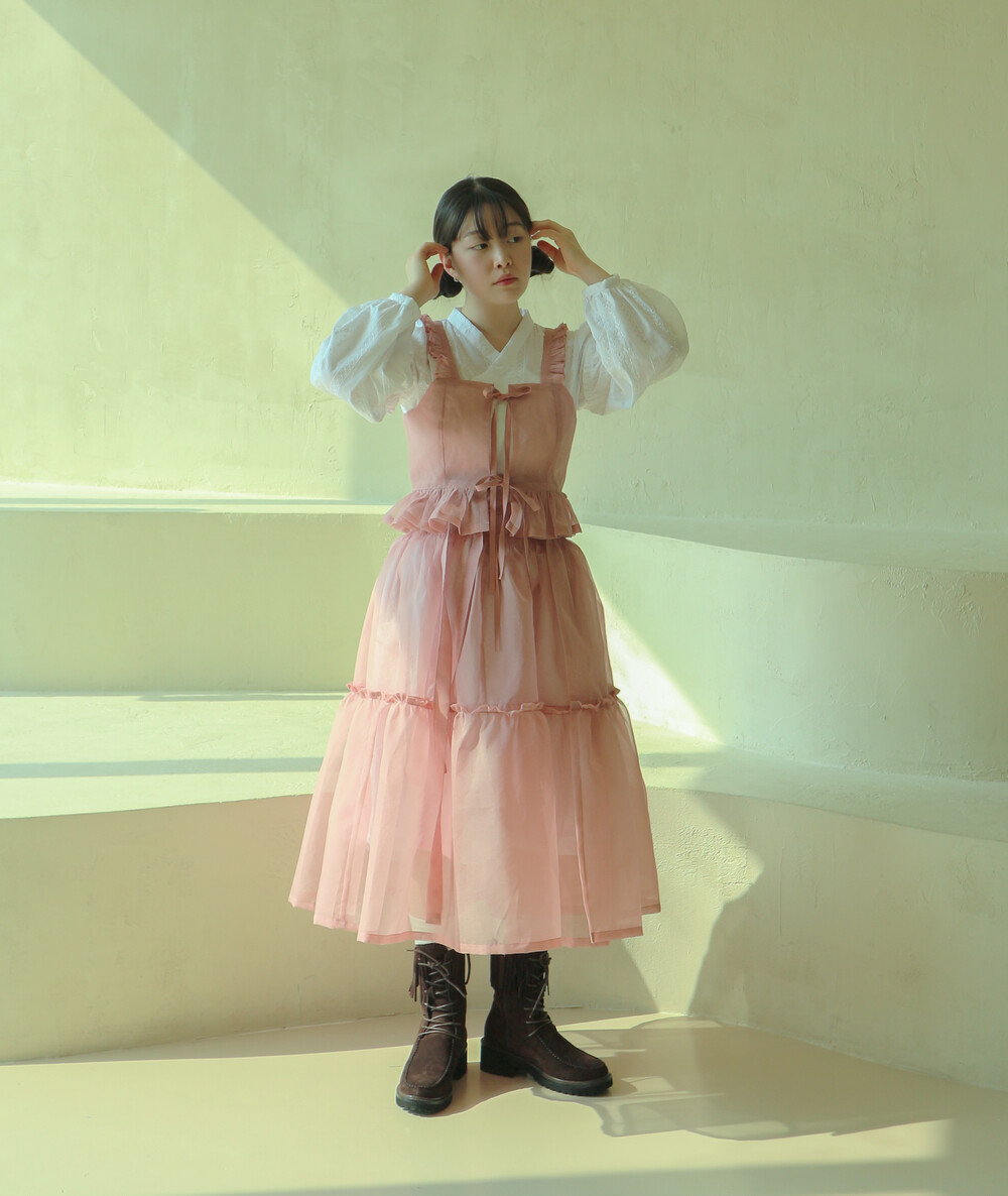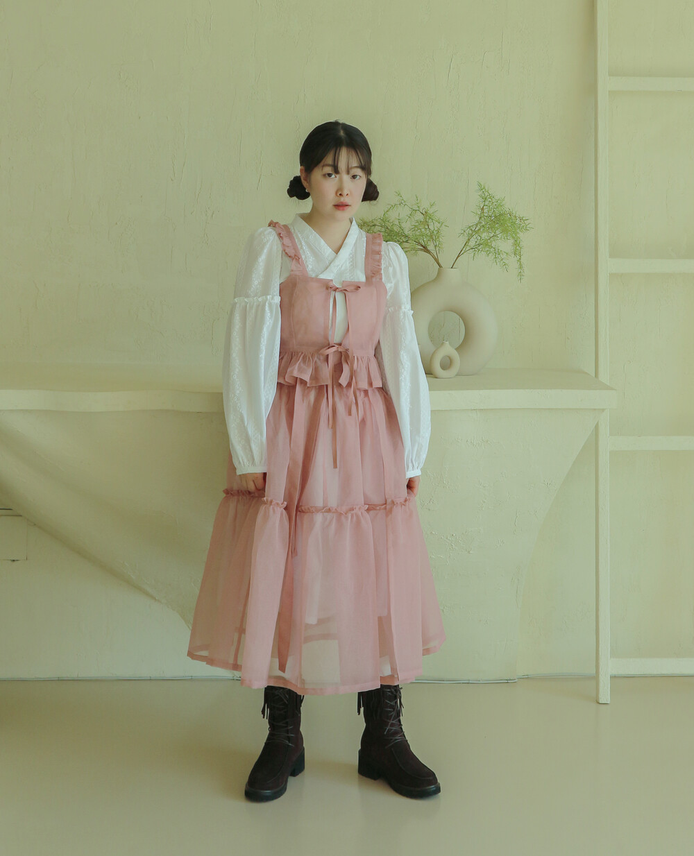 얇은 어깨끈에 프릴을 넣어서 장식하고, 아랫단에도 프릴을 달아 포인트를
