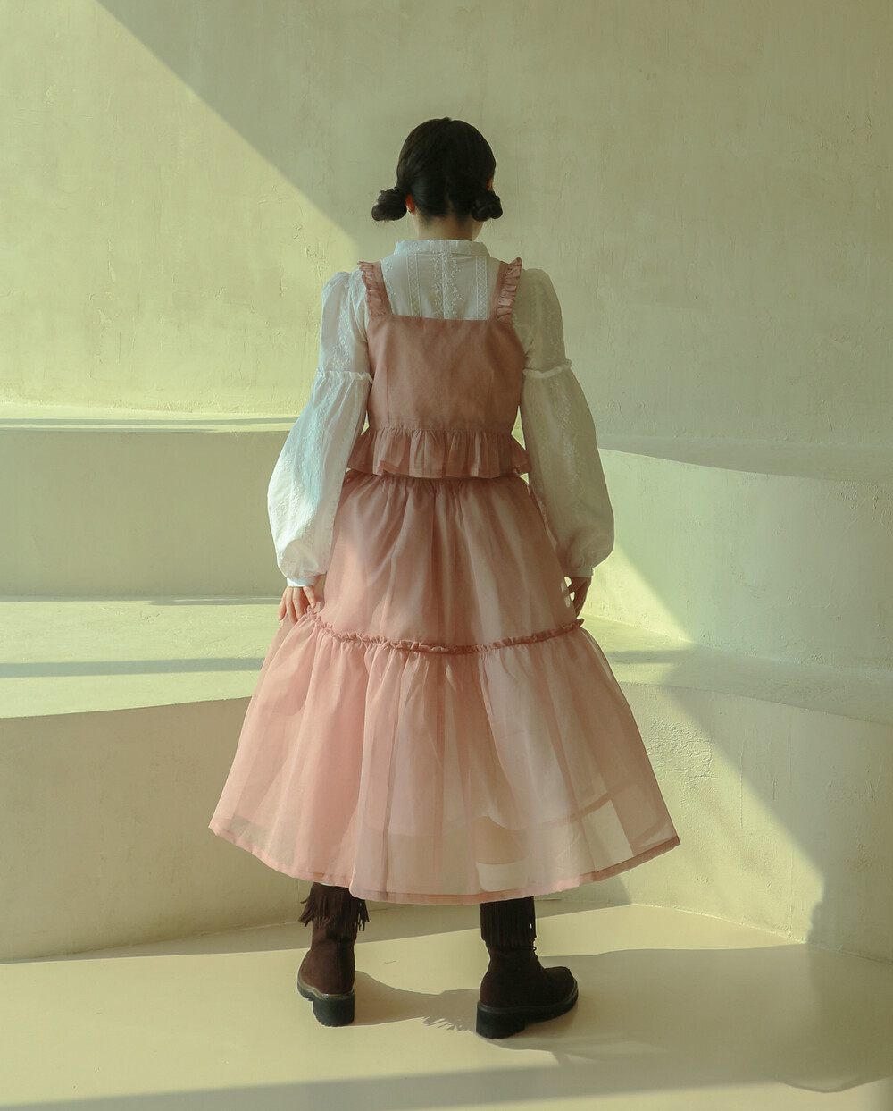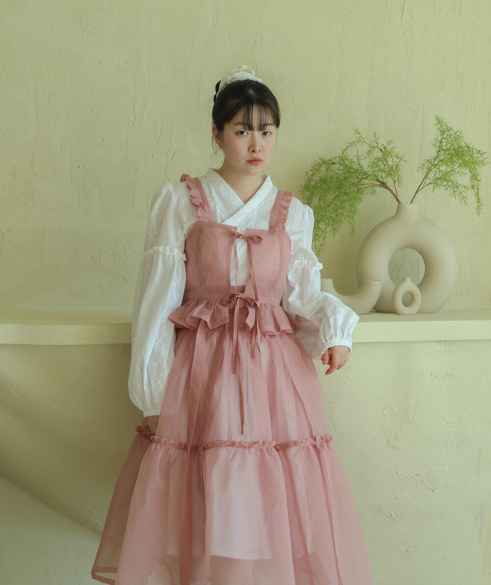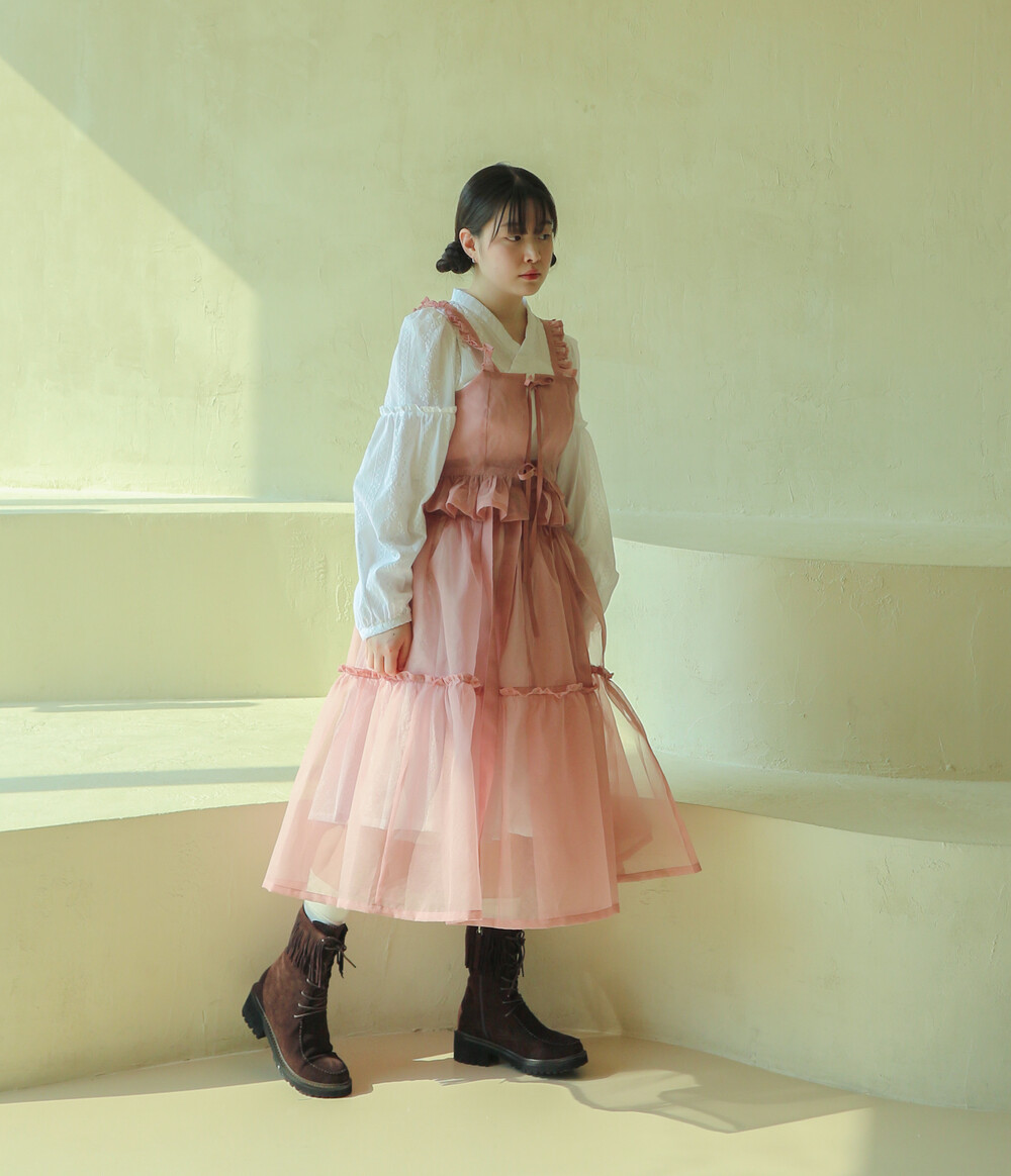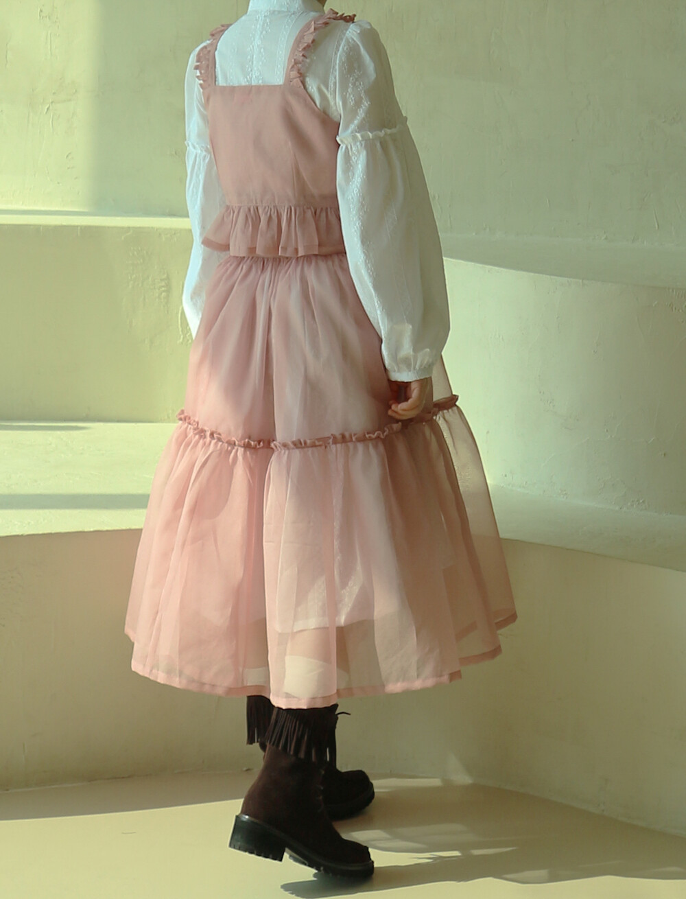 얇은 어깨끈에 프릴을 넣어서 장식하고, 아랫단에도 프릴을 달아 포인트를