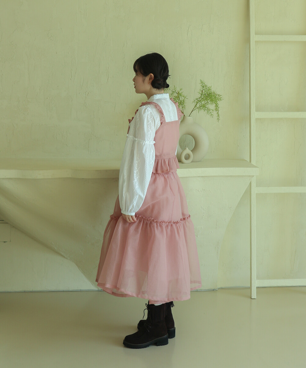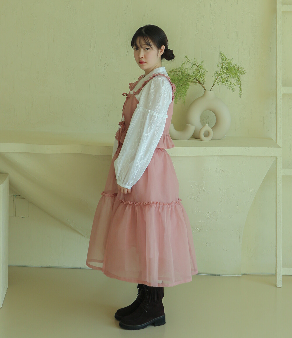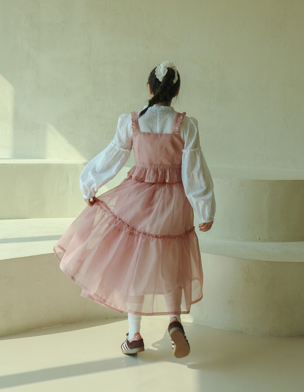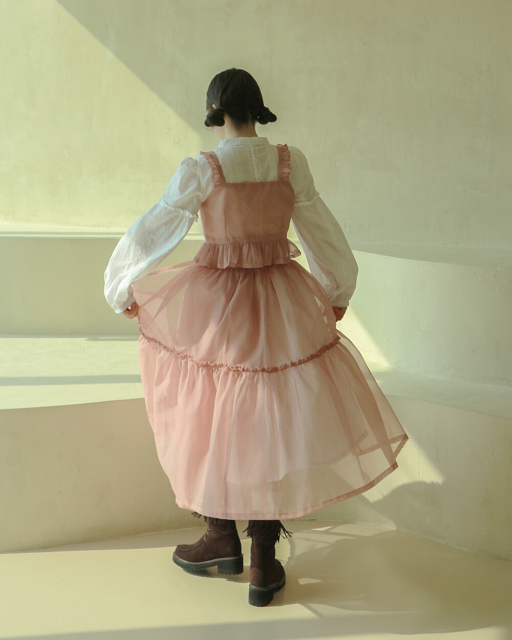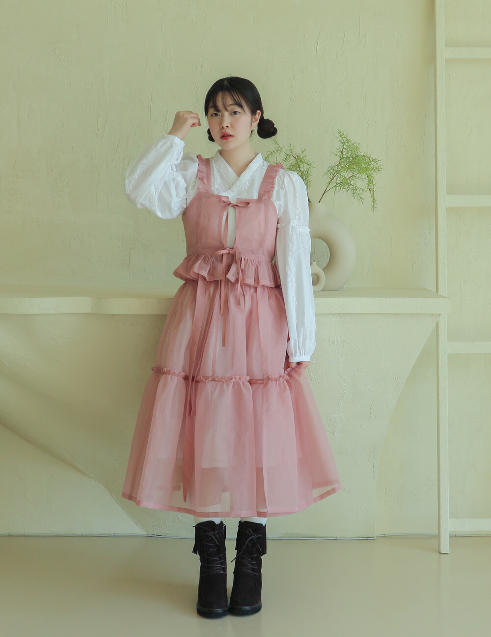 얇은 어깨끈에 프릴을 넣어서 장식하고, 아랫단에도 프릴을 달아 포인트를