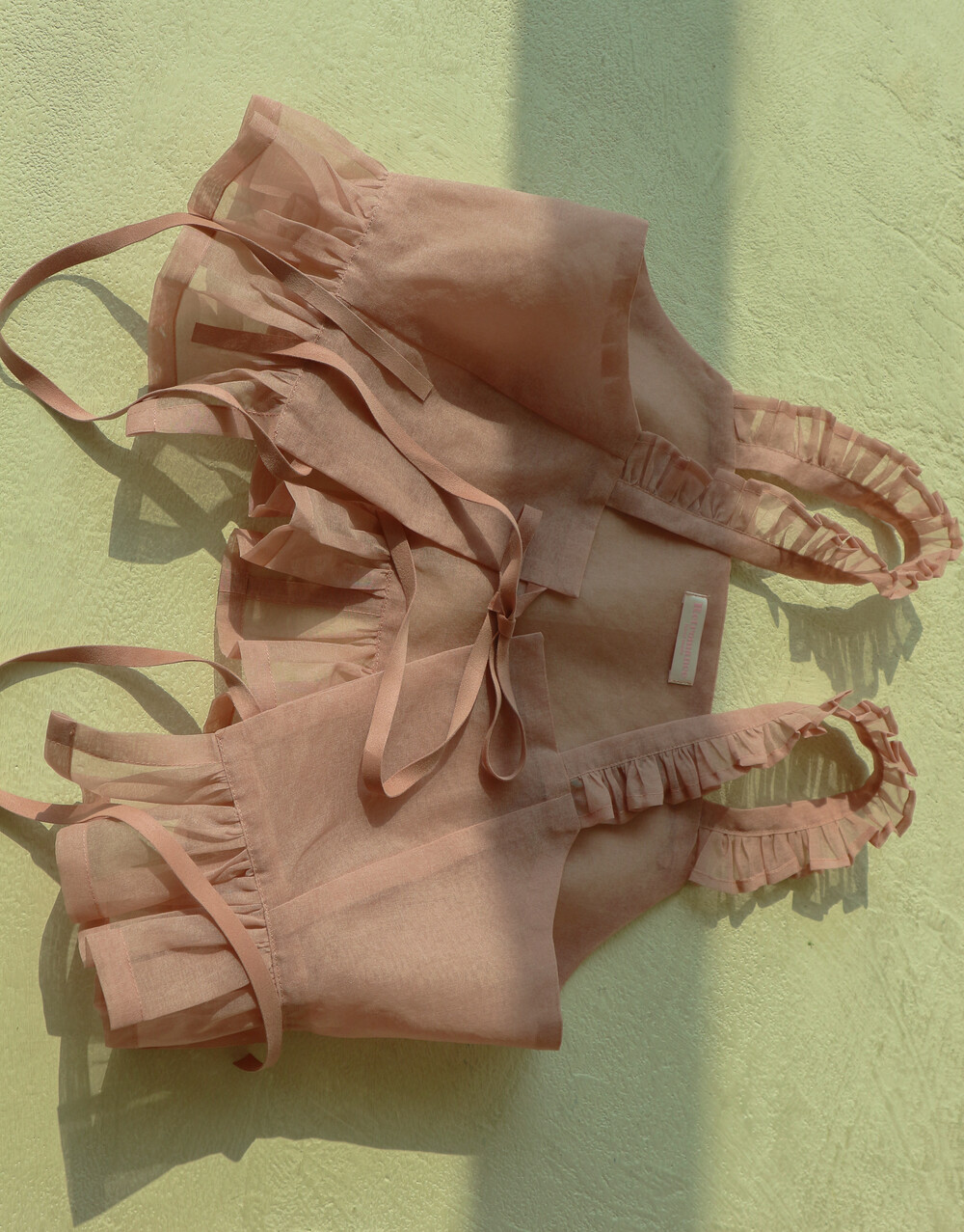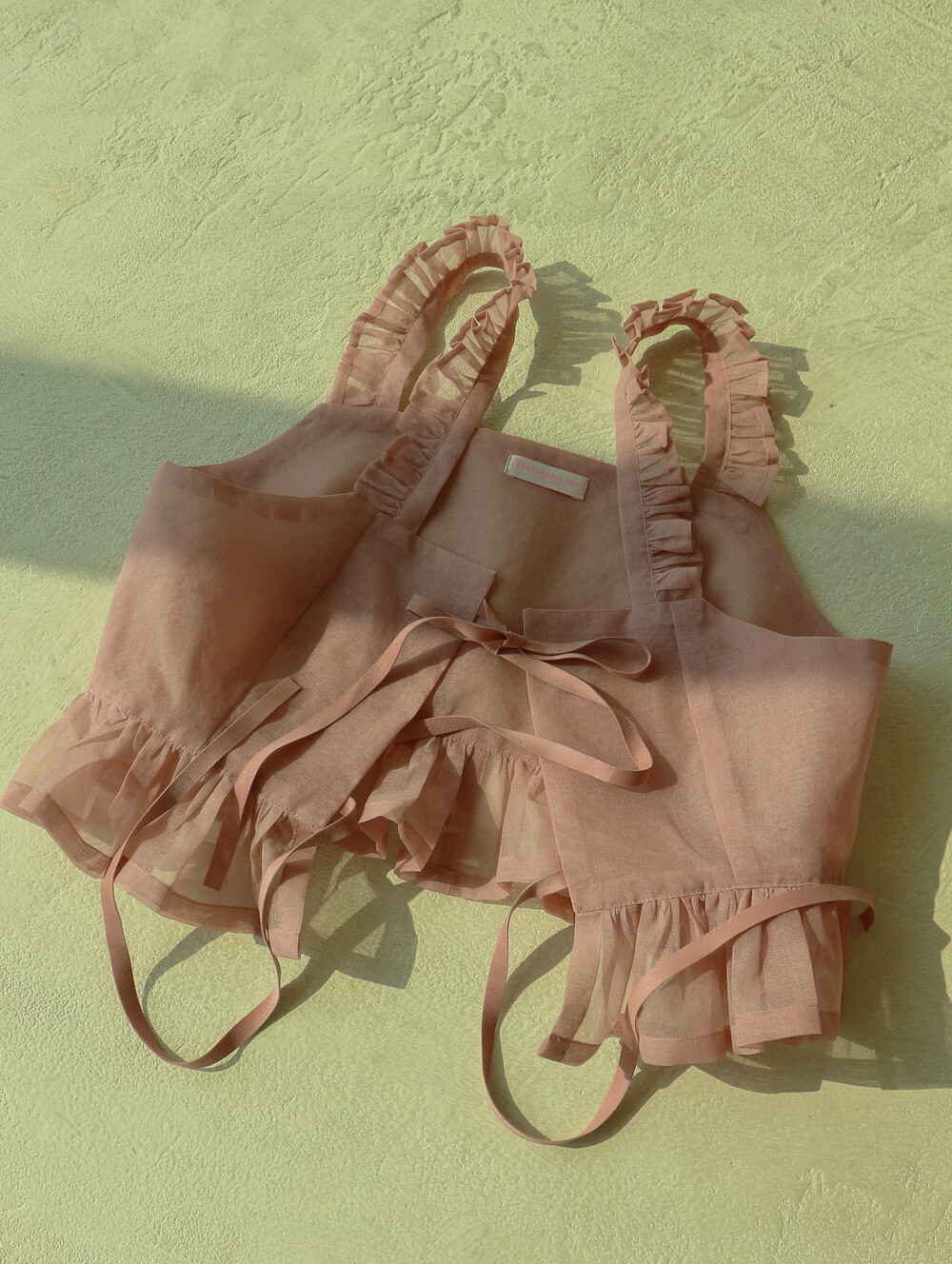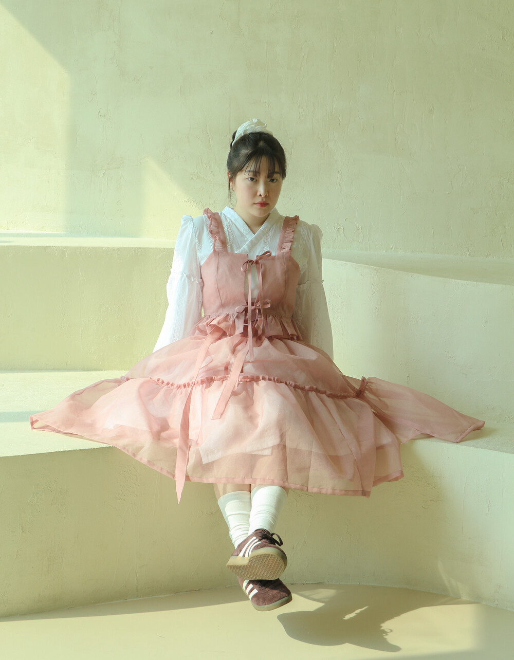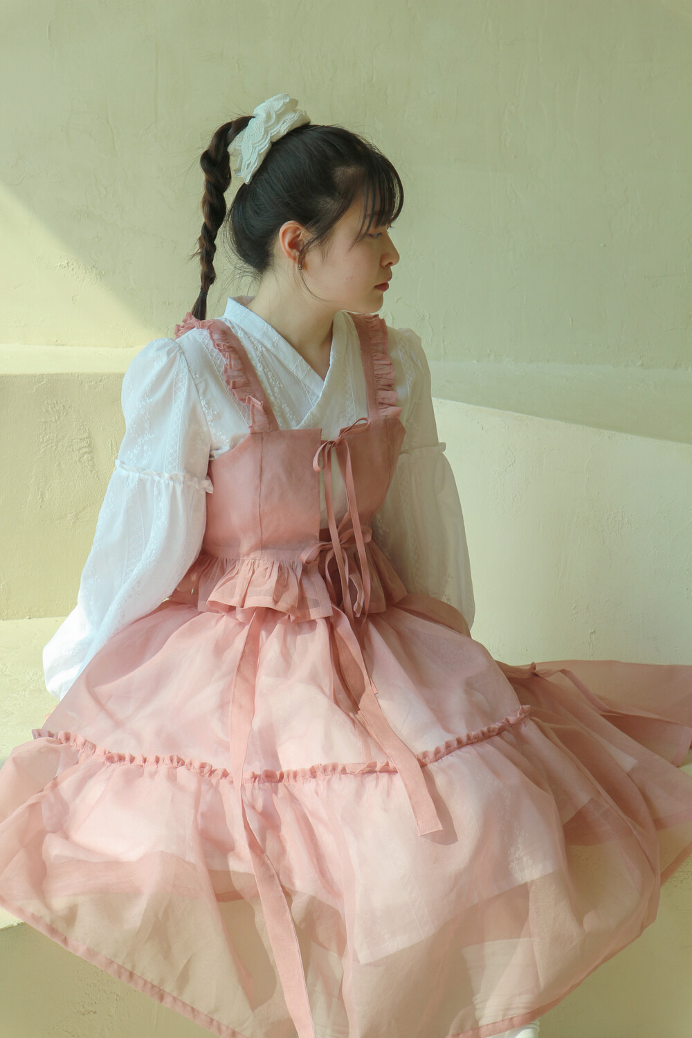 얇은 어깨끈에 프릴을 넣어서 장식하고, 아랫단에도 프릴을 달아 포인트를